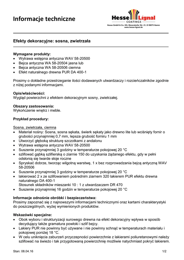 Informacje techniczne Hesse GmbH & Co. KG, Warendorfer Str. 21, D 59075 Hamm www.hesse-lignal.de Efekty dekoracyjne: sosna, zwietrzała Wymagane produkty: Wytrawa wstępna antyczna WAV 58-20500 Bejca antyczna WA 58-20504 jasna lub Bejca antyczna WA 58-20506 ciemna Efekt naturalnego drewna PUR DA 400-1 Prosimy o dokładne przestrzeganie ilości dodawanych utwardzaczy i rozcieńczalników zgodnie z niżej podanymi informacjami. Opis/właściwości: Wygląd powierzchni z efektem dekoracyjnym sosny, zwietrzałej. Obszary zastosowania: Wykończenie wnętrz i meble. Przykład procedury: Sosna, zwietrzała, ciemna Materiał nośny: Sosna, sosna sękata, świerk sękaty jako drewno lite lub wciśnięty fornir o grubości przynajmniej 0,7 mm, lepsza grubość forniru 1 mm Utworzyć głęboką strukturę szczotkami z andalonu Wytrawa wstępna antyczna WAV 58-20500 Suszenie przynajmniej 3 godziny w temperaturze pokojowej 20 °C szlifować gąbką szlifierską o ziarnie 150 do uzyskania żądanego efektu, gdy w pełni odsłonią się twarde słoje roczne Spryskać dobrze, tworząc wilgotną warstwę, 1 x bez rozprowadzania bejcą antyczną WAV 58-20506 Suszenie przynajmniej 3 godziny w temperaturze pokojowej 20 °C lakierować 2 x ze szlifowaniem pośrednim ziarnem 320 lakierem PUR efektu drewna naturalnego DA 400-1 Stosunek składników mieszanki 10 : 1 z utwardzaczem DR 470 Suszenie przynajmniej 16 godzin w temperaturze pokojowej 20 °C Informacje odnośnie obróbki i bezpieczeństwa: Prosimy zapoznać się z najnowszymi informacjami technicznymi oraz kartami charakterystyki do poszczególnych, wyżej wymienionych produktów. Wskazówki specjalne: Obok wyboru i strukturyzacji surowego drewna na efekt dekoracyjny wpływa w sposób decydujący także gramatura powłoki i szlif bejcy. Lakiery PUR nie powinny być używane i nie powinny schnąć w temperaturach materiału i pokojowej poniżej 18 °C. W celu uniknięcia zaburzeń przyczepności powierzchnie z lakierami poliuretanowymi należy szlifować na świeżo i tak przygotowaną powierzchnię możliwie natychmiast pokryć lakierem. Stan: 08.04.16 1/2 Informacje techniczne Hesse GmbH & Co. KG, Warendorfer Str. 21, D 59075 Hamm www.hesse-lignal.de Efekty dekoracyjne: sosna, zwietrzała Twardość końcowa powłoki lakierniczej zostaje osiągnięta przy prawidłowym magazynowaniu (temperatura pokojowa minimum 20 °C) po okresie jednego tygodnia. Utwardzone powłoki spełniają wymagania normy DIN 68861-1B (Powierzchnie mebli; właściwości przy obciążeniu chemicznym), normy DIN EN 71-3 (Bezpieczeństwo zabawek), jak również wcześniejszej normy DIN 53160 (Badanie odporności na ślinę i pot) i nie zawierają formaldehydu. Prosimy przeprowadzić lakierowanie próbne w warunkach praktycznych. Uwaga: Przedstawione informacje mają charakter doradczy, opierają się na najlepszej wiedzy i starannych badaniach, zgodnie z aktualnym stanem techniki. Informacje te nie mają charakteru prawnie wiążącego. Oprócz tego odsyłamy Państwa do naszych warunków handlowych. Karta charakterystyki zgodnie z dyrektywą 91/155/EWG zostanie udostępniona. Stan: 08.04.16 2/2