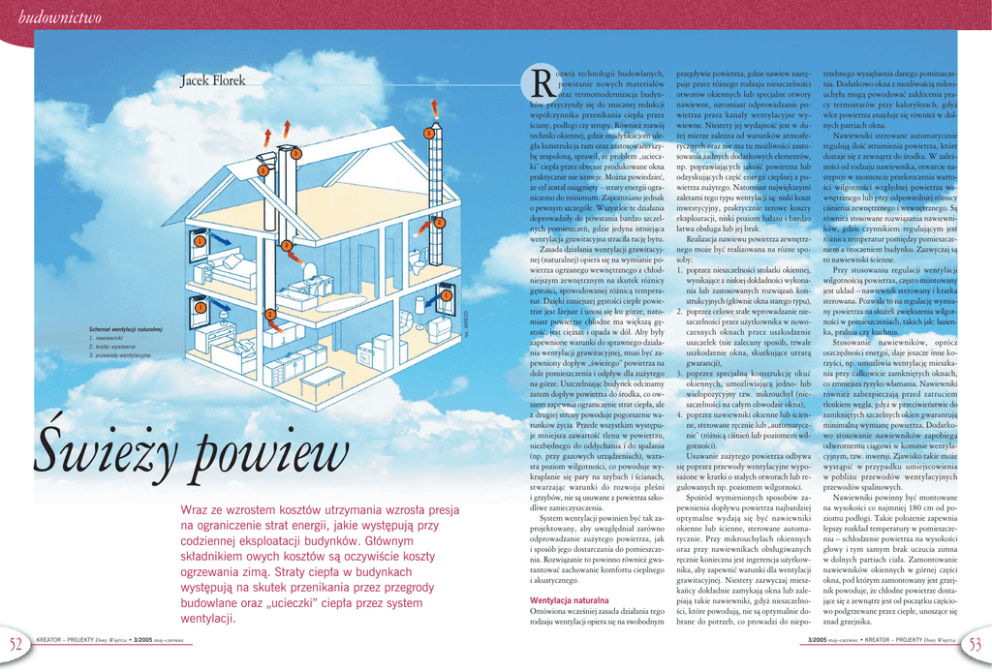 budownictwo R Jacek Florek 3 3 3 2 1 2 1 2 Schemat wentylacji naturalnej: 1. nawiewniki 2. kratki wywiewne 3. przewody wentylacyjne Świeży powiew Wraz ze wzrostem kosztów utrzymania wzrosła presja na ograniczenie strat energii, jakie występują przy codziennej eksploatacji budynków. Głównym składnikiem owych kosztów są oczywiście koszty ogrzewania zimą. Straty ciepła w budynkach występują na skutek przenikania przez przegrody budowlane oraz „ucieczki” ciepła przez system wentylacji. 52 KREATOR – PROJEKTY Domy Wnętrza • 3/2005 maj–czerwiec rys. AERECO 1 ozwój technologii budowlanych, powstanie nowych materiałów oraz termomodernizacja budynków przyczyniły się do znacznej redukcji współczynnika przenikania ciepła przez ściany, podłogi czy stropy. Również rozwój techniki okiennej, gdzie modyfikacjom uległa konstrukcja ram oraz zastosowano szybę zespoloną, sprawił, że problem „ucieczki” ciepła przez obecnie produkowane okna praktycznie nie istnieje. Można powiedzieć, że cel został osiągnięty – straty energii ograniczono do minimum. Zapomniano jednak o pewnym szczególe. Wszystkie te działania doprowadziły do powstania bardzo szczelnych pomieszczeń, gdzie jedyna istniejąca wentylacja grawitacyjna straciła rację bytu. Zasada działania wentylacji grawitacyjnej (naturalnej) opiera się na wymianie powietrza ogrzanego wewnętrznego z chłodniejszym zewnętrznym na skutek różnicy gęstości, spowodowanej różnicą temperatur. Dzięki mniejszej gęstości ciepłe powietrze jest lżejsze i unosi się ku górze, natomiast powietrze chłodne ma większą gęstość, jest cięższe i opada w dół. Aby były zapewnione warunki do sprawnego działania wentylacji grawitacyjnej, musi być zapewniony dopływ „świeżego” powietrza na dole pomieszczenia i odpływ dla zużytego na górze. Uszczelniając budynek odcinamy zatem dopływ powietrza do środka, co owszem zapewnia ograniczenie strat ciepła, ale z drugiej strony powoduje pogorszenie warunków życia. Przede wszystkim występuje mniejsza zawartość tlenu w powietrzu, niezbędnego do oddychania i do spalania (np. przy gazowych urządzeniach), wzrasta poziom wilgotności, co powoduje wykraplanie się pary na szybach i ścianach, stwarzając warunki do rozwoju pleśni i grzybów, nie są usuwane z powietrza szkodliwe zanieczyszczenia. System wentylacji powinien być tak zaprojektowany, aby uwzględniał zarówno odprowadzanie zużytego powietrza, jak i sposób jego dostarczania do pomieszczenia. Rozwiązanie to powinno również gwarantować zachowanie komfortu cieplnego i akustycznego. Wentylacja naturalna Omówiona wcześniej zasada działania tego rodzaju wentylacji opiera się na swobodnym przepływie powietrza, gdzie nawiew następuje przez różnego rodzaju nieszczelności otworów okiennych lub specjalne otwory nawiewne, natomiast odprowadzanie powietrza przez kanały wentylacyjne wywiewne. Niestety jej wydajność jest w dużej mierze zależna od warunków atmosferycznych oraz nie ma tu możliwości zastosowania żadnych dodatkowych elementów, np. poprawiających jakość powietrza lub odzyskujących część energii cieplnej z powietrza zużytego. Natomiast największymi zaletami tego typu wentylacji są: niski koszt inwestycyjny, praktycznie zerowe koszty eksploatacji, niski poziom hałasu i bardzo łatwa obsługa lub jej brak. Realizacja nawiewu powietrza zewnętrznego może być realizowana na różne sposoby: 1. poprzez nieszczelności stolarki okiennej, wynikające z niskiej dokładności wykonania lub zastosowanych rozwiązań konstrukcyjnych (głównie okna starego typu), 2. poprzez celowe stałe wprowadzanie nieszczelności przez użytkownika w nowoczesnych oknach przez uszkodzenie uszczelek (nie zalecany sposób, trwałe uszkodzenie okna, skutkujące utratą gwarancji), 3. poprzez specjalną konstrukcję okuć okiennych, umożliwiającą jedno- lub wielopozycyjny tzw. mikrouchył (nieszczelności na całym obwodzie okna), 4. poprzez nawiewniki okienne lub ścienne, sterowane ręcznie lub „automatycznie” (różnicą ciśnień lub poziomem wilgotności). Usuwanie zużytego powietrza odbywa się poprzez przewody wentylacyjne wyposażone w kratki o stałych otworach lub regulowanych np. poziomem wilgotności. Spośród wymienionych sposobów zapewnienia dopływu powietrza najbardziej optymalne wydają się być nawiewniki okienne lub ścienne, sterowane automatycznie. Przy mikrouchyłach okiennych oraz przy nawiewnikach obsługiwanych ręcznie konieczna jest ingerencja użytkownika, aby zapewnić warunki dla wentylacji grawitacyjnej. Niestety zazwyczaj mieszkańcy dokładnie zamykają okna lub zalepiają takie nawiewniki, gdyż nieszczelności, które powodują, nie są optymalnie dobrane do potrzeb, co prowadzi do niepo- trzebnego wyziębienia danego pomieszczenia. Dodatkowo okna z możliwością mikrouchyłu mogą powodować zakłócenia pracy termostatów przy kaloryferach, gdyż wlot powietrza znajduje się również w dolnych partiach okna. Nawiewniki sterowane automatycznie regulują ilość strumienia powietrza, które dostaje się z zewnątrz do środka. W zależności od rodzaju nawiewnika, otwarcie następuje w momencie przekroczenia wartości wilgotności względnej powietrza wewnętrznego lub przy odpowiedniej różnicy ciśnienia zewnętrznego i wewnętrznego. Są również stosowane rozwiązania nawiewników, gdzie czynnikiem regulującym jest różnica temperatur pomiędzy pomieszczeniem a otoczeniem budynku. Zazwyczaj są to nawiewniki ścienne. Przy stosowaniu regulacji wentylacji wilgotnością powietrza, często montowany jest układ – nawiewnik sterowany i kratka sterowana. Pozwala to na regulację wymiany powietrza na skutek zwiększenia wilgotności w pomieszczeniach, takich jak: łazienka, pralnia czy kuchnia. Stosowanie nawiewników, oprócz oszczędności energii, daje jeszcze inne korzyści, np. umożliwia wentylację mieszkania przy
