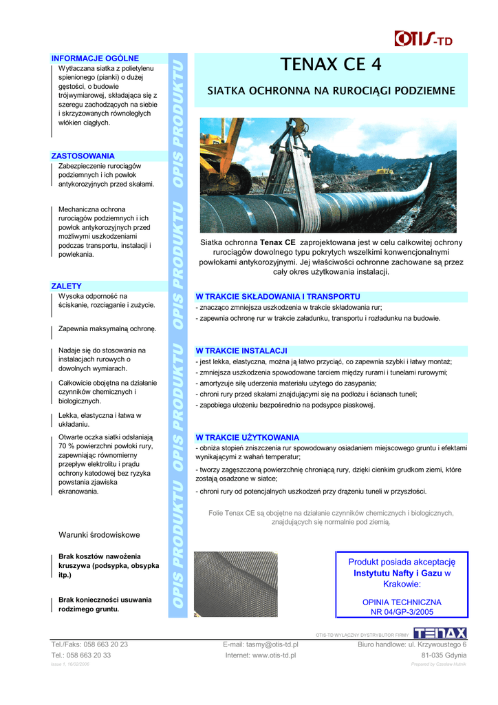 Zabezpieczenie rurociągów podziemnych i ich powłok antykorozyjnych przed skałami. Mechaniczna ochrona rurociągów podziemnych i ich powłok antykorozyjnych przed możliwymi uszkodzeniami podczas transportu, instalacji i powlekania. ZALETY Wysoka odporność na ściskanie, rozciąganie i zużycie. Zapewnia maksymalną ochronę. Nadaje się do stosowania na instalacjach rurowych o dowolnych wymiarach. Całkowicie obojętna na działanie czynników chemicznych i biologicznych. Lekka, elastyczna i łatwa w układaniu. Otwarte oczka siatki odsłaniają 70 % powierzchni powłoki rury, zapewniając równomierny przepływ elektrolitu i prądu ochrony katodowej bez ryzyka powstania zjawiska ekranowania. Warunki środowiskowe Brak kosztów nawożenia kruszywa (podsypka, obsypka itp.) Brak konieczności usuwania rodzimego gruntu. OPIS PRODUKTU ZASTOSOWANIA OPIS PRODUKTU Wytłaczana siatka z polietylenu spienionego (pianki) o dużej gęstości, o budowie trójwymiarowej, składająca się z szeregu zachodzących na siebie i skrzyżowanych równoległych włókien ciągłych. OPIS PRODUKTU OPIS PRODUKTU INFORMACJE OGÓLNE TENAX CE 4 SIATKA OCHRONNA NA RUROCIĄGI PODZIEMNE Siatka ochronna Tenax CE zaprojektowana jest w celu całkowitej ochrony rurociągów dowolnego typu pokrytych wszelkimi konwencjonalnymi powłokami antykorozyjnymi. Jej właściwości ochronne zachowane są przez cały okres użytkowania instalacji. W TRAKCIE SKŁADOWANIA I TRANSPORTU - znacząco zmniejsza uszkodzenia w trakcie składowania rur; - zapewnia ochronę rur w trakcie załadunku, transportu i rozładunku na budowie. W TRAKCIE INSTALACJI - jest lekka, elastyczna, można ją łatwo przyciąć, co zapewnia szybki i łatwy montaż; - zmniejsza uszkodzenia spowodowane tarciem między rurami i tunelami rurowymi; - amortyzuje siłę uderzenia materiału użytego do zasypania; - chroni rury przed skałami znajdującymi się na podłożu i ścianach tuneli; - zapobiega ułożeniu bezpośrednio na podsypce piaskowej. W TRAKCIE UŻYTKOWANIA - obniża stopień zniszczenia rur spowodowany osiadaniem miejscowego gruntu i efektami wynikającymi z wahań temperatur; - tworzy zagęszczoną powierzchnię chroniącą rury, dzięki cienkim grudkom ziemi, które zostają osadzone w siatce; - chroni rury od potencjalnych uszkodzeń przy drążeniu tuneli w przyszłości. Folie Tenax CE są obojętne na działanie czynników chemicznych i biologicznych, znajdujących się normalnie pod ziemią. Produkt posiada akceptację Instytutu Nafty i Gazu w Krakowie: OPINIA TECHNICZNA NR 04/GP-3/2005 OTIS-TD WYŁĄCZNY DYSTRYBUTOR FIRMY Tel./Faks: 058 663 20 23 Tel.: 058 663 20 33 Issue 1, 16/02/2006 E-mail: [email protected] Internet: www.otis-td.pl Biuro handlowe: ul. Krzywoustego 6 81-035 Gdynia Prepared by Czesław Hutnik DANE TECHNICZNE DANE TECHICZNE DANE TECHNICZNE DANE TECHNICZNE SPECYFIKACJA PRODUKTU Wytłaczana siatka do ochrony przed skałami, z polietylenu spienionego (pianki) o dużej gęstości (HDPE) z oczkami w kształcie rombu, o budowie trójwymiarowej, składająca się z dwóch (CE 4) szeregów zachodzących na siebie i skrzyżowanych równoległych włókien ciągłych. Powłoki Tenax CE gwarantują całkowitą obojętność na czynniki chemiczne, nieprzepuszczalność mikroorganizmów, obojętność na działanie czynników atmosferycznych i słonej wody, a także stabilność w przypadku działania promieni UV. Produkty dostarczane są w rolkach, w sposób podany w Tabeli 1 i całkowicie spełniają następujące specyfikacje: 1.200 g/m2 • stabilizator UV • grubość (ISO 9863) - czarny węgiel 6 mm • grubość resztkowa przy 10 kg/cm2 = 1.000 kPa 70 % • grubość resztkowa po próbie udarności (e = 10 J) 50 % • masa jednostkowa (ISO 9864) 11 X 10 mm • wytrzymałość na rozciąganie MD(1) (ISO 10319) 600 kg/m • granica plastyczności przy wydłużeniu (ISO 10319) 50 % • dodana odporność na uderzenia 6 Nm (wg DIN 30672) • podziałka (wymiar podłużny x poprzeczny) Tabela 1 - Rodzaje Tenax CE 4 Rodzaj Szerokość rolki [m] Długość rolki [m] CE 400 CE 402 CE 403 CE 405 CE 406 CE 408 1,50 20 1,20 20 1,00 20 0,50 20 0,40 20 0,60 20 TECHNOLOGIA NAKŁADANIA W przypadku rur o obwodzie mniejszym niż 15 cm w porównaniu z wysokością siatki (rys. A). 1) Położyć i rozwinąć siatkę równolegle do rury, która ma być chroniona. 2) Umieścić siatkę pod rurą. 3) Owinąć rurę siatką, stosując zakładkę (ok. 15 cm) na krawędziach. 4) Zamocować siatkę przy pomocy plastikowych opasek lub poprzez ogrzanie. W przypadku rur o dużym obwodzie (rys. B): 1) Pociąć taśmę na części o 15 cm większe niż obwód rury. 2) Owinąć rurę taśmą, tworząc 15 cm zakładki na taśmie zamocowanej uprzednio. 3) Zamocować siatkę przy pomocy plastikowych opasek lub poprzez ogrzanie. W formie „przykrycia” 1) Rozwinąć siatkę równolegle do uprzednio zakopanej rury, która ma zostać zabezpieczona. 2) Położyć siatkę na rurze, tak aby pokryła górną część jej obwodu. 3) Kontynuować zakopywanie rury zabezpieczonej w ten sposób. OTIS-TD WYŁĄCZNY DYSTRYBUTOR FIRMY Tel./Faks: 058 663 20 23 Tel.: 058 663 20 33 Issue 1, 16/02/2006 E-mail: [email protected] Internet: www.otis-td.pl Biuro handlowe: ul. Krzywoustego 6 81-035 Gdynia Prepared by Czesław Hutnik