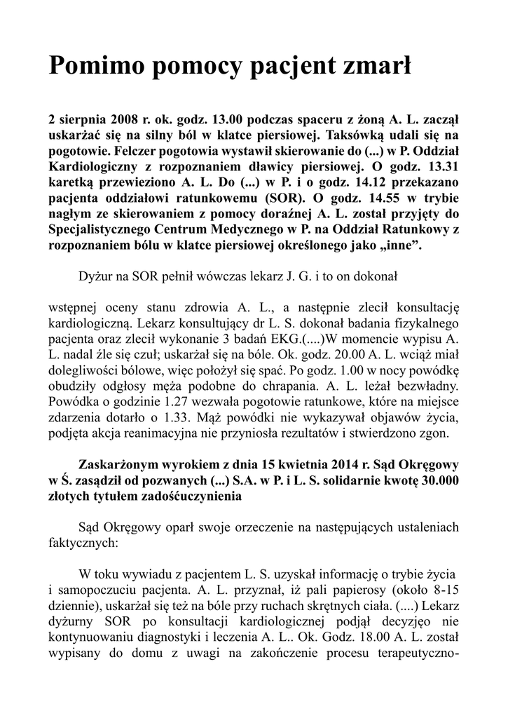 Pomimo pomocy pacjent zmarł 2 sierpnia 2008 r. ok. godz. 13.00 podczas spaceru z żoną A. L. zaczął uskarżać się na silny ból w klatce piersiowej. Taksówką udali się na pogotowie. Felczer pogotowia wystawił skierowanie do (...) w P. Oddział Kardiologiczny z rozpoznaniem dławicy piersiowej. O godz. 13.31 karetką przewieziono A. L. Do (...) w P. i o godz. 14.12 przekazano pacjenta oddziałowi ratunkowemu (SOR). O godz. 14.55 w trybie nagłym ze skierowaniem z pomocy doraźnej A. L. został przyjęty do Specjalistycznego Centrum Medycznego w P. na Oddział Ratunkowy z rozpoznaniem bólu w klatce piersiowej określonego jako „inne”. Dyżur na SOR pełnił wówczas lekarz J. G. i to on dokonał wstępnej oceny stanu zdrowia A. L., a następnie zlecił konsultację kardiologiczną. Lekarz konsultujący dr L. S. dokonał badania fizykalnego pacjenta oraz zlecił wykonanie 3 badań EKG.(....)W momencie wypisu A. L. nadal źle się czuł; uskarżał się na bóle. Ok. godz. 20.00 A. L. wciąż miał dolegliwości bólowe, więc położył się spać. Po godz. 1.00 w nocy powódkę obudziły odgłosy męża podobne do chrapania. A. L. leżał bezwładny. Powódka o godzinie 1.27 wezwała pogotowie ratunkowe, które na miejsce zdarzenia dotarło o 1.33. Mąż powódki nie wykazywał objawów życia, podjęta akcja reanimacyjna nie przyniosła rezultatów i stwierdzono zgon. Zaskarżonym wyrokiem z dnia 15 kwietnia 2014 r. Sąd Okręgowy w Ś. zasądził od pozwanych (...) S.A. w P. i L. S. solidarnie kwotę 30.000 złotych tytułem zadośćuczynienia Sąd Okręgowy oparł swoje orzeczenie na następujących ustaleniach faktycznych: W toku wywiadu z pacjentem L. S. uzyskał informację o trybie życia i samopoczuciu pacjenta. A. L. przyznał, iż pali papierosy (około 8-15 dziennie), uskarżał się też na bóle przy ruchach skrętnych ciała. (....) Lekarz dyżurny SOR po konsultacji kardiologicznej podjął decyzjęo nie kontynuowaniu diagnostyki i leczenia A. L.. Ok. Godz. 18.00 A. L. został wypisany do domu z uwagi na zakończenie procesu terapeutyczno- diagnostycznego z zaleceniami dalszej kontroli w Poradni Kardiologicznej, zażywania leków w postaci polopiryny, bisoprololu 5 mg. Lekarz dyżurujący stwierdził, że badania nie wykazały enzymów zawałowych, stan zdrowia pacjenta jest zadowalający, nie budzący zastrzeżeń, czy obaw. Niestety po przybyciu do domu pacjent zmarł. Przeprowadzone u A. L. badanie sekcyjne wykazało duże zmiany miażdżycowe naczyń tętniczych i średniego stopnia zmiany miażdżycowe aorty i naczyń mózgowych, otłuszczenie serca, rozległe blizny pozawałowe w mięśniu sercowym i świeży zawał mięśnia sercowego potwierdzony badaniem histopatologicznym, rozstrzeń serca niewielkiego stopnia, rozedmę brzeżną płuc, cechy śmierci nagłej − płynną krew, cechy ostrej niewydolności krążenia pod postacią obrzęku mózgu i płuc, ranki po iniekcjach, na kończynach górnych, stan po defibrylacji, blizny w powłokach brzusznych i na kończynach dolnych, złamanie żebra V lewego (najprawdopodobniej po masażu zewnętrznym serca). We krwi i moczu nie stwierdzono obecności alkoholu etylowego. (...) Przyczyną nagłej i chorobowej śmierci − A. L. był świeży zawał mięśnia sercowego, jako następstwo nierozpoznanej dusznicy bolesnej. Sąd Okręgowy ustalił , iż postępowania lekarskie diagnostyczne oraz w konsekwencji terapeutyczne i decyzyjne wobec A. L. w dniu 2 sierpnia 2008 r. przez lekarza dyżurnego (...) P. oraz konsultanta kardiologa L. S. było nacechowane brakiem odpowiedniego krytycyzmu i wymaganym w takich przypadkach ostrożności, niezgodne z obowiązującym normatywem postępowania lekarskiego w tego rodzaju przypadkach klinicznych i w konsekwencji wyczerpywało znamiona błędu medycznego. Istotą nieprawidłowości była zła ocena stanu klinicznego chorego i zdecydowanie przedwczesne i nieusprawiedliwione zakończenie procesu diagnostycznego i odesłanie go do domu w niepewnej i nie w pełni jasnej diagnostycznie sytuacji. W oparciu o tak ustalone okoliczności faktyczne Sąd Okręgowy uznał powództwo za częściowo zasadne.(...) Wszystkie wskazane wyżej okoliczności przemawiały, w ocenie sądu, za przyjęciem, że do feralnego zdarzenia z udziałem męża powódki doszło wskutek działań pozwanych noszących znamiona winy. Zdaniem Sądu Okręgowego, zdatna do wykazania braku uchybień w procesie leczniczym A. L. byłaby opinia biegłego, jednakże taki wniosek dowodowy nie został skutecznie złożony, bowiem strona pozwana taki wniosek cofnęła. Sąd I instancji określił sumę należnego powódce zadośćuczynienia na łączną kwotę 30.000 zł, uznając, że stanowić będzie właściwą rekompensatę za cierpienia psychiczne, jakich doznała powódka w związku ze śmiercią męża. Jako nieudowodnione Sąd uznał z kolei roszczenie zasądzenia odszkodowania z tytułu pogorszenia się sytuacji życiowej powódki oraz przyznania renty miesięcznej. Żona zmarłego pacjenta zaskarżyła wyrok w części oddalającej powództwo ponad kwotę 30.000 złotych i wniosła o jego zmianę poprzez zasądzenie kwoty 60.000 złotych lub o uchylenie zaskarżonego wyroku i przekazanie sprawy do ponownego rozpoznania. Jednocześnie wskazała, że ogranicza żądanie pozwu do kwoty 75.100 zł. W uzasadnieniu apelacji wskazała, że zasadniczo zgadza się z treścią wyroku, jednakże kwotę 30.000 zł uznaje za rażąco niską. Sąd Apelacyjny zważył, co następuje: Na wstępie wskazać należy, że roszczenia odszkodowawcze powódki zostały w całości oddalone, a rozstrzygnięcie w tym zakresie nie zostało przez nią zaskarżone, zatem w tej części wyrok Sądu I instancji jest prawomocny. Przedmiotem apelacji było orzeczenie co do zadośćuczynienia za szkodę niemajątkową, jakiej doznała w wyniku śmierci męża A. L.. Rozpoznając zatem apelacje stron we wskazanym zakresie, za zasadne nale