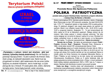 Nr 67 POLACY, RODACY ! CZYTAJCIE I OCENIAJCIE 18.06 2015 rok Bezpłatny Biuletyn Samorządowy Powstała Nowa Siła Społeczno Polityczna POLSKA PATRIOTYCZNA „Pamiętajmy o jednym: śmierć jest strachem, głód jest ulubioną żydowską metodą eksterminacji. Nic nie kosztuje, a powoduje męczącą śmierć. I to jest w planach dla Ameryki, kiedy Żydzi uznają, że nadszedł odpowiedni czas. Naród musi się przygotować na śmierć i głód zaplanowany dla nas przez żydów. Spójrzmy na ukraiński holodomor. Jest to model tego, co żydzi planują dla nas z Ameryki. W czasie głodu złoto, srebro, diamenty nie będą cenne. Cenne będą żywność, woda i amunicja„ Str. 4 email: [email protected] Poseł na Sejm IV Kad. Zdzisław Jankowski posiada realny program likwidacji biedy i bezrobocia, program odbudowy i rozwoju Kraju dla Narodu i z Narodem Wybory samorządowe 2014r, kłamstwo goniło kłamstwo i wiemy z Krajowego Biura Wyborczego że było 1878 złożonych protestów. Na dzień 08.04.2015r było 5 214 711 nieważnych głosów co daje średnio 2763 na jedną gminę / okręg. W niektórych okręgach, było nawet więcej głosów nie ważnych niż ważnych. Mówił o tym oficjalnie Leszek Miler w dniu 04.05 2015r o godz. 19,20 w programie lokalnym, Bydgoskim TV. To jest kompromitacja elit, które rządzą od 25 lat na fałszywych papierach. Dlatego położyć się nie możemy, tylko trzeba walczyć o zmianę ordynacji wyborczej. Tak tylko można osiągnąć cel, do końca ich dręczyć i patrzyć im w oczy. Wzrokiem ich zabijać, powiedzieć innym, to nadal są ci sami oszuści, co na fałszowaniu wyborów rządzą. To odczucie rozpowszechniać. Zdania nie zmieniać ! Szczują nas na Rosję. Nie dajmy się sprowokować wrogom Polski i Polaków przeciwko Rosji i Rosjanom. Prezydent Rosji, Gorbaczow w 1988r, chciał oddać ziemię II RP a przeszkodą były Niemcy i Żydzi. Rosja pilnując pokoju po II wojnie światowej w Europie, była do 1992r w Polsce, mogła zniszczyć Polskę, ale tego nie robiła, bo nie był to jej cel i nie ma tego celu dzisiaj. Za to zachód miał taki cel i ten cel zrealizował. Mama mi mówiła, gdyby nie Armia Czerwona nie przegnała hitlerowskie Niemcy, to Polski i Polaków na tych ziemiach by nie było, byśmy byli wymordowani. Odbudowywana Socjalistyczna Polska po II wojnie światowej stała się potęgą gospodarczą wolnej przedsiębiorczości z Rosją i z innymi państwami. Gdzie według statystyk gospodarczych ONZ w 1975r. była na 7 miejscu w świecie. Nieznane było bezrobocie a poziom życia powoli wzrastał. Czeka nas długa i mozolna praca nad odzyskiwaniem, a następnie budowaniem nowej państwowości. Jesteśmy, rozproszeni, rozbici i obserwowani przez zewnętrznych, a szczególnie wewnętrznych wrogów. Str. 1 Miałem już nie pisać biuletynów PP o Samorządzie Rychwałskim. Jednak uznałem, że Pan Dziamara sam tego chce, bo nadal chce uprawiać igrzyska. Złożył do Sądu Rejonowego w Koninie II Wydział Karny oskarżenie przeciwko mnie, że psułem Panu Dziamarze opinię używając obraźliwych słów w moich biuletynach o Samorządzie Rychwalskim. Chcę mnie wsadzić do więzienia, za swoją własną niegodziwość, strasząc mnie art 212 & 2 kk i art. 216 &1 kk. To jest ich metoda, ośmieszyć, zniszczyć a potem zabić, poznałem ją w Sejmie. Przemyślał i chciał ugody, ale w tej ugodzie tak sformułował treść by mnie skompromitować a potem „opublikować Biuletynie Publicznym, dalej się procesować. Informować dalej mieszkańców”, jaki ja to jestem sprawiedliwy. Odmówiłem! Treść pisma przedstawię w Sądzie. Ponieważ w swoich działaniach nie chodziło mi o świadome oczernianie burmistrza a przedstawianie obiektywnej prawdy, którą czerpałem z posiedzeń Sesji RM i biura Rady oraz Urzędu Miasta. Stefan Dziamara jest osobą publiczną i jego działania mają prawo być przedmiotem oceny obywateli. Ja sam jako Poseł jestem osoba publiczną i w działaniu swoim kierowałem się tylko dobrem społecznym. Na to pozwala mnie & 54 pkt 1 Konstytucji RP. Nie mogę zobowiązać się, że w przyszłości nie będę oceniał Pana Stefana Dziamary i jego działania wynikającego z funkcji burmistrza, gdyż zaprzeczało by to moim zasadom jako działacza społecznego. Pan Stefan Dziamara też mnie obrażał w środowisku rychwałskim, tylko robił to inaczej o czym wszyscy wiedzą. W przypadku spraw skierowanych do Sądu, wszystkie one dotyczyły osoby publicznej Burmistrza M i G, czyli działań społecznych. Wypowiedzi moje na Sesjach czy w Biuletynach były dosadne ale nie obraźliwe. Co za tym idzie zgodnie & 105 Konstytucji RP która mówi, że poseł za taką działalność odpowiadać może tylko przed Sejmem w czasie sprawowania mandatu jak po jego wygaśnięciu i nie może być zatrzymany ani aresztowany bez zgody Sejmu. Proponuję Panu Dziamarze wycofać pozew ze Sądu przeciwko mnie, dla dobra naszej społeczności. Bo Pan nie ma dobrego przygotowania do rządzenia w samorządzie. Doświadczyłem to jako mieszkaniec. Str. 2 W dniu 12.06.2015r dostałem zaproszenie od Burmistrza Rychwała Stefana Dziamary i Przewodniczącego Rady Miejskiej w Rychwale Romana Drewniackiego na Uroczystą Sesję Specjalną z okazji 25-lecia Odrodzenia Samorządu Terytorialnego, która odbyła się w Hali widowiskowo-sportowej przy ulicy Sportowej 34. W programie Sesji punkt 1 były wystąpienia okolicznościowe w którym poprosiłem ze chcę wystąpić jako Poseł RP. Pierwszy pytanie Romana Drewniackiego, o czym będę mówił. Powiedziałem co myślałem o tych 25 latach Samorządu Terytorialnego. Poszedł się poradzić. Poprzedni przewodniczący Ireneusz Stachurski nie robił przeszkód, był dla mnie klasą, żywił się prawdą. Rozpoczęło się spotkanie gdzie zostali przywitani przybyli goście z imienia i nazwiska i zaproszeni radni i mieszkańcy gminy Rychwał. Przywitał Roman Drewniacki, który mówił o historii Rad
