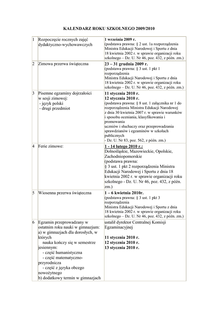 KALENDARZ ROKU SZKOLNEGO 2009/2010 1 Rozpoczęcie rocznych zajęć dydaktyczno-wychowawczych 2 Zimowa przerwa świąteczna 1 września 2009 r. (podstawa prawna: § 2 ust. 1a rozporządzenia Ministra Edukacji Narodowej i Sportu z dnia 18 kwietnia 2002 r. w sprawie organizacji roku szkolnego – Dz. U. Nr 46, poz. 432, z późn. zm.) 23 – 31 grudnia 2009 r. (podstawa prawna: § 3 ust. 1 pkt 1 rozporządzenia Ministra Edukacji Narodowej i Sportu z dnia 18 kwietnia 2002 r. w sprawie organizacji roku szkolnego – Dz. U. Nr 46, poz. 432, z późn. zm.) 3 Pisemne egzaminy dojrzałości w sesji zimowej: - język polski - drugi przedmiot 4 Ferie zimowe: 5 Wiosenna przerwa świąteczna 11 stycznia 2010 r. 12 stycznia 2010 r. (podstawa prawna: § 8 ust. 1 załącznika nr 1 do rozporządzenia Ministra Edukacji Narodowej z dnia 30 kwietnia 2007 r. w sprawie warunków i sposobu oceniania, klasyfikowania i promowania uczniów i słuchaczy oraz przeprowadzania sprawdzianów i egzaminów w szkołach publicznych - Dz. U. Nr 83, poz. 562, z późn. zm.) 1 - 14 lutego 2010 r.: Dolnośląskie, Mazowieckie, Opolskie, Zachodniopomorskie (podstawa prawna: § 3 ust. 1 pkt 2 rozporządzenia Ministra Edukacji Narodowej i Sportu z dnia 18 kwietnia 2002 r. w sprawie organizacji roku szkolnego - Dz. U. Nr 46, poz. 432, z późn. zm.) 1 – 6 kwietnia 2010r. (podstawa prawna: § 3 ust. 1 pkt 3 rozporządzenia Ministra Edukacji Narodowej i Sportu z dnia 18 kwietnia 2002 r. w sprawie organizacji roku szkolnego – Dz. U. Nr 46, poz. 432, z późn. zm.) 6 Egzamin przeprowadzany w ostatnim roku nauki w gimnazjum: a) w gimnazjach dla dorosłych, w których nauka kończy się w semestrze jesiennym: - część humanistyczna - część matematycznoprzyrodnicza - część z języka obcego nowoŜytnego b) dodatkowy termin w gimnazjach ustalił dyrektor Centralnej Komisji Egzaminacyjnej 11 stycznia 2010 r. 12 stycznia 2010 r. 13 stycznia 2010 r. wymienionych w lit. a: - część humanistyczna - część matematycznoprzyrodnicza - część z języka obcego nowoŜytnego c) w pozostałych gimnazjach: - część humanistyczna - część matematycznoprzyrodnicza - część z języka obcego nowoŜytnego d) dodatkowe terminy w gimnazjach wymienionych w lit. c: - część humanistyczna - część matematycznoprzyrodnicza - część z języka obcego nowoŜytnego 27 kwietnia 2010 r. 28 kwietnia 2010 r. 29 kwietnia 2010 r. 27 kwietnia 2010 r. 28 kwietnia 2010 r. 29 kwietnia 2010 r. 8 czerwca 2010 r. 9 czerwca 2010 r. 10 czerwca 2010 r. (podstawa prawna: § 33 rozporządzenia Ministra Edukacji Narodowej z dnia 30 kwietnia 2007 r. w sprawie warunków i sposobu oceniania, klasyfikowania i promowania uczniów i słuchaczy oraz przeprowadzania sprawdzianów i egzaminów w szkołach publicznych - Dz. U. Nr 83, poz. 562, z późn. zm.) 7 Zakończenie zajęć w klasach (semestrach) programowo najwyŜszych: - w szkołach ponadgimnazjalnych 8 stycznia 2010 r (sesja zimowa) (z wyjątkiem szkół wymienionych 30 kwietnia 2010 r. (sesja wiosenna) w pkt 9): (podstawa prawna: § 2 ust. 4 rozporządzenia Ministra Edukacji Narodowej i Sportu z dnia 18 kwietnia 2002 r. w sprawie organizacji roku szkolnego – Dz. U. Nr 46, poz. 432, z późn. zm.) 8 Zakończenie zajęć w klasach (semestrach) programowo najwyŜszych zasadniczych szkół zawodowych i szkół policealnych 9 Pisemne egzaminy dojrzałości w sesji wiosennej - język polski - drugi przedmiot 15 stycznia 2010 r. lub 18 czerwca 2010 r. (podstawa prawna: § 2 ust. 3 rozporządzenia Ministra Edukacji Narodowej i Sportu z dnia 18 kwietnia 2002 r. w sprawie organizacji roku szkolnego – Dz. U. Nr 46, poz. 432, z późn. zm.) 11 maja 2010 r. 12 maja 2010 r. - język ojczysty - w szkołach lub oddziałach z ojczystym językiem nauczania mniejszości narodowej 10 Egzamin maturalny: - część ustna - część pisemna 13 maja 2010 r. (podstawa prawna: § 8 ust. 1 załącznika nr 1 do rozporządzenia Ministra Edukacji Narodowej z dnia 30 kwietnia 2007 r. w sprawie warunków i sposobu oceniania, klasyfikowania i promowania uczniów i słuchaczy oraz przeprowadzania sprawdzianów i egzaminów w szkołach publicznych - Dz. U. Nr 83, poz. 562, z późn. zm.) ustalił dyrektor Centralnej Komisji Egzaminacyjnej 4 – 28 maja 2010 r. początek 4 maja 2010 r. (podstawa prawna: § 61 rozporządzenia Ministra Edukacji Narodowej z dnia 30 kwietnia 2007 r. w sprawie warunków i sposobu oceniania, klasyfikowania i promowania uczniów i słuchaczy oraz przeprowadzania sprawdzianów i egzaminów w szkołach publicznych - Dz. U. Nr 83, poz. 562, z późn. zm.) 11 Dni wolne od zajęć dydaktyczno-wychowawczych: a) w szkołach podstawowych wymienionych w pkt 6a Zgodnie z terminami sprawdzianu egzaminów ustalonymi przez dyrektora Centralnej Komisji Egzaminacyjnej 12 stycznia 2010 r. b) w szkołach podstawowych wymienionych w pkt.6c 8 kwietnia 2010 r. c) w gimnazjach wymienionych w pkt. 7a 11 – 13 stycznia 2010 r. d) w gimnazjach wymienionych w pkt. 7c 27 – 29 kwietnia 2010 r. e) w szkołach, w których przeprowadzana jest pisemna część egzaminu dojrzałości: - w sesji zimowej - w sesji wiosennej 11 – 12 stycznia 2010 r. 11 – 12 maja 2010 r. f) w szkołach, w których przeprowadzana jest pisemna część egzaminu maturalnego z: języka 4 maja 2010 r. polskiego i matematyki 5 maja 2010 r.. g) w zasadniczych szkołach zawodowych, technikach, technikach 19 stycznia 2010 r. (sesja zimowa) uzupełniających 21 czerwca 2010 r. (sesja letnia) i szkołach policealnych oraz placówkach kształcenia praktycznego i placówkach kształcenia ustawicznego, w których przeprowadzany jest etap pisemny (podstawa prawna: egzaminu potwierdzającego § 6 ust. 2, 3, 4 i 4a rozporządzenia Ministra kwalifikacje Edukacji Narodowej i Sportu z dnia 18 zawodowe kwietnia 2002 r. w sprawie organizacji roku szkolnego - Dz. U. Nr 46, poz. 432, z późn. zm.) h) w szkołach z 5-dniowym tygodniem pracy 12 Dodatkowym dniem wolnym od zajęć 