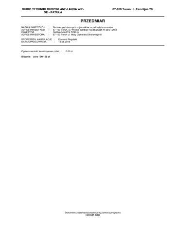 BIURO TECHNIKI BUDOWLANEJ ANNA WIESE - PATUŁA 87-100 Toruń ul. Familijna 28 PRZEDMIAR NAZWA INWESTYCJI ADRES INWESTYCJI INWESTOR ADRES INWESTORA : : : : Budowa podziemnych pojemników na odpady komunalne 87-100 Toruń, ul. Wielkie Garbary na działkach nr 28/3 i 29/2 GMINA MIASTA TORUŃ 87-100 Toruń ul. Wały Generała Sikorskiego 8 SPORZĄDZIŁ KALKULACJE : DATA OPRACOWANIA : Edmund Rogalski 12.05.2015 Ogółem wartość kosztorysowa robót : 0.00 zł Słownie: zero i 00/100 zł Dokument został opracowany przy pomocy programu NORMA STD PRZEDMIAR - TORUŃ UL WIELKIE GARBARY TABELA ELEMENTÓW SCALONYCH Lp. Nazwa Robocizna Kosztorys Sprzęt RAZEM 0.00 Słownie: zero i 00/100 zł -2- Norma STD Wersja 4.16 Materiały PRZEDMIAR - TORUŃ UL WIELKIE GARBARY KSIĄŻKA PRZEDMIARÓW Lp. Podstawa Opis i wyliczenia j.m. 1 KNR-W 2-01 Ręczne kopanie rowów dla kabli o głębokości do 0.8 m i szerokości dna do 0.4 m w gruncie kat. III 0701-02 15 m 2 KNR-W 2-01 Ręczne zasypywanie rowów dla kabli o głębokości do 0.6 m i szerokości dna do 0.4 m w gruncie kat. III 0704-02 15 m 3 KNR-W 2-01 Wykopanie dołów o powierzchni dna do 0.2 m2 i głębokości do 0.4 m (kat. gruntu III) - pod mufę kablową 0308-02 2 dół. m dół. 4 KNR-W 5-10 Montaż w rowach muf przelotowych z rur termokurczliwych na kablach wieloży- szt. łowych z żyłami Al o przekroju do 70 mm2 na napięcie do 1 kV o izolacji i po0508-06 włoce z tworzyw sztucznych 2 szt. 5 KNR-W 5-10 Ręczne układanie kabli wielożyłowych o masie do 0.5 kg/m na napięcie znamionowe poniżej 110 kV w rowach kablowych 0103-01 4 m Demontaż kabli wielożyłowych o masie do 0,5 kg/m układanych w gruncie kat. m III-IV 10 m 7 KNR 5-10 0103-01 Ręczne układanie kabli wielożyłowych o masie do 0.5 kg/m na napięcie znamionowe poniżej 110 kV w rowach kablowych - ponowny montaż kabla po przełożeniu 10 -3- Norma STD Wersja 4.16 Razem 15.000 RAZEM 15.000 15.000 RAZEM 15.000 2.000 RAZEM 2.000 2.000 RAZEM 2.000 4.000 RAZEM 4.000 10.000 RAZEM 10.000 10.000 RAZEM 10.000 12.000 RAZEM 12.000 m 6 KNNR-W 9 0801-12 8 KNR-W 5-10 Układanie rur ochronnych z PCW o średnicy do 110 mm w wykopie 0303-02 12 Poszcz m m m m PRZEDMIAR - TORUŃ UL WIELKIE GARBARY Lp. Podstawa 1 KNR-W 2-01 0701-02 Opis jm Ręczne kopanie rowów dla kabli o głębokości do 0.8 m i szerokości dna do 0.4 w gruncie kat. III obmiar = 15m m -- R -robocizna r-g 0.745r-g/m Razem koszty bezpośrednie: Cena jednostkowa: 0.00 2 KNR-W 2-01 Ręczne zasypywanie rowów dla kabli o głębom 0704-02 kości do 0.6 m i szerokości dna do 0.4 m w gruncie kat. III obmiar = 15m 1* -- R -robocizna r-g 0.307r-g/m Razem koszty bezpośrednie: Cena jednostkowa: 0.00 3 KNR-W 2-01 Wykopanie dołów o powierzchni dna do 0.2 m2 dół. 0308-02 i głębokości do 0.4 m (kat. gruntu III) - pod mufę kablową obmiar = 2dół. 1* -- R -robocizna r-g 0.3r-g/dół. Razem koszty bezpośrednie: Cena jednostkowa: 0.00 4 KNR-W 5-10 Montaż w rowach muf przelotowych z rur terszt. 0508-06 mokurczliwych na kablach wielożyłowych z żyłami Al o przekroju do 70 mm2 na napięcie do 1 kV o izolacji i powłoce z tworzyw sztucznych obmiar = 2szt. 1* 1* 2* 3* -- R -robocizna 7.45r-g/szt. -- M -zestawy montażowe do wykonania muf z rur termikurczliwych na kablach 4-żyłowych do 1kV typu ZRM2 1kpl/szt. materiały pomocnicze 4% 2* 3* 4* 5* 6* 0.00 0.000 4.6050 0.000 0.000 0.000 0.000 0.000 0.000 0.000 0.000 0.00 0.000 0.6000 S 0.00 0.000 0.000 0.00 kpl 2.0000 0.000 0.00 % 4.0000 0.000 0.00 1.5400 0.000 0.00 0.000 0.000 0.000 0.1844 0.000 m2 1.6800 0.000 0.00 m 4.1600 0.000 0.00 % 4.0000 0.000 0.00 m-g 0.0596 0.000 0.00 m-g 0.0172 0.000 0.00 -4- Norma STD Wersja 4.16 M r-g -- M -folia kalandrowana z PCW uplastycznionego grub. pow. 0,4-0,6 mm gat I/II 0.42m2/m kabel YAKXS 4x35 mm2 1.04m/m materiały pomocnicze 4% -- S -środek transportowy 0.0149m-g/m przyczepa do przewożenia kabli 0.0043m-g/m 0.000 R 14.9000 -- S -środek transportowy m-g 0.77m-g/szt. Razem koszty bezpośrednie: Cena jednostkowa: 0.00 5 KNR-W 5-10 Ręczne układanie kabli wielożyłowych o masie m 0103-01 do 0.5 kg/m na napięcie znamionowe poniżej 110 kV w rowach kablowych obmiar = 4m -- R -robocizna 0.0461r-g/m 11.1750 Koszt jedn. r-g 4* 1* Nakłady 0.00 PRZEDMIAR - TORUŃ UL WIELKIE GARBARY Lp. Podstawa Opis jm 7* ciągnik kołowy m-g 0.0043m-g/m 8* żuraw samochodowy m-g 0.0043m-g/m Razem koszty bezpośrednie: Cena jednostkowa: 0.00 6 KNNR-W 9 Demontaż kabli wielożyłowych o masie do 0,5 m 0801-12 kg/m układanych w gruncie kat. III-IV obmiar = 10m 1* -- R -robocizna 0.958r-g/m -- S -środek transportowy 0.0067m-g/m 3* ciągnik kołowy 0.0044m-g/m 4* przyczepa do przewożenia kabli 0.0044m-g/m 5* żuraw samochodowy 0.0044m-g/m Razem koszty bezpośrednie: Cena jednostkowa: 0.00 7 KNR 5-10 Ręczne układanie kabli wielożyłowych o masie 0103-01 do 0.5 kg/m na napięcie znamionowe poniżej 110 kV w rowach kablowych - ponowny montaż kabla po przełożeniu obmiar = 10m 2* 1* 2* 3* 1* 2* 3* 0.00 0.00 0.000 0.000 0.000 0.0670 0.000 0.00 m-g 0.0440 0.000 0.00 m-g 0.0440 0.000 0.00 m-g 0.0440 0.000 0.00 0.00 0.000 0.000 0.000 m r-g 0.4613 0.000 m2 4.2000 0.000 0.00 % 2.0000 0.000 0.00 m-g 0.0670 0.000 0.00 m-g 0.0820 0.000 0.00 m-g 0.0430 0.000 0.00 m-g 0.0430 0.000 0.00 m-g 0.0430 0.000 0.00 0.00 0.000 0.000 0.000 m r-g 1.5360 0.000 m 12.4800 0.000 0.00 % 4.0000 0.000 0.00 m-g 0.0876 0.000 0.00 -5- Norma STD Wersja 4.16 S m-g -- M -rura dwudzielna np. AROT A 110 PS 1.04m/m materiały pomocnicze 4% -- S -środek transportowy 0.0073m-g/m Razem koszty bezpośrednie: Cena jednostkowa: 0.000 M 0.000 -- R -robocizna 0.128r-g/m 4* 0.0172 R 9.5800 -- M -folia kalandrowana z PCW uplastycznionego grub. pow. 0,4-0,6 mm gat I/II 0.42m2/m materiały pomocnicze 2% -- S -samochód dostawczy 0.9 t 0.0067m-g/m 5* samochód skrzyniowy do 5 t 0.0082m-g/m 6* przyczepa do przewożenia kabli do 4 t 0.0043m-g/m 7* ciągnik kołowy 55-63 kW (75-85 KM) 0.0043m-g/m 8* żuraw samochodowy 4 