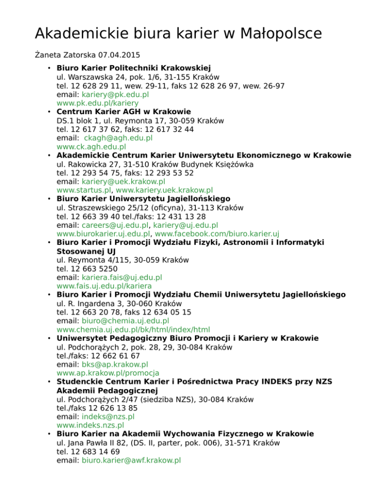 Akademickie biura karier w Małopolsce Żaneta Zatorska 07.04.2015 • Biuro Karier Politechniki Krakowskiej ul. Warszawska 24, pok. 1/6, 31-155 Kraków tel. 12 628 29 11, wew. 29-11, faks 12 628 26 97, wew. 26-97 email: [email protected] www.pk.edu.pl/kariery • Centrum Karier AGH w Krakowie DS.1 blok 1, ul. Reymonta 17, 30-059 Kraków tel. 12 617 37 62, faks: 12 617 32 44 email: [email protected] www.ck.agh.edu.pl • Akademickie Centrum Karier Uniwersytetu Ekonomicznego w Krakowie ul. Rakowicka 27, 31-510 Kraków Budynek Księżówka tel. 12 293 54 75, faks: 12 293 53 52 email: [email protected] www.startus.pl, www.kariery.uek.krakow.pl • Biuro Karier Uniwersytetu Jagiellońskiego ul. Straszewskiego 25/12 (oficyna), 31-113 Kraków tel. 12 663 39 40 tel./faks: 12 431 13 28 email: [email protected], [email protected] www.biurokarier.uj.edu.pl, www.facebook.com/biuro.karier.uj • Biuro Karier i Promocji Wydziału Fizyki, Astronomii i Informatyki Stosowanej UJ ul. Reymonta 4/115, 30-059 Kraków tel. 12 663 5250 email: [email protected] www.fais.uj.edu.pl/kariera • Biuro Karier i Promocji Wydziału Chemii Uniwersytetu Jagiellońskiego ul. R. Ingardena 3, 30-060 Kraków tel. 12 663 20 78, faks 12 634 05 15 email: [email protected] www.chemia.uj.edu.pl/bk/html/index/html • Uniwersytet Pedagogiczny Biuro Promocji i Kariery w Krakowie ul. Podchorążych 2, pok. 28, 29, 30-084 Kraków tel./faks: 12 662 61 67 email: [email protected] www.ap.krakow.pl/promocja • Studenckie Centrum Karier i Pośrednictwa Pracy INDEKS przy NZS Akademii Pedagogicznej ul. Podchorążych 2/47 (siedziba NZS), 30-084 Kraków tel./faks 12 626 13 85 email: [email protected] www.indeks.nzs.pl • Biuro Karier na Akademii Wychowania Fizycznego w Krakowie ul. Jana Pawła II 82, (DS. II, parter, pok. 006), 31-571 Kraków tel. 12 683 14 69 email: [email protected] • • • • • • • • • • www.awf.krakow.pl Biuro Karier Uniwersytetu Rolniczego im. Hugona Kołłątaja w Krakowie ul. A. Mickiewicza 21, pok. 5, 31-120 Kraków tel./faks: 12 662 42 94 email: [email protected] www.ar.krakow.pl/bpz Biuro Karier Studenckich Wyższa Szkoła Zarządzania i Bankowości w Krakowie ul. Armii Krajowej 4, 30-150 Kraków, al. Kijowska 14, 30-79 Kraków tel. 12 635 68 10 faks. 12 637 33 47 email: [email protected] www.wszib.edu.pl Biuro Karier i Współpracy z Zagranicą Wyższej Szkoły Ekonomii i Informatyki w Krakowie ul. Św. Filipa 17, I p., s. F3, 31-150 Kraków tel. 12 431 18 82, wew.137 email: [email protected] www.wsei.edu.pl Biuro Karier Krakowskiej Akademii im. A. Frycza Modrzewskiego ul. Gustawa Herlinga- Grudzińskiego 1, bud. A parter, 30-705 Kraków tel. 12 252 45 11 email: [email protected] www.biurokarier.ksw.edu.pl Biuro Karier Wyższej Szkoły Ubezpieczeń w Krakowie ul. Karmelicka 32, 31-128 Kraków tel. 12 633 09 21, faks 12 633 08 53 email: [email protected] www.wsu.pl Biuro Karier Wyższej Szkoły Europejskiej im. ks. Józefa Tischnera w Krakowie ul. Westerplatte 11, 31-033 Kraków tel. 12 683 24 70 email: [email protected] www.wse.krakow.pl Biuro Karier Wyższej Szkoły im. Bogdana Jańskiego, Wydział Zamiejscowy w Krakowie ul. W. Witosa 9, 30-162 Kraków tel. 654 54 69 wew. 111 email: [email protected] www.krakow.janski.edu.pl Biuro Karier Uniwersytetu Papieskiego Jana Pawła II ul. Szujskiego 4, 31-123 Kraków tel. 12 422 57 85 w. 41 email: [email protected] www.pat.krakow.pl Biuro Karier Akademii Muzycznej w Krakowie ul. Św. Tomasza 43, p.223, 31-027 Kraków tel. 12 426 29 70 email: [email protected] www.amuz.krakow.pl/pl/3/0/484/Biuro-Karier Akademia Sztuk Pięknych - Biuro Karier • • • • • ul. Piłsudskiego 21/8, Kraków tel./faks: 12 43 00 222 email: [email protected] www.biurokarier.asp.krakow.pl Krakowska Wyższa Szkoła Promocji Zdrowia - Biuro Karier ul. Krowoderska 73, 31-158 Kraków tel. 12 423 38 40, wew. 34 email: [email protected] www.kwspz.pl Biuro Pośrednictwa Pracy dla studentów Bratniak DS. Żaczek ul. 3 Maja 5, 30-063 Kraków tel. 12 632 75 50, faks 12 632 87 35 email: [email protected] www.biuro.bratnik.krakow.pl Państwowa Wyższa Szkoła Zawodowa w Nowym Sączu - Biuro Karier ul. Długosza 61, 33-300 Nowy Sącz tel./faks: 18 443 56 90 email: [email protected] www.pwsz-ns.edu.pl Biuro Karier i Projektów Państwowej Wyższej Szkoły Zawodowej w Tarnowie ul. A. Mickiewicza 8, p. nr B101, 33-100 Tarnów tel. 14 63 16 613, 14 63 16 627 email: [email protected] www.wsz.tarnow.pl Akademickie Biuro Karier Wyższej Szkoły Turystyki i Ekologii w Suchej Beskidzkiej ul. Zamkowa 1, 34-200 Sucha Beskidzka tel. 33 874 20 80, 874 47 40 email: [email protected] www.wste.edu.pl