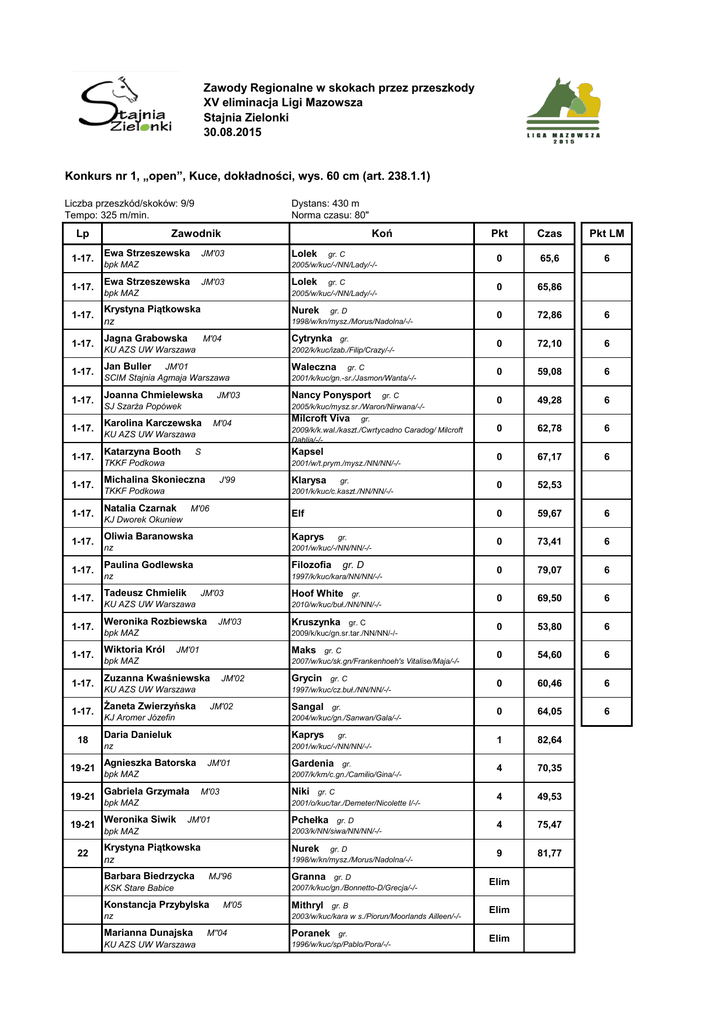 Zawody Regionalne w skokach przez przeszkody XV eliminacja Ligi Mazowsza Stajnia Zielonki 30.08.2015 Konkurs nr 1, „open”, Kuce, dokładności, wys. 60 cm (art. 238.1.1) Liczba przeszkód/skoków: 9/9 Tempo: 325 m/min. Lp 1-17. 1-17. 1-17. 1-17. 1-17. 1-17. 1-17. 1-17. 1-17. 1-17. 1-17. 1-17. 1-17. 1-17. 1-17. 1-17. 1-17. 18 19-21 19-21 19-21 22 Dystans: 430 m Norma czasu: 80" Koń Zawodnik Ewa Strzeszewska Czas Pkt LM 0 65,6 6 0 65,86 0 72,86 6 0 72,10 6 0 59,08 6 0 49,28 6 0 62,78 6 0 67,17 6 gr. 2001/k/kuc/c.kaszt./NN/NN/-/- 0 52,53 Elf 0 59,67 6 0 73,41 6 0 79,07 6 0 69,50 6 0 53,80 6 0 54,60 6 0 60,46 6 0 64,05 6 1 82,64 4 70,35 4 49,53 4 75,47 9 81,77 JM'03 Lolek JM'03 Lolek bpk MAZ Ewa Strzeszewska Pkt bpk MAZ Krystyna Piątkowska nz Jagna Grabowska gr. C 2005/w/kuc/-/NN/Lady/-/gr. C 2005/w/kuc/-/NN/Lady/-/- Nurek gr. D 1998/w/kn/mysz./Morus/Nadolna/-/- Cytrynka M'04 KU AZS UW Warszawa gr. 2002/k/kuc/izab./Filip/Crazy/-/- Jan Buller JM'01 SCIM Stajnia Agmaja Warszawa Waleczna Joanna Chmielewska Nancy Ponysport JM'03 SJ Szarża Popówek Karolina Karczewska M'04 KU AZS UW Warszawa Katarzyna Booth gr. C 2001/k/kuc/gn.-sr./Jasmon/Wanta/-/gr. C 2005/k/kuc/mysz.sr./Waron/Nirwana/-/- Milcroft Viva gr. 2009/k/k.wal./kaszt./Cwrtycadno Caradog/ Milcroft Dahlia/-/- Kapsel S TKKF Podkowa 2001/w/t.prym./mysz./NN/NN/-/- Michalina Skonieczna J'99 TKKF Podkowa Natalia Czarnak M'06 KJ Dworek Okuniew Oliwia Baranowska Klarysa Kaprys nz gr. 2001/w/kuc/-/NN/NN/-/- Paulina Godlewska Filozofia nz 1997/k/kuc/kara/NN/NN/-/- Tadeusz Chmielik JM'03 KU AZS UW Warszawa Weronika Rozbiewska JM'03 bpk MAZ Wiktoria Król gr. D Hoof White gr. 2010/w/kuc/buł./NN/NN/-/- Kruszynka gr. C 2009/k/kuc/gn.sr.tar./NN/NN/-/- Maks JM'01 gr. C 2007/w/kuc/sk.gn/Frankenhoeh's Vitalise/Maja/-/- bpk MAZ Zuzanna Kwaśniewska JM'02 KU AZS UW Warszawa Żaneta Zwierzyńska JM'02 Grycin gr. C 1997/w/kuc/cz.buł./NN/NN/-/- Sangal KJ Aromer Józefin gr. 2004/w/kuc/gn./Sanwan/Gala/-/- Daria Danieluk Kaprys gr. 2001/w/kuc/-/NN/NN/-/- nz Agnieszka Batorska JM'01 bpk MAZ Gabriela Grzymała gr. C 2001/o/kuc/tar./Demeter/Nicolette I/-/- Pchełka JM'01 gr. D 2003/k/NN/siwa/NN/NN/-/- bpk MAZ Krystyna Piątkowska nz Barbara Biedrzycka Nurek gr. D 1998/w/kn/mysz./Morus/Nadolna/-/- MJ'96 KSK Stare Babice Konstancja Przybylska M'05 nz Marianna Dunajska KU AZS UW Warszawa gr. 2007/k/km/c.gn./Camilio/Gina/-/- Niki M'03 bpk MAZ Weronika Siwik Gardenia M"04 Granna gr. D 2007/k/kuc/gn./Bonnetto-D/Grecja/-/- Mithryl gr. B 2003/w/kuc/kara w s./Piorun/Moorlands Ailleen/-/- Poranek gr. 1996/w/kuc/sp/Pablo/Pora/-/- Elim Elim Elim Sędzia Główny: Ewa Porębska-Gomółka Skład orzekający: Lidia Chomentowska, Ewelina Ćwiklak-Muśnicka, Leszek Doraczyński Gospodarz Toru: Adam Galuba Zawody Regionalne w skokach przez przeszkody XV eliminacja Ligi Mazowsza Stajnia Zielonki 30.08.2015 Konkurs nr 2, „open”, Debiuty, dokładności, wys. 60/70 cm o Puchar Starosty Powiatu Warszawskiego-Zachodniego Liczba przeszkód/skoków: 9/9 Tempo: 325 m/min. Lp 1-20. 1-20. 1-20. 1-20. 1-20. 1-20. 1-20. 1-20. 1-20. 1-20. 1-20. 1-20. 1-20. 1-20. 1-20. 1-20. 1-20. 1-20. 1-20. 1-20. 21-27 21-27 Dystans: 430 m Norma czasu: 80" Koń Zawodnik Agnieszka Batorska JM'01 Gardenia gr. bpk MAZ 2007/k/km/c.gn./Camilio/Gina/-/- Aleksandra Gawrońska Barwa -/-/-/-/-/-/- Aleksandra Śnieg Ekwador nz -/-/-/-/-/-/-/- Aleksandra Zaranek Galicja nz 2001/k/sp/gn./Hazard/Gina/-/- Barbara Biedrzycka MJ'96 Granna gr. D Pkt Czas 0 61,41 0 58,28 0 67,19 0 68,58 0 67,80 KSK Stare Babice 2007/k/kuc/gn./Bonnetto-D/Grecja/-/- Ewa Siara Tomir 0 60,14 JM'03 Inn 0 57,50 M'03 Niki gr. C 0 59,11 0 63,46 0 52,90 0 59,06 0 59,41 Klarysa gr. 2001/k/kuc/c.kaszt./NN/NN/-/- 0 53,76 Elf 0 56,77 0 73,78 0 65,68 0 52,25 0 64,07 0 65,38 0 53,20 Inn 4 56,96 Gershwin H 4 69,98 JM'00 TKKF Podkowa gr. D 2004/w/kp/mysz./Concensus/Tamiza/-/- Ewa Strzeszewska bpk MAZ Gabriela Grzymała bpk MAZ gr. B 2003/w/kuc/c.gn.sr./Hertz/Izabella/-/- 2001/o/kuc/tar./Demeter/Nicolette I/-/- Jagna Grabowska Cytrynka gr. M'04 KU AZS UW Warszawa 2002/k/kuc/izab./Filip/Crazy/-/- Joanna Chmielewska JM'03 SJ Szarża Popówek Karolina Karczewska M'04 KU AZS UW Warszawa Katarzyna Booth Nancy Ponysport gr. C 2005/k/kuc/mysz.sr./Waron/Nirwana/-/- Milcroft Viva gr. 2009/k/k.wal./kaszt./Cwrtycadno Caradog/ Milcroft Dahlia/-/- Szafir S TKKF Podkowa -/-/-/-/-/-/-/- Michalina Skonieczna J'99 TKKF Podkowa Natalia Czarnak M'06 KJ Dworek Okuniew Paulina Godlewska Filozofia nz 1997/k/kuc/kara/NN/NN/-/- Tadeusz Chmielik JM'03 gr. D Hoof White gr. KU AZS UW Warszawa 2010/w/kuc/buł./NN/NN/-/- Wiktoria Król Maks gr. C JM'01 bpk MAZ 2007/w/kuc/sk.gn/Frankenhoeh's Vitalise/Maja/-/- Wiktoria Musiał Aisab nz 2006/w/sp/gn./Howel/Alfa/-/- Wiktoria Musiał Aisab nz 2006/w/sp/gn./Howel/Alfa/-/- Zuzanna Kwaśniewska JM'02 Ewa Strzeszewska JM'03 bpk MAZ Karolina Pęczyńska JKS Karolina Grycin gr. C 1997/w/kuc/cz.buł./NN/NN/-/- KU AZS UW Warszawa S gr. B 2003/w/kuc/c.gn.sr./Hertz/Izabella/-/- 2010/w/br.d/gn./Gambrinus Son/Cara/-/- 21-27 21-27 21-27 21-27 21-27 28-30 28-30 28-30 31 Katarzyna Booth Kapsel S TKKF Podkowa Michalina Nowak 2001/w/t.prym./mysz./NN/NN/-/- Szafir JM'00 TKKF Podkowa -/-/-/-/-/-/-/- Olga Celska J'99 SKJ Beckersport Laszczki Kapablanka Olga Celska Kapablanka gr. E 1999/k/ukr.wierz./kaszt./Belick/Kapela J'99 SKJ Beckersport Laszczki Żaneta Zwierzyńska gr. E 1999/k/ukr.wierz./kaszt./Belick/Kapela JM'02 Sangal gr. KJ Aromer Józefin 2004/w/kuc/gn./Sanwan/Gala/-/- Aleksandra Zaranek Aisab nz 2006/w/sp/gn./Howel/Alfa/-/- Alicja Mizak Amant nz 2008/w/sp/gn./Ludger/Alchemia/-/- Barbara Biedrzycka MJ'96 KSK Stare Babice Marianna Dunajska Granna gr. D 2007/k/kuc/gn./Bonnetto-D/Grecja/-/- M"04 KU AZS UW Warszawa Konstancja Przybylska Poranek gr. 1996/w/kuc/sp/Pablo/Pora/-/- M'05 Mithryl gr. B nz 2003/w/kuc/kara w s./Piorun/Moorlands Ailleen/-/- Maria Górka Łezka nz 2008/k/m/buł./Chester/Łysa/-/- Sędzia Główny: Ewa Porębska-Gomółka Skł