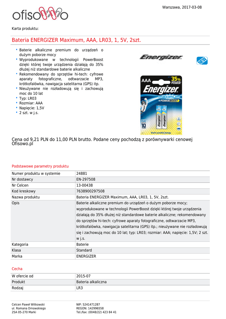 Warszawa, 2017-03-08 Karta produktu: Bateria ENERGIZER Maximum, AAA, LR03, 1, 5V, 2szt. Baterie alkaliczne premium do urządzeń o dużym poborze mocy Wyprodukowane w technologii PowerBoost dzięki której twoje urządzenia działają do 35% dłużej niż standardowe baterie alkaliczne Rekomendowany do sprzętów hi-tech: cyfrowe aparaty fotograficzne, odtwarzacie MP3, krótkofalówka, nawigacja satelitarna (GPS) itp. Nieużywane nie rozładowują się i zachowują moc do 10 lat Typ: LR03 Rozmiar: AAA Napięcie: 1,5V 2 szt. w j.s. Cena od 9,21 PLN do 11,00 PLN brutto. Podane ceny pochodzą z porównywarki cenowej Ofisowo.pl Podstawowe parametry produktu Numer produktu w systemie 24881 Nr dostawcy EN-297508 Nr Celcen 13-00438 Kod kreskowy 7638900297508 Nazwa produktu Bateria ENERGIZER Maximum, AAA, LR03, 1, 5V, 2szt. Opis Baterie alkaliczne premium do urządzeń o dużym poborze mocy; wyprodukowane w technologii PowerBoost dzięki której twoje urządzenia działają do 35% dłużej niż standardowe baterie alkaliczne; rekomendowany do sprzętów hi-tech: cyfrowe aparaty fotograficzne, odtwarzacie MP3, krótkofalówka, nawigacja satelitarna (GPS) itp.; nieużywane nie rozładowują się i zachowują moc do 10 lat; typ: LR03; rozmiar: AAA; napięcie: 1,5V; 2 szt. w j.s. Kategoria Baterie Klasa Standard Marka ENERGIZER Cecha W ofercie od 2015-07 Produkt Bateria alkaliczna Rodzaj LR3 Celcen Paweł Witkowski ul. Romana Dmowskiego 25A 05-270 Marki NIP: 5241471287 REGON: 142996558 Tel./fax: (0048/22) 423 84 41 Warszawa, 2017-03-08 Karta katalogowa produktu cd. Bateria ENERGIZER Maximum, AAA, LR03, 1, 5V, 2szt. Typ 1,5V Wymiary Rozmiar AAA Wymiary (mm) Średnica: 10,5 wysokość: 44,5 Certyfikaty Nowy produkt w ofercie Standard Hit Standard Wspólny słownik zamówień CPV 31411000-0 Serdecznie zapraszamy do współpracy zespół. Ofisowo.pl Celcen Paweł Witkowski ul. Romana Dmowskiego 25A 05-270 Marki NIP: 5241471287 REGON: 142996558 Tel./fax: (0048/22) 423 84 41