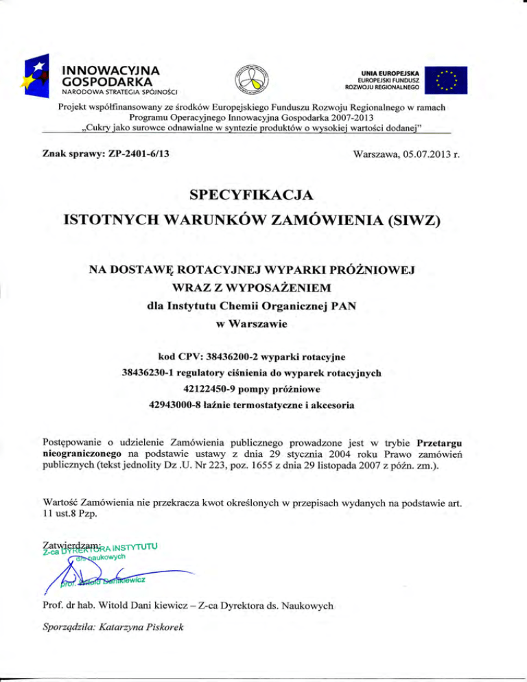 Specyfikacja Istotnych Warunków Zamówienia na dostawę rotacyjnej wyparki próżniowej wraz z wyposażeniem dla ICHO PAN 1. Informacje wprowadzające 1.1 Dane Zamawiającego: Instytut Chemii Organicznej Polskiej Akademii Nauk NIP: 525-000-89-33 REGON: 000325848 Dokładny adres do korespondencji: ul. Kasprzaka 44/52, 01-224 Warszawa Faks do korespondencji w sprawie Zamówienia: 22 632-66-81 E-mail do korespondencji w sprawie Zamówienia: [email protected] Znak Postępowania: ZP-2401-6/13 Strona, na której znajduje się SIWZ: http://www.icho.edu.pl/przetargi.php 1.2 Użyte w Specyfikacji terminy mają następujące znaczenie: 1.2.1 „Instytut”, „IChO PAN” lub „Zamawiający” – Instytut Chemii Organicznej PAN. 1.2.2 „Postępowanie” – postępowanie prowadzone przez Zamawiającego na podstawie niniejszej Specyfikacji. 1.2.3 „SIWZ” – niniejsza Specyfikacja Istotnych Warunków Zamówienia. 1.2.4 „Ustawa” lub „Pzp” - ustawa z dnia 29 stycznia 2004 r. - Prawo zamówień publicznych. 1.2.5 „Zamówienie” – należy przez to rozumieć zamówienie publiczne, którego przedmiot został w sposób szczegółowy opisany w punkcie 3 SIWZ oraz w Załączniku Nr 1. 1.2.6 „Wykonawca” – podmiot, który ubiega się o wykonanie Zamówienia, złoży ofertę na wykonanie Zamówienia lub zawrze z Zamawiającym umowę w sprawie wykonania Zamówienia. 1.3 W szczególnie uzasadnionych przypadkach Zamawiający ma prawo do zmiany treści Specyfikacji Istotnych Warunków Zamówienia. Zmiana może nastąpić w każdym czasie, przed upływem terminu do składania ofert. W przypadku wprowadzenia takiej zmiany, informacja Zamawiającego, oraz o tym zostanie przekazana niezwłocznie wszystkim podmiotom, Zamawiającego Specyfikację i będzie dla nich wiążąca. 2 zamieszczona które na stronie pobrały od Specyfikacja Istotnych Warunków Zamówienia na dostawę rotacyjnej wyparki próżniowej wraz z wyposażeniem dla ICHO PAN 2. Tryb udzielenia Zamówienia: 2.1. Postępowanie o udzielenie Zamówienia prowadzone jest w trybie Przetargu nieograniczonego na podstawie ustawy z dnia 29 stycznia 2004 roku Prawo zamówień publicznych (tekst jednolity Dz. U. Nr 223, poz. 1655 z dnia 29 listopada 2007 z późniejszymi zmianami), przepisów wykonawczych wydanych na jej podstawie oraz niniejszej Specyfikacji Istotnych Warunków Zamówienia. 3. Opis przedmiotu Zamówienia: 3.1. Przedmiotem Zamówienia jest dostawa do wskazanego pomieszczenia w siedzibie Zamawiającego zestawu składającego się z rotacyjnej wyparki próżniowej wyposażonej w membranową pompę próżniową oraz elektroniczny kontroler próżni. Minimalne parametry techniczne oferowanego zestawu: Zestaw wyparki próżniowej wraz z kontrolerem próżni i pompą chemoodporną – szt. 1 Wyparka rotacyjna - Konfiguracja chłodnicy: szklana antyimplozyjną, ze zgrupowanym chłodnica, pionowa, pokryta warstwą układem króćców przyłączeniowych dla przewodów doprowadzających medium chłodzące oraz źródła próżni. - Powierzchnia kondensacji chłodnicy: min. 1500 cm2 - Zwarte gabaryty zajmujące mało przestrzeni roboczej. - Rozmiar instalowanych kolb destylacyjnych: do 4000 ml. - Płynna regulacja obrotów pokrętłem w zakresie 20 – 280 min-1 - Łaźnia wodna (+200C do +950C), z cyfrową regulacją i odczytem temperatury, z wyświetlaczem cyfrowym LED ustawionym pod niewielkim kątem do poziomu w celu dokonania wygodnego odczytu - Dokładność regulacji temperatury: ± 1ºC - Pojemność łaźni wodnej: min. 4000 ml - Ręczne podnoszenie i opuszczanie wspomaganiem mechanicznym. 3 układu destylacyjnego. Podnośnik ze Specyfikacja Istotnych Warunków Zamówienia na dostawę rotacyjnej wyparki próżniowej wraz z wyposażeniem dla ICHO PAN - Pokrętło do ustawiania szybkości obrotowej na głowicy powyżej kolby destylacyjnej w celu ergonomicznej obsługi wyparki (brak możliwości przypadkowego zachlapania) - Cichobieżny napęd obrotowy kolby destylacyjnej, sterowany elektronicznie. -System do szybkiego mocowania i zdejmowania kolby destylacyjnej z wewnętrznym gwintem i metalową zawleczką - Szklana rurka wyparna ze szlifem STJ 29/32 z zewnętrznym gwintem dostosowanym do współpracy z systemem do szybkiego mocowania - Budowa modułowa, proste dobieranie konfiguracji użytkowej. - Szklany zawór trójdrożny pozwalający na dozowanie cieczy do destylacji bez przerywania pracy, zapowietrzenie, zamknięcie układu próżniowego. - W zestawie kolba destylacyjna oraz odbieralnik o pojemności 1 litra każda - Wymiary nie powinny znacząco odbiegać od (szer. x wys. x gł.): 430x520x315 mm - Moc grzania: min. 1300 W - Zasilanie 230V/50Hz - Deklaracja zgodności CE Membranowa pompa próżniowa, chemoodporna - Liczba stopni: 3 - Ilość głowic: 4 - Próżnia końcowa nie gorsza niż 2 mbar - Wydajność nie mniejsza niż 3.1 m3/h - Prędkość maksymalna: nie mniej niż 1600 min-1 - Możliwość płynnej regulacji prędkości pracy pompy. - Silnik bezszczotkowy - Pompa chemicznie odporna - Membrany pompy wykonane z PTFE - chemicznie odporne - System samoczynnego przedmuchiwania membran - Łatwa, wizualna ocena zużycia membran bez rozbierania pompy - Funkcja oszczędzania energii ECO - Poziom hałasu poniżej 50 dB (A) 4 Specyfikacja Istotnych Warunków Zamówienia na dostawę rotacyjnej wyparki próżniowej wraz z wyposażeniem dla ICHO PAN - Klasa bezpieczeństwa: IP 34 - Porty do komunikacji z kontrolerem próżni i wyparką rotacyjną: 2xRS-485 - Możliwość stosowania szklanego wykraplacza na wydechu pompy. - Tłumik hałasu do podłączenia na wylocie pompy - Butelka Woulff’a, szklana, z nakręcaną głowicą i minimum 3 króćcami przyłączeniowymi, zintegrowana fizycznie z pompą. Szkło butelki pokryte warstwą antyimplozyjną z tworzywa sztucznego - Wymiary nie powinny znacząco odbiegać od: 380 x 300 x 180mm (szer x wys x głęb) - W zestawie wąż próżniowy do podłączenia, min. 1.5m - Zasilanie