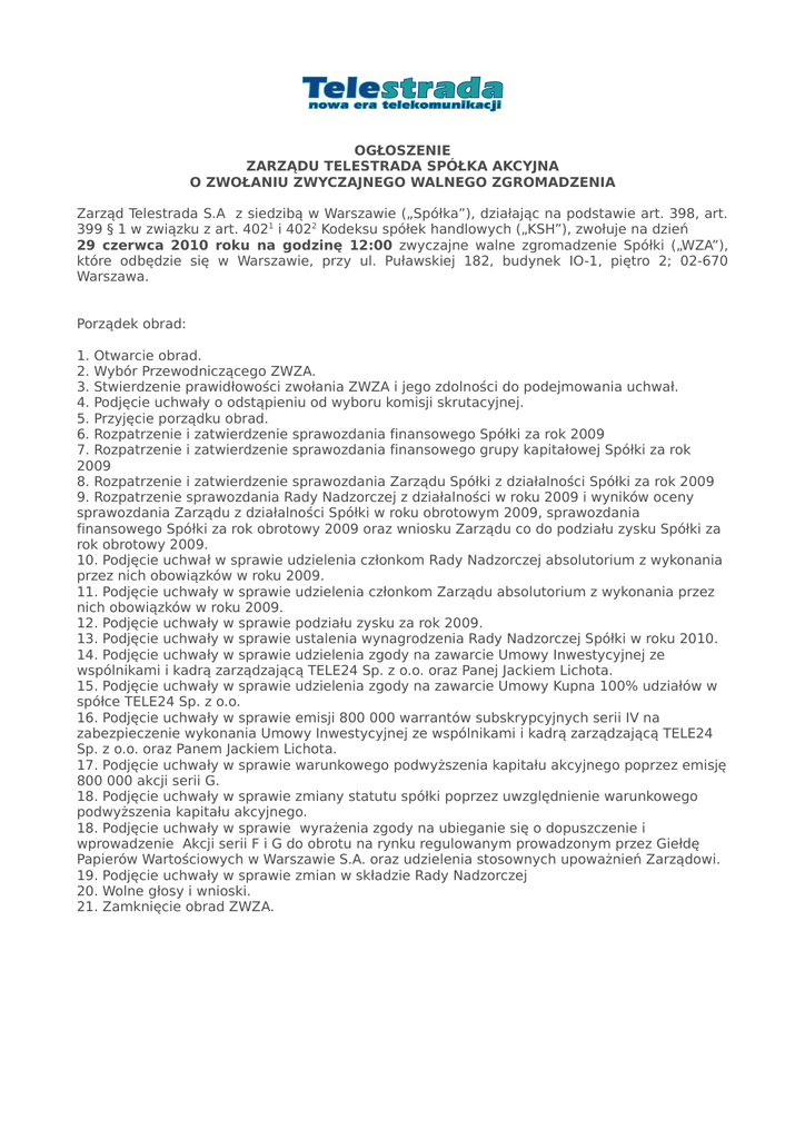 Zarząd Telestrada S.A z siedzibą w Warszawie („Spółka”), działając na podstawie art. 398, art.