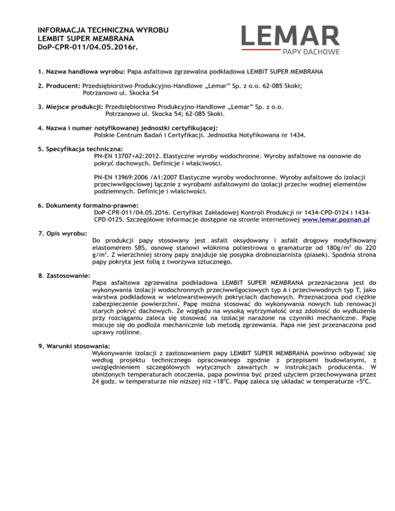 INFORMACJA TECHNICZNA WYROBU LEMBIT SUPER MEMBRANA DoP-CPR-011/04.05.2016r. 1. Nazwa handlowa wyrobu: Papa asfaltowa zgrzewalna podkładowa LEMBIT SUPER MEMBRANA 2. Producent: Przedsiębiorstwo Produkcyjno-Handlowe „Lemar” Sp. z o.o. 62-085 Skoki; Potrzanowo ul. Skocka 54 3. Miejsce produkcji: Przedsiębiorstwo Produkcyjno-Handlowe „Lemar” Sp. z o.o. Potrzanowo ul. Skocka 54; 62-085 Skoki. 4. Nazwa i numer notyfikowanej jednostki certyfikującej: Polskie Centrum Badań i Certyfikacji. Jednostka Notyfikowana nr 1434. 5. Specyfikacja techniczna: PN-EN 13707+A2:2012. Elastyczne wyroby wodochronne. Wyroby asfaltowe na osnowie do pokryć dachowych. Definicje i właściwości. PN-EN 13969:2006 /A1:2007 Elastyczne wyroby wodochronne. Wyroby asfaltowe do izolacji przeciwwilgociowej łącznie z wyrobami asfaltowymi do izolacji przeciw wodnej elementów podziemnych. Definicje i właściwości. 6. Dokumenty formalno-prawne: DoP-CPR-011/04.05.2016. Certyfikat Zakładowej Kontroli Produkcji nr 1434-CPD-0124 i 1434CPD-0125. Szczegółowe informacje dostępne na stronie internetowej www.lemar.poznan.pl 7. Opis wyrobu: 8. Zastosowanie: Do produkcji papy stosowany jest asfalt oksydowany i asfalt drogowy modyfikowany elastomerem SBS, osnowę stanowi włóknina poliestrowa o gramaturze od 180g/m2 do 220 g/m2. Z wierzchniej strony papy znajduje się posypka drobnoziarnista (piasek). Spodnia strona papy pokryta jest folią z tworzywa sztucznego. Papa asfaltowa zgrzewalna podkładowa LEMBIT SUPER MEMBRANA przeznaczona jest do wykonywania izolacji wodochronnych przeciwwilgociowych typ A i przeciwwodnych typ T, jako warstwa podkładowa w wielowarstwowych pokryciach dachowych. Przeznaczona pod ciężkie zabezpieczenie powierzchni. Papę można stosować do wykonywania nowych lub renowacji starych pokryć dachowych. Ze względu na wysoką wytrzymałość oraz zdolność do wydłużenia przy rozciąganiu zaleca się stosować na izolacje narażone na czynniki mechaniczne. Papę mocuje się do podłoża mechanicznie lub metodą zgrzewania. Papa nie jest przeznaczona pod uprawy roślinne. 9. Warunki stosowania: Wykonywanie izolacji z zastosowaniem papy LEMBIT SUPER MEMBRANA powinno odbywać się według projektu technicznego opracowanego zgodnie z przepisami budowlanymi, z uwzględnieniem szczegółowych wytycznych zawartych w instrukcjach producenta. W obniżonych temperaturach otoczenia, papa powinna być przed użyciem przechowywana przez 24 godz. w temperaturze nie niższej niż +180C. Papę zaleca się układać w temperaturze +50C. INFORMACJA TECHNICZNA WYROBU LEMBIT SUPER MEMBRANA DoP-CPR-011/04.05.2016r. 10. Informacja o badaniach i właściwości wyrobu: LEMBIT SUPER MEMBRANA Lp. Badanie Wg Normy Wartości deklarowane 1 Wady widoczne EN 1850-1 brak wad widocznych 2 Długość EN 1848-1 min 10 m 3 Szerokość EN 1848-1 min 1,0 m 4 Prostoliniowość EN 1848-1 maksymalna odchyłka od prostoliniowości nie powinna przekraczać 20 mm na 10 m długości 5 Grubość EN 1849-1 3,0 mm +/- 0,2 mm 6 Gramatura wkładki nośnej EN 1849-1 180 g/m2 +/- 20 g/m2 7 Gramatura wyrobu gotowego EN 1849-1 3900 g/m2 +/- 150 g/m2 8 Wodoszczelność EN 1928:2000 9 Reakcja na ogień EN 13501-1 klasa E 10 Właściwości przy rozciąganiu: Maksymalna siła rozciągająca: EN 12311-1 wzdłuż 800 N +/- 150 N w poprzek 700 N +/- 150 N 11 Wydłużenie przy maksymalnej sile rozciągającej EN 12311-1 wzdłuż 55 % +/- 15 % w poprzek 55 % +/- 15 % 12 Odporność na niską temperaturę; brak rys i pęknięć w temperaturze: EN 1109 –220C 13 Odporność na spływanie; przemieszczenie masy nie większe niż 2 mm w temperaturze EN 1110 1000C 14 Wytrzymałość na rozdzieranie (gwoździem) 15 Odporność na chemikalia 16 Odporność na obciążenia statyczne EN 12730 max 20 kg 17 Przenikanie pary wodnej EN 1931 μ 16000 +/- 1000 18 Trwałość po starzeniu sztucznym/degradacji 12 tygodni EN 1296 EN 1928:2000 19 Odporność przebicie z wysokości EN 12691 20 Wytrzymałość złączy na ścinanie EN 12317-1 NPD 21 Wytrzymałość złączy na oddzieranie EN 12316-1 NPD 22 Odporność na działanie ognia zewnętrznego ENV 1187 NPD 23 Odporność na przerastanie korzeni pr-EN 13948 NPD 24 Stabilność wymiarów EN 1107-1 NPD 25 Przyczepność posypki EN 12039 NPD - wodoszczelna przy ciśnieniu 10 kPa - wodoszczelna przy ciśnieniu 2 kPa dla zastosowania wg typu A - wodoszczelna przy ciśnieniu 60 kPa dla zastosowania wg typu T EN 12310-1 300 N +/- 100 N w obu kierunkach EN 1847; EN 1928:2000 wodoszczelna przy ciśnieniu 10 kPa Badanie wodoszczelności wg PN-EN 1928:2000 - wodoszczelna przy ciśnieniu 2 kPa - wodoszczelna przy ciśnieniu 60 kPa przy zastosowaniu Typ A Typu T max 900 mm