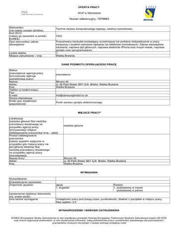 OFERTA PRACY WUP w Warszawie Numer referencyjny: 7979883 Stanowisko: (nie należy używać skrótów) Kod ISCO: (należy go sprawdzić w portalu EURES) Opis stanowiska/ zakres obowiązków: Liczba etatów: Miejsce zatrudnienia – kraj: Technik serwisu komputerowego (laptopy, telefony komórkowe) 7422 Poszukiwany kandydat posiadający wcześniejsze lub podobne doświadczenie w pracy związanej z szybkim serwisem laptopów lub telefonów komórkowych. Zakres obowiązków: lutowanie, naprawa płyt głównych, naprawa telefonów iPhone oraz innych marek, naprawa sprzętu oraz oprogramowania. 1 Wielka Brytania DANE PODMIOTU OFERUJĄCEGO PRACĘ Status: (pracodawca/ agencja pracy tymczasowej/ agencja pośrednictwa pracy) Nazwa: Adres: Kraj: Telefon (z kodem kraju): Fax: E-mail: Strona internetowa: Krótki opis działalności gospodarczeji: pracodawca Mircom ltd ul. 30 Park Street, BS1 5JA Bristol, Wielka Brytania Wielka Brytania [email protected] Punkt serwisu sprzętu elektronicznego. MIEJSCE PRACYii Lokalizacja: [siedziba główna/ filia/ siedziba pracodawcy docelowego (w przypadku agencji pracy tymczasowej)/ miejsce oddelegowania pracownika/ inne – jakie] Powód oddelegowania pracownika: [należy wypełnić wyłącznie w przypadku gdy miejsce pracy nie jest główną siedzibą/ filią/ siedzibą pracodawcy docelowego (w przypadku agencji pracy tymczasowej)] Nazwa firmy: Adres: Kraj: siedziba główna Mircom ltd ul. 30 Park Street, BS1 5JA Bristol, Wielka Brytania Wielka Brytania WYMAGANIA Wykształcenie: Doświadczenie zawodowe: Znajomość języków: Uprawnienia/ dyplomy/ dokumenty (np. prawo jazdy): Inne istotne wymagania: Język 1. angielski Poziom 1. podstawowy w mowie podstawowy w piśmie Umiejętnośc pracy pod presją czasu, punktualność, dbałośc o porządek w miejscu pracy. Staż ogółem: 2.0 WYNAGRODZENIE I WARUNKI ZATRUDNIENIA EURES (Europejskie Służby Zatrudnienia) to sieć współpracy pomiędzy Komisją Europejską, Publicznymi Służbami Zatrudnienia krajów UE/ EOG oraz innych organizacji partnerskich, w celu dostarczania informacji, usług pośrednictwa pracy i poradnictwa zawodowego dla pracodawców i pracowników chcących skorzystać z zasady wolnego przepływu osób Wysokość pensji brutto: Wysokość pensji netto: Waluta, w jakiej wypłacana jest pensja: Rodzaj stawki wynagrodzenia: (godzinowa/ tygodniowa/ miesięczna/ roczna/ inna) Premie: Dodatkowe świadczenia (zakwaterowanie, wyżywienie, koszty związane ze zmianą miejsca zamieszkania, koszty podróży itp.): Nazwa firmy, z którą zostanie podpisana umowa: Rodzaj umowy: (umowa o pracę, umowa zlecenia, wolontariat, praktyka zawodowa/ staż, praca zdalna, agencja pracy tymczasowej, inne): Wymiar czasu pracy (praca na pełen etat/ część etatu): Czas trwania umowy: (nieokreślony/ określony) 6,85 Liczba godzin tygodniowo: Zmiany i praca w dni wolne: Data rozpoczęcia: Inne informacje: 25,00 Funt szterling Czasowy ze stawką godzinową istnieje możliwość zakwaterowania na własny koszt, Pracodawca pokrywa koszt przylotu do Wielkiej Brytanii. Pracodawca oferuje zakwaterowanie na okres pierwszysch 6-8 tygodni. Koszt zakwaterowania ( 50 GPB tygodniowo) będzie odjęty z pensji. Mircom ltd umowa o pracę 6 dni w tygodniu nieokreślony Data wygaśnięcia umowy (w przypadku umowy na czas określony): Liczba godzin pracy w tygodniu: 25 – 45, Pełny wymiar czasu pracy. SPOSÓB SKŁADANIA WNIOSKU Wymagane dokumenty (list motywacyjny, CV itp.): Język, w którym muszą być sporządzone przedkładane dokumenty: Do kogo należy wysłać dokumenty: (do pracodawcy/ doradcy EURES) Gdzie należy wysłać dokumenty: (adres, adres e-mail, nr faksu z kodem kraju itp.) Dane teleadresowe doradcy EURES lub przedstawiciela pracodawcy: (nazwisko, adres, telefon, fax, e-mail itp.) CV angielski do pracodawcy [email protected] [email protected] DODATKOWE INFORMACJE Praca od zaraz. WAŻNOŚĆ 2015-08-20 Data publikacji: Termin przedkładania podań o pracę / 2015-10-30 zakończenia ważności oferty: Uprzejmie informujemy, że skontaktujemy się wyłącznie z wybranymi kandydatami. UWAGA: 1. Umowa z zagranicznym pracodawcą jest zawierana, co do zasady, zgodnie z prawem kraju zatrudnienia. Oznacza to, że wszystkie roszczenia odnośnie warunków, które obejmuje umowa, można kierować wyłącznie do odpowiedniego sądu w kraju zatrudnienia. Publiczne służby zatrudnienia (EURES) nie mogą pośredniczyć ani reprezentować pracownika w sądzie kraju zatrudnienia w przypadku sporu z pracodawcą. 2. Publiczne służby zatrudnienia (EURES) dokładają wszelkich starań, aby zapewnić rzetelność i wiarygodność ofert pracy zgłoszonych w lokalnym urzędzie pracy. Należy wyjaśnić, że oferta pracy została zgłoszona przez stronę trzecią i EURES nie odpowiada za ewentualne rozbieżności między warunkami pracy określonymi w ofercie pracy i warunkami oferowanymi przez potencjalnego pracodawcę. 3. Publiczne służby zatrudnienia (EURES) informują, że będą zbierać, przetwarzać i przekazywać potencjalnym pracodawcom zgodnie z przepisami dotyczącymi ochrony danych osobowych wszystkie dane osobowe dostarczone przez osoby poszukujące pracy. i Informacje o firmie, takie jak: status prawny, sektor, typ działalności, rodzaj produktów lub świadczonych usług, data rozpoczęcia EURES (Europejskie Służby Zatrudnienia) to sieć współpracy pomiędzy Komisją Europejską, Publicznymi Służbami Zatrudnienia krajów UE/ EOG oraz innych organizacji partnerskich, w celu dostarczania informacji, usług pośrednictwa pracy i poradnictwa zawodowego dla pracodawców i pracowników chcących skorzystać z zasady wolnego przepływu osób działalności gospodarczej, liczba pracowników itp. ii Miejsce, w którym będzie wykonywana praca. Należy wypełnić w przypadku gdy: 1) miejsce wykonywania pracy jest inne niż siedziba podmiotu oferującego pracę, 2) pracę oferuje agencja pośrednictwa pracy/ agencja pracy tymczasowe