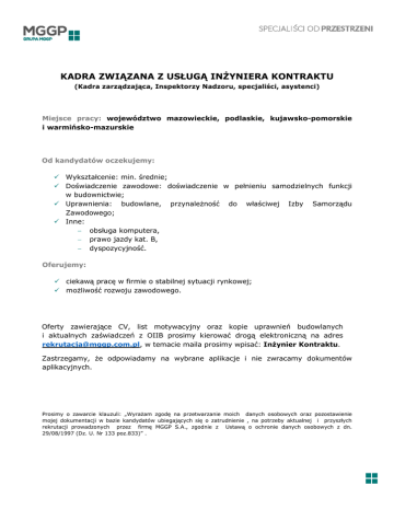 KADRA ZWIĄZANA Z USŁUGĄ INŻYNIERA KONTRAKTU (Kadra Kadra zarządzająca, Inspektorzy Nadzoru, specjaliści, asystenci) Miejsce pracy: województwo mazowieckie, podlaskie, kujawsko-pomorskie kujawsko i warmińsko-mazurskie Od kandydatów oczekujemy: oczekujemy Wykształcenie: min. średnie; średnie Doświadczenie zawodowe: doświadczenie w pełnieniu samodzielnych funkcji w budownictwie; Uprawnienia: budowlane, przynależność do właściwej Izby Samorządu Zawodowego; Inne: − obsługa komputera, komputera − prawo jazdy kat. B, B − dyspozycyjność. Oferujemy: ciekawą pracę w firmie e o stabilnej sytuacji rynkowej; rynkowej możliwość rozwoju zawodowego. zawo Oferty zawierające CV, list motywacyjny oraz kopie uprawnień budowlanych i aktualnych zaświadczeń z OIIB prosimy kierować drogą elektroniczną na adres [email protected], w temacie maila prosimy wpisać: Inżynier Kontraktu. Kontraktu Zastrzegamy, że odpowiadamy na wybrane aplikacje i nie zwracamy dokumentów aplikacyjnych. Prosimy o zawarcie klauzuli: „Wyrażam zgodę na przetwarzanie moich danych danych osobowych oraz pozostawienie mojej dokumentacji w bazie kandydatów ubiegających się o zatrudnienie , na potrzeby aktualnej i przyszłych rekrutacji prowadzonych przez firmę MGGP S.A., zgodnie z Ustawą o ochronie danych osobowych z dn. 29/08/1997 (Dz. U. Nr 133 poz.833)” .