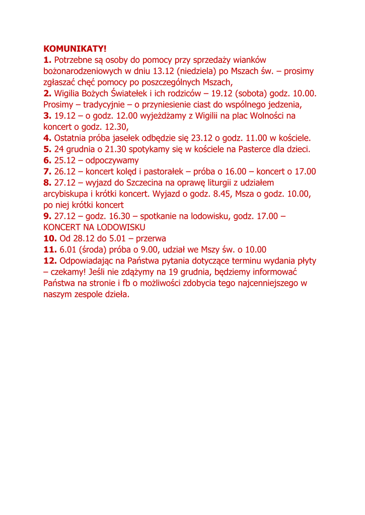 KOMUNIKATY! 1. Potrzebne są osoby do pomocy przy sprzedaży wianków bożonarodzeniowych w dniu 13.12 (niedziela) po Mszach św. – prosimy zgłaszać chęć pomocy po poszczególnych Mszach, 2. Wigilia Bożych Światełek i ich rodziców – 19.12 (sobota) godz. 10.00. Prosimy – tradycyjnie – o przyniesienie ciast do wspólnego jedzenia, 3. 19.12 – o godz. 12.00 wyjeżdżamy z Wigilii na plac Wolności na koncert o godz. 12.30, 4. Ostatnia próba jasełek odbędzie się 23.12 o godz. 11.00 w kościele. 5. 24 grudnia o 21.30 spotykamy się w kościele na Pasterce dla dzieci. 6. 25.12 – odpoczywamy 7. 26.12 – koncert kolęd i pastorałek – próba o 16.00 – koncert o 17.00 8. 27.12 – wyjazd do Szczecina na oprawę liturgii z udziałem arcybiskupa i krótki koncert. Wyjazd o godz. 8.45, Msza o godz. 10.00, po niej krótki koncert 9. 27.12 – godz. 16.30 – spotkanie na lodowisku, godz. 17.00 – KONCERT NA LODOWISKU 10. Od 28.12 do 5.01 – przerwa 11. 6.01 (środa) próba o 9.00, udział we Mszy św. o 10.00 12. Odpowiadając na Państwa pytania dotyczące terminu wydania płyty – czekamy! Jeśli nie zdążymy na 19 grudnia, będziemy informować Państwa na stronie i fb o możliwości zdobycia tego najcenniejszego w naszym zespole dzieła.