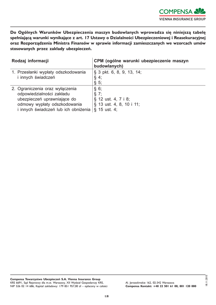 Do Ogólnych Warunków Ubezpieczenia maszyn budowlanych wprowadza się niniejszą tabelę spełniającą warunki wynikające z art. 17 Ustawy o Działalności Ubezpieczeniowej i Reasekuracyjnej oraz Rozporządzenia Ministra Finansów w sprawie informacji zamieszczanych we wzorcach umów stosowanych przez zakłady ubezpieczeń. CPM (ogólne warunki ubezpieczenie maszyn budowlanych) 1. Przesłanki wypłaty odszkodowania § 3 pkt. 6, 8, 9, 13, 14; i innych świadczeń § 4; § 5; § 6; 2. Ograniczenia oraz wyłączenia odpowiedzialności zakładu § 7; ubezpieczeń uprawniające do § 12 ust. 4, 7 i 8; odmowy wypłaty odszkodowania § 13 ust. 4, 8, 10 i 11; i innych świadczeń lub ich obniżenia § 15 ust. 4; Compensa Towarzystwo Ubezpieczeń S.A. Vienna Insurance Group KRS 6691, Sąd Rejonowy dla m.st. Warszawy, XII Wydział Gospodarczy KRS, NIP 526 02 14 686, Kapitał zakładowy: 179 851 957,00 zł – opłacony w całości 1/8 Al. Jerozolimskie 162, 02-342 Warszawa Compensa Kontakt: +48 22 501 61 00, 801 120 000 18.11.2015 Rodzaj informacji OGÓLNE WARUNKI UBEZPIECZENIA MASZYN I URZĄDZEŃ BUDOWLANYCH (CPM) § 1. POSTANOWIENIA OGÓLNE 1. Na podstawie niniejszych ogólnych warunków ubezpieczenia maszyn i urządzeń budowlanych (OWU) Compensa Towarzystwo Ubezpieczeń S.A. Vienna Insurance Group zwane dalej COMPENSA, zawiera z Ubezpieczającymi nie będącymi konsumentami w rozumieniu przepisów prawa umowy ubezpieczenia („umowa”) maszyn i urządzeń budowlanych. 2. Ubezpieczający może zawrzeć umowę na swoją rzecz jaki i na cudzy rachunek. 3. Za porozumieniem strony umowy mogą wprowadzić do umowy ubezpieczenia postanowienia dodatkowe lub odmienne od ustalonych w OWU. 4. W przypadku wprowadzenia do umowy postanowień dodatkowych lub odmiennych od ustalonych w OWU, postanowienia OWU mają zastosowanie w zakresie nie uregulowanym tymi postanowieniami. 5. Pod rygorem nieważności postanowienia dodatkowe lub odmienne od ustalonych w OWU muszą być sporządzone w formie pisemnej. § 2. UBEZPIECZENIE NA CUDZY RACHUNEK 1. W przypadku zawarcia umowy na cudzy rachunek: 1)Ubezpieczający zobowiązany jest umożliwić Ubezpieczonemu zapoznanie się z warunkami ubezpieczenia oraz wszelkimi innymi informacjami dotyczącymi praw i obowiązków Ubezpieczonego wynikających z umowy ubezpieczenia; 2)Ubezpieczony może żądać by COMPENSA udzieliła mu informacji o postanowieniach zawartej umowy oraz OWU w zakresie, w jakim dotyczą praw i obowiązków Ubezpieczonego; COMPENSA zobowiązana jest na żądanie Ubezpieczonego, zapewnić mu dostęp do ww. materiałów informacyjnych w formie papierowej, elektronicznej lub w inny uzgodniony z nim sposób; 3)Ubezpieczony jest uprawniony do żądania należnego świadczenia bezpośrednio od COMPENSY, chyba że strony uzgodniły inaczej; jednakże uzgodnienie takie nie może zostać dokonane, jeżeli zdarzenie szkodowe objęte ubezpieczeniem już zaszło; 4)roszczenie o zapłatę składki przysługuje COMPENSIE wyłącznie przeciwko Ubezpieczającemu; 5)zarzut mający wpływ na odpowiedzialność COMPENSY może ona podnieść również przeciwko Ubezpieczonemu. § 4. PRZEDMIOT I MIEJSCE UBEZPIECZENIA 1. Przedmiotem ubezpieczenia są wymienione w umowie maszyny i urządzenia budowlane eksploatowane w ramach prowadzonej przez Ubezpieczonego działalności gospodarczej. 2. Ochroną ubezpieczeniową objęte są maszyny i urządzenia, jednakże umową objąć można wyłącznie maszyny i urządzenia budowlane po zakończonych z wynikiem pozytywnym próbach eksploatacyjnych. 3. Maszyny i urządzenia budowlane wymienione w umowie objęte są ochroną ubezpieczeniową w miejscu określonym w umowie podczas: 1)eksploatacji; 2)przestoju; 3)konserwacji; 4)czyszczenia; 5)naprawy; 6)remontu; 7)demontażu i ponownego montażu w celu wykonania w/w czynności; 8)transportu związanego z w/w czynnościami w miejscu ubezpieczenia. 4. O ile nie umówiono się inaczej maszyny i urządzenia budowlane objęte są ochroną ubezpieczeniową na terenie Rzeczpospolitej Polskiej w miejscu ubezpieczenia, to jest: 16.11.2015 § 3. DEFINICJE Użyte w OWU definicje (w porządku alfabetycznym) oznaczają: 1)DEPRECJACJA – obniżenie wartości przedmiotu ubezpieczenia; 2)EROZJA – powierzchniowe niszczenie metali powodowane przez oddziaływania mechaniczne, np. tarcie, uderzenia; 3)FRANZYZA REDUKCYJNA – ustalona w umowie ubezpieczenia kwota potrącana, przy ustalaniu należnego odszkodowania, z kwoty odpowiadającej łącznej wartości szkód wynikających z jednego wypadku; 4)KAWITACJA – powstawanie w przepływającej cieczy pęcherzyków wypełnionych gazem lub parą, wskutek miejscowego obniżenia się ciśnienia w miejscach znacznego wzrostu prędkości przepływu, powodujące niszczenie stykających się z cieczą elementów konstrukcji; 5)KOROZJA – proces niszczenia metali lub ich stopów w wyniku reakcji chemicznych lub elektrochemicznych, przebiegających podczas zetknięcia z otaczającym je środowiskiem gazowym lub ciekłym; 6)KRADZIEŻ Z WŁAMANIEM – dokonanie albo usiłowanie zaboru przedmiotu ubezpieczenia z miejsca ubezpieczenia, zabezpieczonego zgodnie z postanowieniami § 5 ust. 2: a)po uprzednim usunięciu siłą zabezpieczenia lub otworzeniu wejścia do pomieszczenia, w którym przedmiot ubezpieczenia znajduje się, przy użyciu narzędzi, albo podrobionego lub dopasowanego klucza, bądź klucza oryginalnego, w którego posiadanie sprawca wszedł wskutek włamania do innego pomieszczenia lub w wyniku rabunku; b)przez sprawcę, który ukrył się w pomieszczeniu przed jego zamknięciem, jeśli pozostawił ślady mogące służyć jako dowód jego potajemnego ukrycia, pod warunkiem pozostawienia przez sprawców widocznych śladów włamania, w postaci uszkodzenia istniejących zabezpieczeń; 7)POLISA – dokument wystawiony przez COMPENSĘ, który potwierdza zawarcie umowy; 8)RABUNEK – zabór mienia przy użyciu lub groźbie natychmiastowego użycia przemo