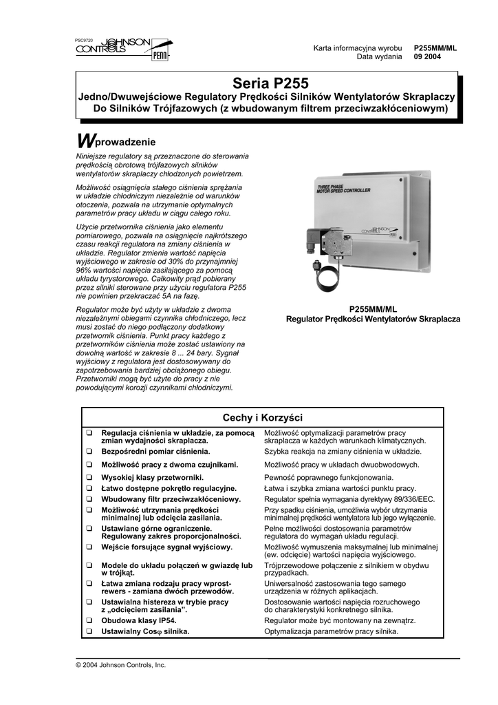 PSC9720 Karta informacyjna wyrobu Data wydania P255MM/ML 09 2004 Seria P255 Jedno/Dwuwejściowe Regulatory Prędkości Silników Wentylatorów Skraplaczy Do Silników Trójfazowych (z wbudowanym filtrem przeciwzakłóceniowym) Wprowadzenie Niniejsze regulatory są przeznaczone do sterowania prędkością obrotową trójfazowych silników wentylatorów skraplaczy chłodzonych powietrzem. Możliwość osiągnięcia stałego ciśnienia sprężania w układzie chłodniczym niezależnie od warunków otoczenia, pozwala na utrzymanie optymalnych parametrów pracy układu w ciągu całego roku. Użycie przetwornika ciśnienia jako elementu pomiarowego, pozwala na osiągnięcie najkrótszego czasu reakcji regulatora na zmiany ciśnienia w układzie. Regulator zmienia wartość napięcia wyjściowego w zakresie od 30% do przynajmniej 96% wartości napięcia zasilającego za pomocą układu tyrystorowego. Całkowity prąd pobierany przez silniki sterowane przy użyciu regulatora P255 nie powinien przekraczać 5A na fazę. Regulator może być użyty w układzie z dwoma niezależnymi obiegami czynnika chłodniczego, lecz musi zostać do niego podłączony dodatkowy przetwornik ciśnienia. Punkt pracy każdego z przetworników ciśnienia może zostać ustawiony na dowolną wartość w zakresie 8 ... 24 bary. Sygnał wyjściowy z regulatora jest dostosowywany do zapotrzebowania bardziej obciążonego obiegu. Przetworniki mogą być użyte do pracy z nie powodującymi korozji czynnikami chłodniczymi. P255MM/ML Regulator Prędkości Wentylatorów Skraplacza Cechy i Korzyści Regulacja ciśnienia w układzie, za pomocą zmian wydajności skraplacza. Bezpośredni pomiar ciśnienia. Możliwość optymalizacji parametrów pracy skraplacza w każdych warunkach klimatycznych. Szybka reakcja na zmiany ciśnienia w układzie. Możliwość pracy z dwoma czujnikami. Możliwość pracy w układach dwuobwodowych. Wysokiej klasy przetworniki. Łatwo dostępne pokrętło regulacyjne. Wbudowany filtr przeciwzakłóceniowy. Możliwość utrzymania prędkości minimalnej lub odcięcia zasilania. Ustawiane górne ograniczenie. Regulowany zakres proporcjonalności. Wejście forsujące sygnał wyjściowy. Pewność poprawnego funkcjonowania. Łatwa i szybka zmiana wartości punktu pracy. Regulator spełnia wymagania dyrektywy 89/336/EEC. Przy spadku ciśnienia, umożliwia wybór utrzymania minimalnej prędkości wentylatora lub jego wyłączenie. Pełne możliwości dostosowania parametrów regulatora do wymagań układu regulacji. Możliwość wymuszenia maksymalnej lub minimalnej (ew. odcięcie) wartości napięcia wyjściowego. Trójprzewodowe połączenie z silnikiem w obydwu przypadkach. Uniwersalność zastosowania tego samego urządzenia w różnych aplikacjach. Dostosowanie wartości napięcia rozruchowego do charakterystyki konkretnego silnika. Regulator może być montowany na zewnątrz. Optymalizacja parametrów pracy silnika. Modele do układu połączeń w gwiazdę lub w trójkąt. Łatwa zmiana rodzaju pracy wprostrewers - zamiana dwóch przewodów. Ustawialna histereza w trybie pracy z „odcięciem zasilania”. Obudowa klasy IP54. Ustawialny Cosϕ silnika. © 2004 Johnson Controls, Inc. P255MM/ML 09 2004 2 Dobór silnika elektrycznego Należy się upewnić czy konkretny (zainstalowany) silnik może być sterowany przy użyciu tyrystorowego regulatora napięcia. Tego typu sterowanie powoduje zwiększone wydzielanie ciepła w silniku. Prąd pobierany przez silnik jest największy przy średnich prędkościach, a chłodzenie jest osłabione (mniejsza prędkość). Niektóre silniki są specjalnie zaprojektowane z myślą o tego typu sterowaniu. Zaleca się zainstalować zabezpieczenia termiczne. Czasami zaleca się użycie silników klasy F (zdolnych odprowadzać zwiększone ilości ciepła). Silniki o niższej klasyfikacji temperaturowej mogą powodować zadziałanie zabezpieczeń termicznych. Ponadto ułożyskowanie powinno być odporne na pracę przy niskich prędkościach obrotowych i przy wyższej niż normalnie temperaturze . Zaleca się uzyskanie zapewnienia producenta silnika - o możliwości sterowania prędkością silnika za pomocą regulatora tyrystorowego. Można przedstawić producentowi silnika kartę katalogową P255 z prośbą o zaopiniowanie go jako sterownika. Uwaga Ambient Temp. [ C] Przy prędkościach rzędu 50% do 75% prędkości nominalnej (wskazanej na tabliczce znamionowej), prąd pobierany przez silnik przekracza wartość prądu znamionowego. Gdy prąd ten przekracza 5 Amp. należy zabezpieczyć regulator przed przegrzaniem, poprzez ograniczenie temperatury otoczenia. (patrz rys. 1). 50 P38AD może być zainstalowane w układzie jednolub dwu- obiegowym. W przypadku układu dwuobiegowego należy zamówić dodatkowy przetwornik P35AC (patrz tabela doboru). W układzie z dwoma obiegami czynnika chłodniczego, prędkość wentylatora jest uzależniana od potrzeb obiegu bardziej obciążonego. Trzy zakresy ciśnień: 8 do 14 bar 14 do 24 bar 22 do 42 bar Instalacja Moduł elektroniczny należy zamontować pionowo. Należy zachować 10 mm odstęp pomiędzy radiatorem a podstawą montażową (używając dostarczonych dystansów). Dla poprawnej wentylacji modułu należy zachować odległość minimum 50 mm wokół regulatora. W przypadku instalacji w szafie należy wykonać otwory wentylacyjne. Jeżeli P255 nie może być zainstalowany pionowo, to : maksymalny prąd nie powinien przekraczać 3.5 A zamiast nominalnych 5 A lub należy ograniczyć temperaturę otoczenia do 35°C zamiast dopuszczalnych 50°C. Przetworniki ciśnienia mogą być zamontowane w dowolny sposób, zachowując warunki dla klasy IP20. Można użyć dołączonych uchwytów montażowych. Uwaga Do połączenia ciśnieniowego (styl 50) należy używać miedzianej uszczelki (dołączone). Każdorazowo należy zastosować nową uszczelkę. Okablowanie silnika 40 30 Silnik może być połączony w trójkąt lub w gwiazdę. 