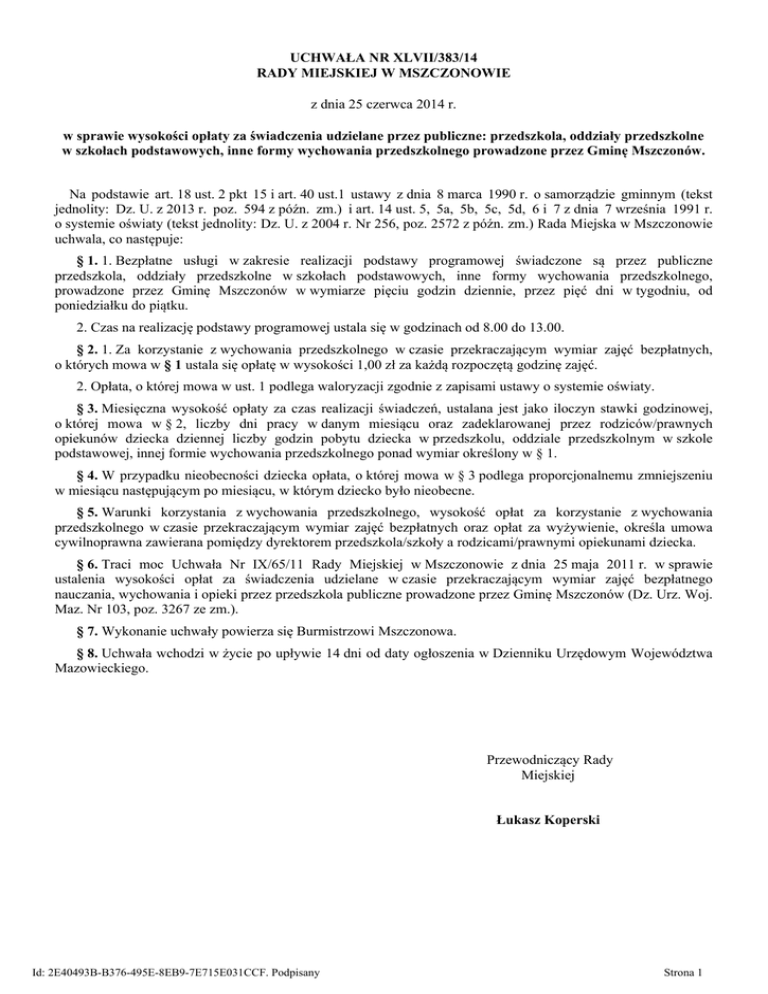 UCHWAŁA NR XLVII/383/14 RADY MIEJSKIEJ W MSZCZONOWIE z dnia 25 czerwca 2014 r. w sprawie wysokości opłaty za świadczenia udzielane przez publiczne: przedszkola, oddziały przedszkolne w szkołach podstawowych, inne formy wychowania przedszkolnego prowadzone przez Gminę Mszczonów. Na podstawie art. 18 ust. 2 pkt 15 i art. 40 ust.1 ustawy z dnia 8 marca 1990 r. o samorządzie gminnym (tekst jednolity: Dz. U. z 2013 r. poz. 594 z późn. zm.) i art. 14 ust. 5, 5a, 5b, 5c, 5d, 6 i 7 z dnia 7 września 1991 r. o systemie oświaty (tekst jednolity: Dz. U. z 2004 r. Nr 256, poz. 2572 z późn. zm.) Rada Miejska w Mszczonowie uchwala, co następuje: § 1. 1. Bezpłatne usługi w zakresie realizacji podstawy programowej świadczone są przez publiczne przedszkola, oddziały przedszkolne w szkołach podstawowych, inne formy wychowania przedszkolnego, prowadzone przez Gminę Mszczonów w wymiarze pięciu godzin dziennie, przez pięć dni w tygodniu, od poniedziałku do piątku. 2. Czas na realizację podstawy programowej ustala się w godzinach od 8.00 do 13.00. § 2. 1. Za korzystanie z wychowania przedszkolnego w czasie przekraczającym wymiar zajęć bezpłatnych, o których mowa w § 1 ustala się opłatę w wysokości 1,00 zł za każdą rozpoczętą godzinę zajęć. 2. Opłata, o której mowa w ust. 1 podlega waloryzacji zgodnie z zapisami ustawy o systemie oświaty. § 3. Miesięczna wysokość opłaty za czas realizacji świadczeń, ustalana jest jako iloczyn stawki godzinowej, o której mowa w § 2, liczby dni pracy w danym miesiącu oraz zadeklarowanej przez rodziców/prawnych opiekunów dziecka dziennej liczby godzin pobytu dziecka w przedszkolu, oddziale przedszkolnym w szkole podstawowej, innej formie wychowania przedszkolnego ponad wymiar określony w § 1. § 4. W przypadku nieobecności dziecka opłata, o której mowa w § 3 podlega proporcjonalnemu zmniejszeniu w miesiącu następującym po miesiącu, w którym dziecko było nieobecne. § 5. Warunki korzystania z wychowania przedszkolnego, wysokość opłat za korzystanie z wychowania przedszkolnego w czasie przekraczającym wymiar zajęć bezpłatnych oraz opłat za wyżywienie, określa umowa cywilnoprawna zawierana pomiędzy dyrektorem przedszkola/szkoły a rodzicami/prawnymi opiekunami dziecka. § 6. Traci moc Uchwała Nr IX/65/11 Rady Miejskiej w Mszczonowie z dnia 25 maja 2011 r. w sprawie ustalenia wysokości opłat za świadczenia udzielane w czasie przekraczającym wymiar zajęć bezpłatnego nauczania, wychowania i opieki przez przedszkola publiczne prowadzone przez Gminę Mszczonów (Dz. Urz. Woj. Maz. Nr 103, poz. 3267 ze zm.). § 7. Wykonanie uchwały powierza się Burmistrzowi Mszczonowa. § 8. Uchwała wchodzi w życie po upływie 14 dni od daty ogłoszenia w Dzienniku Urzędowym Województwa Mazowieckiego. Przewodniczący Rady Miejskiej Łukasz Koperski Id: 2E40493B-B376-495E-8EB9-7E715E031CCF. Podpisany Strona 1