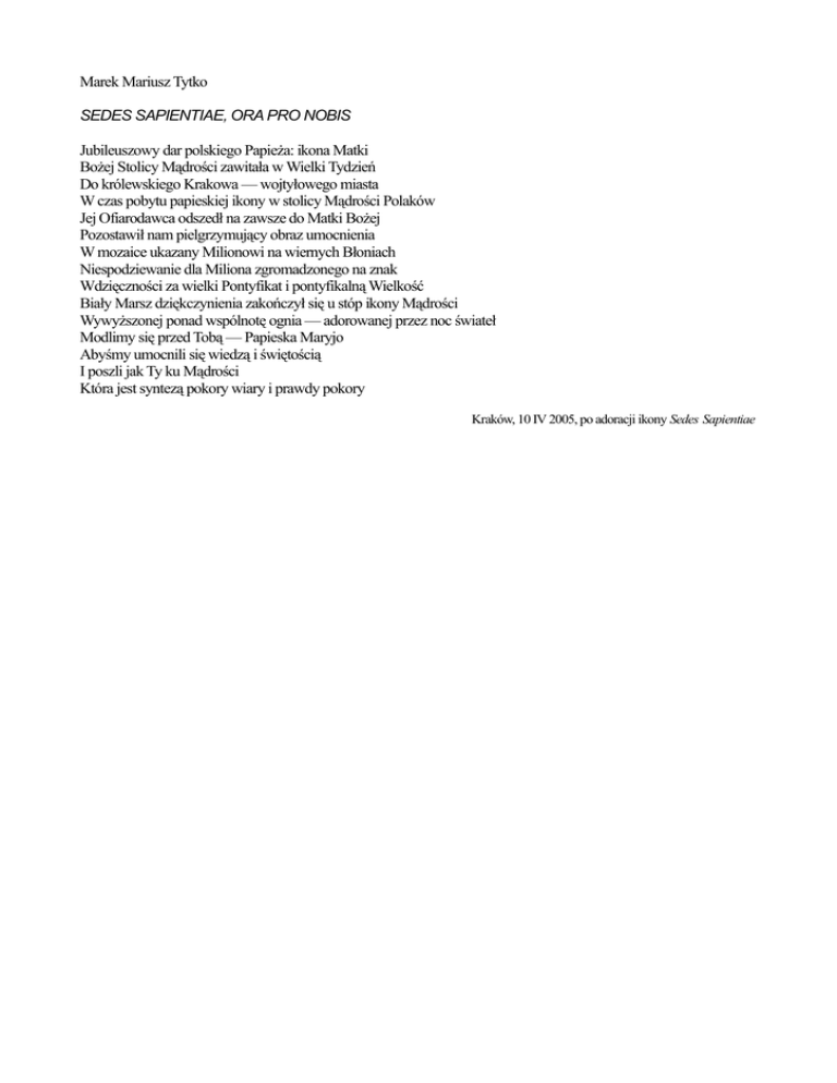 Marek Mariusz Tytko SEDES SAPIENTIAE, ORA PRO NOBIS Jubileuszowy dar polskiego Papieża: ikona Matki Bożej Stolicy Mądrości zawitała w Wielki Tydzień Do królewskiego Krakowa — wojtyłowego miasta W czas pobytu papieskiej ikony w stolicy Mądrości Polaków Jej Ofiarodawca odszedł na zawsze do Matki Bożej Pozostawił nam pielgrzymujący obraz umocnienia W mozaice ukazany Milionowi na wiernych Błoniach Niespodziewanie dla Miliona zgromadzonego na znak Wdzięczności za wielki Pontyfikat i pontyfikalną Wielkość Biały Marsz dziękczynienia zakończył się u stóp ikony Mądrości Wywyższonej ponad wspólnotę ognia — adorowanej przez noc świateł Modlimy się przed Tobą — Papieska Maryjo Abyśmy umocnili się wiedzą i świętością I poszli jak Ty ku Mądrości Która jest syntezą pokory wiary i prawdy pokory Kraków, 10 IV 2005, po adoracji ikony Sedes Sapientiae