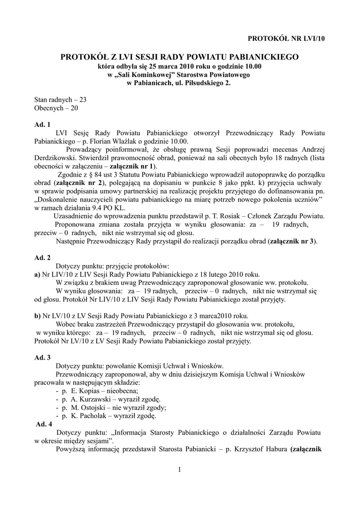 PROTOKÓŁ NR LVI/10 PROTOKÓŁ Z LVI SESJI RADY POWIATU PABIANICKIEGO która odbyła się 25 marca 2010 roku o godzinie 10.00 w „Sali Kominkowej” Starostwa Powiatowego w Pabianicach, ul. Piłsudskiego 2. Stan radnych – 23 Obecnych – 20 Ad. 1 LVI Sesję Rady Powiatu Pabianickiego otworzył Przewodniczący Rady Powiatu Pabianickiego – p. Florian Wlaźlak o godzinie 10.00. Prowadzący poinformował, że obsługę prawną Sesji poprowadzi mecenas Andrzej Derdzikowski. Stwierdził prawomocność obrad, ponieważ na sali obecnych było 18 radnych (lista obecności w załączeniu – załącznik nr 1). Zgodnie z § 84 ust 3 Statutu Powiatu Pabianickiego wprowadził autopoprawkę do porządku obrad (załącznik nr 2), polegającą na dopisaniu w punkcie 8 jako ppkt. k) przyjęcia uchwały w sprawie podpisania umowy partnerskiej na realizację projektu przyjętego do dofinansowania pn. „Doskonalenie nauczycieli powiatu pabianickiego na miarę potrzeb nowego pokolenia uczniów” w ramach działania 9.4 PO KL. Uzasadnienie do wprowadzenia punktu przedstawił p. T. Rosiak – Członek Zarządu Powiatu. Proponowana zmiana została przyjęta w wyniku głosowania: za – 19 radnych, przeciw – 0 radnych, nikt nie wstrzymał się od głosu. Następnie Przewodniczący Rady przystąpił do realizacji porządku obrad (załącznik nr 3). Ad. 2 Dotyczy punktu: przyjęcie protokołów: a) Nr LIV/10 z LIV Sesji Rady Powiatu Pabianickiego z 18 lutego 2010 roku. W związku z brakiem uwag Przewodniczący zaproponował głosowanie ww. protokołu. W wyniku głosowania: za – 19 radnych, przeciw – 0 radnych, nikt nie wstrzymał się od głosu. Protokół Nr LIV/10 z LIV Sesji Rady Powiatu Pabianickiego został przyjęty. b) Nr LV/10 z LV Sesji Rady Powiatu Pabianickiego z 3 marca2010 roku. Wobec braku zastrzeżeń Przewodniczący przystąpił do głosowania ww. protokołu, w wyniku którego: za – 19 radnych, przeciw – 0 radnych, nikt nie wstrzymał się od głosu. Protokół Nr LV/10 z LV Sesji Rady Powiatu Pabianickiego został przyjęty. Ad. 3 Dotyczy punktu: powołanie Komisji Uchwał i Wniosków. Przewodniczący zaproponował, aby w dniu dzisiejszym Komisja Uchwał i Wniosków pracowała w następującym składzie: - p. E. Kopias – nieobecna; - p. A. Kurzawski – wyraził zgodę. - p. M. Ostojski – nie wyraził zgody; - p. K. Pacholak – wyraził zgodę. Ad. 4 Dotyczy punktu: „Informacja Starosty Pabianickiego o działalności Zarządu Powiatu w okresie między sesjami”. Powyższą informację przedstawił Starosta Pabianicki – p. Krzysztof Habura (załącznik 1 nr 4). P. P. Piechota – czy nowym Sekretarzem powiatu, wybranym w drodze konkursu, będzie osoba spoza powiatu? Starosta – konkurs został rozstrzygnięty. Wybranym został pan Krzysztof Leśniak – prawnik z długoletnim doświadczeniem w pracy samorządowej. Pracował m.in. w ŁUW, trzech Ministerstwach, Urzędzie Zamówień Publicznych w Warszawie, szpitalu w Warszawie oraz w USC w Moszczenicy jako kierownik. Ad. 5 Dotyczy punktu: udzielanie odpowiedzi na interpelacje i zapytania radnych z poprzednich Sesji. Przewodniczący poinformował, że wszystkie odpowiedzi zostały udzielone na Sesji. Ad. 6 Dotyczy punktu: interpelacje i zapytania radnych. Pan Waldemar Flajszer - w związku z prośbą mieszkańców gminy Pabianice, zwrócił się z zapytaniem, czy w Pawlikowicach prowadzone są odwierty celem wtłaczania dwutlenku węgla, czy Starostwo posiada wiedzę na temat tych prac, czy Starosta wyraził zgodę na powyższe? Pan Józef Wiaderek zwrócił się z zapytaniami dotyczącymi: – sprzątania dróg powiatowych, które jest zlecane firmom zewnętrznym. Wyraził zdanie, że zakupiony sprzęt jest niewykorzystywany. Czy Zarząd będzie zlecał wykonywanie tych zadań, a sprzęt zostanie sprzedany? Nadmienił, że apelował kilkakrotnie o zwiększenie liczby pracowników fizycznych w Wydziale Dróg i Mostów; – bardzo złego stanu dróg na terenie gminy Lutomiersk, w szczególności w miejscowości Porszewice, gdzie potrzebne jest podjęcie działań doraźnych, bowiem droga asfaltowa przekształciła się w drogę gruntową; – remontów cząstkowych na drodze między Kazimierzem a Puczniewem. Ad. 7 Dotyczy punktu: Realizacja Powiatowego Programu Promocji Zatrudnienia i Aktywizacji Lokalnego Rynku Pracy za 2009 rok. Powyższą informację przedstawili: dyrektor PUP w Pabianicach – p. Bogusław Oswald oraz pani Paulina Kukielińska – pracownik PUP (załącznik nr 5). Przewodniczący Komisji Budżetu i Finansów, Spraw Obywatelskich, Promocji oraz Rozwoju Powiatu poinformowali o zapoznaniu się członków komisji z ww. informacją. Wobec braku głosów sprzeciwu informacja została przyjęta. Ad. 8 Dotyczy punktu: Przyjęcie uchwał w sprawie: a) ,,Powiatowego programu promocji zatrudnienia oraz aktywizacji lokalnego rynku pracy 2010”. Powyższy punkt omówił dyrektor PUP. Przewodniczący Komisji Budżetu i Finansów, Spraw Obywatelskich, Promocji oraz Rozwoju Powiatu poinformowali o pozytywnym zaopiniowaniu projektu uchwały. Radny Z. Skowroński podkreślił, że praca PUP jest na wysokim poziomie, a działania dyrektora cechują się niekwestionowaną fachowością. W związku z brakiem głosów w dyskusji Przewodniczący przystąpił do głosowania imiennego ww. projektu uchwały. W wyniku głosowania (załącznik nr 6): za – 19 radnych, przeciw – 0 radnych, nikt nie wstrzymał się od głosu 2 Uchwała Nr LVI /382/10 w sprawie ,,Powiatowego programu promocji zatrudnienia oraz aktywizacji lokalnego rynku pracy 2010”została podjęta. b) przyjęcia sprawozdania Zarządu Powiatu Pabianickiego dotyczącego realizacji współpracy z organizacjami pozarządowymi w roku 2009. Projekt uchwały omówił Naczelnik Wydziału Infrastruktury Społecznej i Spraw Obywatelskich Starostwa Powiatowego – p. Jacek Barasiński. Przewodniczący Komisji Budżetu i Finansów, Oświaty i Wychowania, Spraw Obywatels