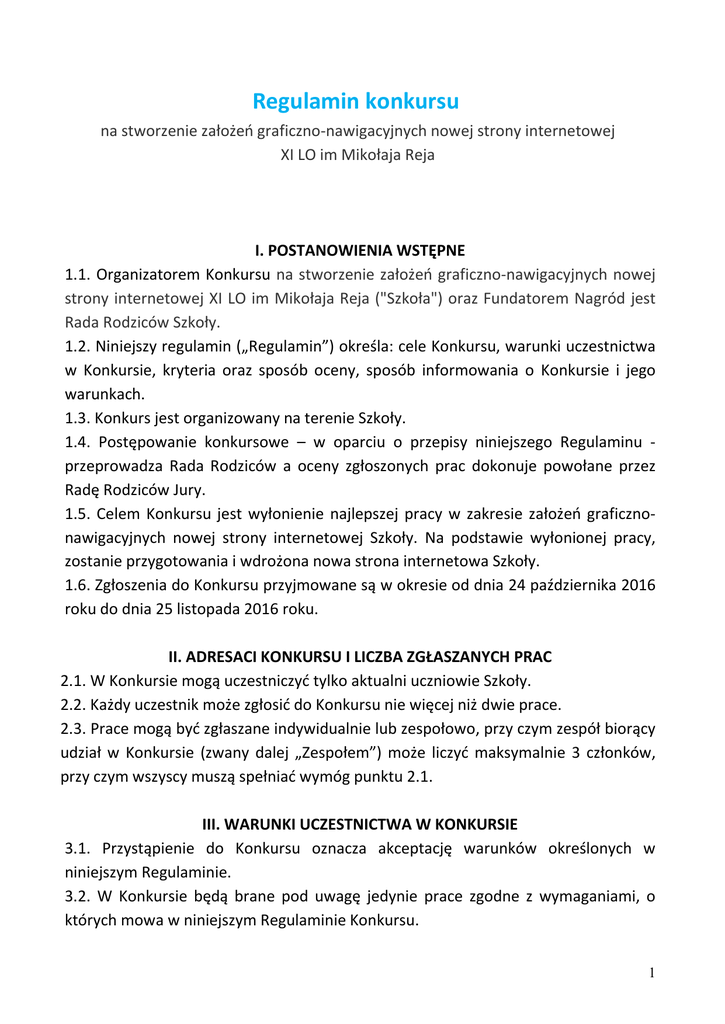 1.5. Celem Konkursu jest wyłonienie najlepszej pracy w zakresie założeń graficznonawigacyjnych nowej strony internetowej Szkoły. Na podstawie wyłonionej pracy,