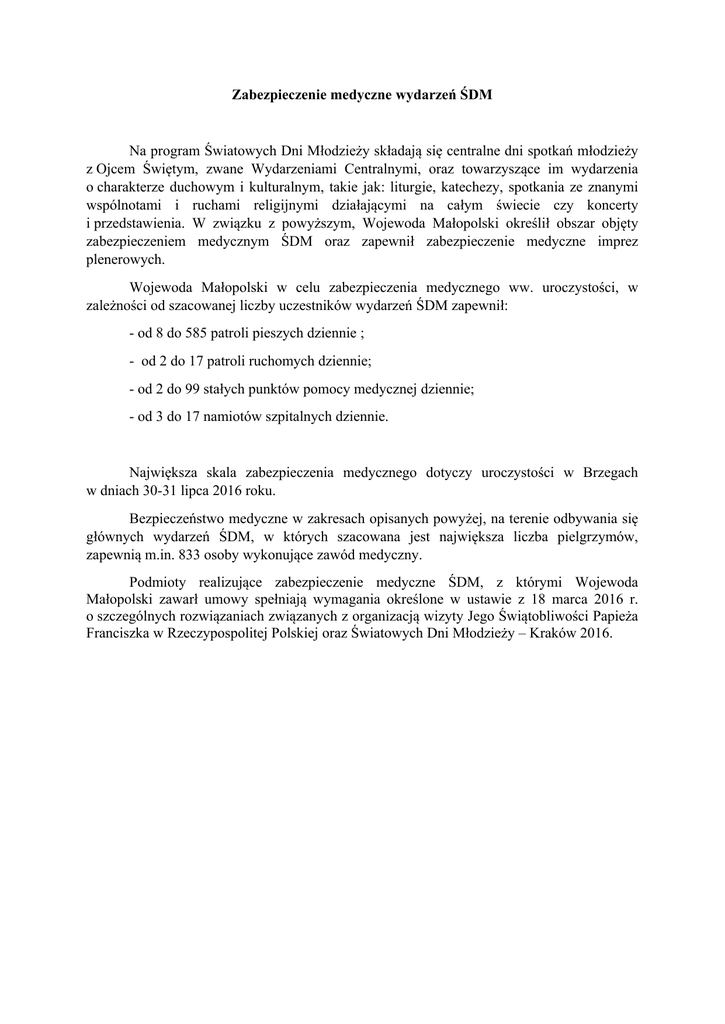 Zabezpieczenie medyczne wydarzeń ŚDM Na program Światowych Dni Młodzieży składają się centralne dni spotkań młodzieży z Ojcem Świętym, zwane Wydarzeniami Centralnymi, oraz towarzyszące im wydarzenia o charakterze duchowym i kulturalnym, takie jak: liturgie, katechezy, spotkania ze znanymi wspólnotami i ruchami religijnymi działającymi na całym świecie czy koncerty i przedstawienia. W związku z powyższym, Wojewoda Małopolski określił obszar objęty zabezpieczeniem medycznym ŚDM oraz zapewnił zabezpieczenie medyczne imprez plenerowych. Wojewoda Małopolski w celu zabezpieczenia medycznego ww. uroczystości, w zależności od szacowanej liczby uczestników wydarzeń ŚDM zapewnił: - od 8 do 585 patroli pieszych dziennie ; - od 2 do 17 patroli ruchomych dziennie; - od 2 do 99 stałych punktów pomocy medycznej dziennie; - od 3 do 17 namiotów szpitalnych dziennie. Największa skala zabezpieczenia medycznego dotyczy uroczystości w Brzegach w dniach 30-31 lipca 2016 roku. Bezpieczeństwo medyczne w zakresach opisanych powyżej, na terenie odbywania się głównych wydarzeń ŚDM, w których szacowana jest największa liczba pielgrzymów, zapewnią m.in. 833 osoby wykonujące zawód medyczny. Podmioty realizujące zabezpieczenie medyczne ŚDM, z którymi Wojewoda Małopolski zawarł umowy spełniają wymagania określone w ustawie z 18 marca 2016 r. o szczególnych rozwiązaniach związanych z organizacją wizyty Jego Świątobliwości Papieża Franciszka w Rzeczypospolitej Polskiej oraz Światowych Dni Młodzieży – Kraków 2016.
