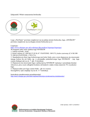 Załącznik 3 Wzór oznaczenia breloczka Logo „FlorNatur” powinno znajdować się na jednej stronie breloczka, logo „NFOŚiGW” powinno znajdować się na drugiej stronie breloczka (j.w) Logotypy: http://www.nfosigw.gov.pl/o-nfosigw/dla-mediow/logotypy/logotypy/ Wymaganie jakie musi spełnia logo NFOŚiGW 1. rodzaj czcionki: Arial, 2. Kolor zielony (C:100 M:0 Y:83 K:47 PANTONE: 349 CV), kolor czerwony (C:4 M:100 Y:100 K:0 PANTONE: 1795 CV); 3. Standardowym tłem logo kolorowego jest kolor biały, przy czym dopuszcza się stosowanie innego koloru tła niż biały, np. w przypadku jednobarwnego loga NFOŚiGW – (np. loga czarno-białego) jak na str. 7. pkt. 8 instrukcji. 4. Dopuszcza się stosowanie logo z pełną nazwą NFOŚIGW wpisaną w prostokąta (kontur włosowy), przy czym odległość konturu od krańców znaku winna stanowić 5% wysokości logo. 5. Dopuszczalne jest logo czarno-białe - jak we wzorze. Szczegółowy opis znajduje się na str. 5-7 instrukcji. Instrukcja oznakowania przedsięwzięć: http://www.nfosigw.gov.pl/srodki-krajowe/instrukcja-oznakowania-przedsiewziec/ Znak sprawy: ZO/7.1/10/2013 Dofinansowano ze środków Narodowego Funduszu Ochrony Środowiska i Gospodarki Wodnej w Warszawie