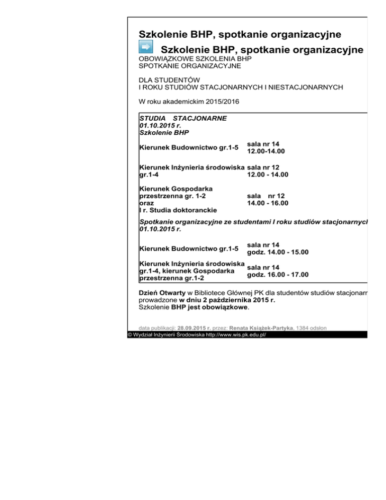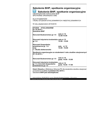 Szkolenie BHP, spotkanie organizacyjne Szkolenie BHP, spotkanie organizacyjne OBOWIĄZKOWE SZKOLENIA BHP SPOTKANIE ORGANIZACYJNE DLA STUDENTÓW I ROKU STUDIÓW STACJONARNYCH I NIESTACJONARNYCH W roku akademickim 2015/2016 STUDIA STACJONARNE 01.10.2015 r. Szkolenie BHP sala nr 14 12.00-14.00 Kierunek Inżynieria środowiska sala nr 12 gr.1-4 12.00 - 14.00 Kierunek Gospodarka przestrzenna gr. 1-2 sala nr 12 oraz 14.00 - 16.00 I r. Studia doktoranckie Kierunek Budownictwo gr.1-5 Spotkanie organizacyjne ze studentami I roku studiów stacjonarnych 01.10.2015 r. Kierunek Budownictwo gr.1-5 sala nr 14 godz. 14.00 - 15.00 Kierunek Inżynieria środowiska sala nr 14 gr.1-4, kierunek Gospodarka godz. 16.00 - 17.00 przestrzenna gr.1-2 Dzień Otwarty w Bibliotece Głównej PK dla studentów studiów stacjonarnych b prowadzone w dniu 2 października 2015 r. Szkolenie BHP jest obowiązkowe. data publikacji: 28.09.2015 r. przez: Renata Książek-Partyka, 1384 odsłon © Wydział Inżynierii Środowiska http://www.wis.pk.edu.pl/
