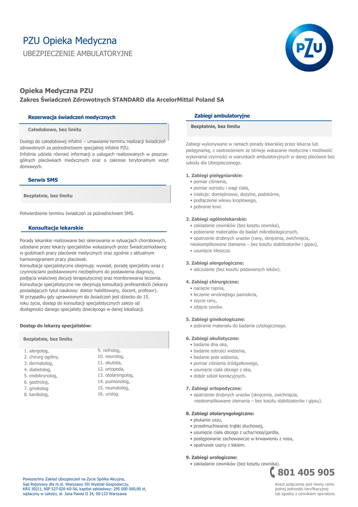 PZU Opieka Medyczna UBEZPIECZENIE AMBULATORYJNE Opieka Medyczna PZU Zakres Świadczeń Zdrowotnych STANDARD dla ArcelorMittal Poland SA Rezerwacja świadczeń medycznych Zabiegi ambulatoryjne Bezpłatnie, bez limitu Całodobowo, bez limitu Dostęp do całodobowej infolinii – umawianie terminu realizacji świadczeń zdrowotnych za pośrednictwem specjalnej infolinii PZU. Infolinia udziela również informacji o usługach realizowanych w poszczególnych placówkach medycznych oraz o zakresie terytorialnym wizyt domowych. Zabiegi wykonywane w ramach porady lekarskiej przez lekarza lub pielęgniarkę, z zastrzeżeniem że istnieje wskazanie medyczne i możliwość wykonania czynności w warunkach ambulatoryjnych w danej placówce bez szkody dla Ubezpieczonego. 1. Zabiegi pielęgniarskie: • pomiar ciśnienia, • pomiar wzrostu i wagi ciała, • iniekcje: domięśniowe, dożylne, podskórne, • podłączenie wlewu kroplowego, • pobranie krwi. Serwis SMS Bezpłatnie, bez limitu Potwierdzenie terminu świadczeń za pośrednictwem SMS. Konsultacje lekarskie Porady lekarskie realizowane bez skierowania w sytuacjach chorobowych, udzielane przez lekarzy specjalistów wskazanych przez Świadczeniodawcę w godzinach pracy placówek medycznych oraz zgodnie z aktualnym harmonogramem pracy placówek. Konsultacje specjalistyczne obejmują: wywiad, poradę specjalisty wraz z czynnościami podstawowymi niezbędnymi do postawienia diagnozy, podjęcia właściwej decyzji terapeutycznej oraz monitorowania leczenia. Konsultacje specjalistyczne nie obejmują konsultacji profesorskich (lekarzy posiadających tytuł naukowy: doktor habilitowany, docent, profesor). W przypadku gdy uprawnionym do świadczeń jest dziecko do 15. roku życia, dostęp do konsultacji specjalistycznych zależy od dostępności danego specjalisty dziecięcego w danej lokalizacji. Bezpłatnie, bez limitu alergolog, chirurg ogólny, dermatolog, diabetolog, endokrynolog, gastrolog, ginekolog kardiolog, 3. Zabiegi alergologiczne: • odczulanie (bez kosztu podawanych leków). 4. Zabiegi chirurgiczne: • nacięcie ropnia, • leczenie wrośniętego paznokcia, • szycie rany, • zdjęcie szwów. 5. Zabiegi ginekologiczne: • pobranie materiału do badania cytologicznego. Dostęp do lekarzy specjalistów: 1. 2. 3. 4. 5. 6. 7. 8. 2. Zabiegi ogólnolekarskie: • zakładanie cewników (bez kosztu cewnika), • pobieranie materiałów do badań mikrobiologicznych, • opatrzenie drobnych urazów (rany, skręcenia, zwichnięcia, nieskomplikowane złamania – bez kosztu stabilizatorów i gipsu), • usunięcie kleszcza. 9. nefrolog, 10. neurolog, 11. okulista, 12. ortopeda, 13. otolaryngolog, 14. pulmonolog, 15. reumatolog, 16. urolog. 6. Zabiegi okulistyczne: • badanie dna oka, • badanie ostrości widzenia, • badanie pola widzenia, • pomiar ciśnienia śródgałkowego, • usunięcie ciała obcego z oka, • dobór szkieł korekcyjnych. 7. Zabiegi ortopedyczne: • opatrzenie drobnych urazów (skręcenia, zwichnięcia, nieskomplikowane złamania – bez kosztu stabilizatorów i gipsu). 8. Zabiegi otolaryngologiczne: • płukanie uszu, • przedmuchiwanie trąbki słuchowej, • usunięcie ciała obcego z ucha/nosa/gardła, • postępowanie zachowawcze w krwawieniu z nosa, • opatrunek uszny z lekiem. 9. Zabiegi urologiczne: • zakładanie cewników (bez kosztu cewnika). Powszechny Zakład Ubezpieczeń na Życie Spółka Akcyjna, Sąd Rejonowy dla m.st. Warszawy XII Wydział Gospodarczy, KRS 30211, NIP 527-020-60-56, kapitał zakładowy: 295 000 000,00 zł, wpłacony w całości, al. Jana Pawła II 24, 00-133 Warszawa 801 405 905 Koszt połączenia jest równy cenie jednej jednostki taryfikacyjnej lub zgodny z cennikiem operatora. Diagnostyka laboratoryjna Diagnostyka realizowana zgodnie ze wskazaniami medycznymi na podstawie skierowania od lekarza Świadczeniodawcy w placówkach wskazanych przez Świadczeniodawcę za pośrednictwem infolinii medycznej. 6. 1. Badania biochemiczne: 7. Bezpłatnie, bez limitu • posiew z rany, • badanie ogólne moczu, • kreatynina w moczu. 8. 2. Badania serologiczne i immunologiczne: •cytologia wymazu z szyjki macicy (z wyłączeniem cytologii płynnej). 15% zniżki, bez limitu biopsja cienkoigłowa tarczycy pod kontrolą USG (z możliwością wykonania badania histopatologicznego), skórne testy alergiczne – panel pokarmowy, skórne testy alergiczne – panel wziewny, skórne testy alergiczne – panel mieszany. Bezpłatnie, bez limitu oznaczenie grupy krwi układu A, B, O, Rh(D) z oceną hemolizyn, odczyn Waalera-Rosego, przeciwciała przeciw HBs. 3. Badania hormonalne: 15% zniżki, bez limitu 4. aldosteron, dehydroepiandrosteronu siarczan (DHEAS), estradiol, hormon adrenokortykotropowy (ACTH), hormon folikulotropowy (FSH), hormon luteinizujący (LH), kortyzol, osteokalcyna, parathormon (PTH), progesteron, prolaktyna (PRL), testosteron, trijodotyronina całkowita (TT3), trijodotyronina wolna (fT3), tyroksyna całkowita (TT4), tyroksyna wolna (fT4). Badania immunologiczne: Diagnostyka radiologiczna Diagnostyka realizowana zgodnie ze wskazaniami medycznymi na podstawie skierowania od lekarza Świadczeniodawcy we wskazanych przez Świadczeniodawcę placówkach za pośrednictwem infolinii medycznej. 15% zniżki, bez limitu mammografia, urografia (zdjęcie nerek, moczowodów i pęcherza), wlew doodbytniczy. Diagnostyka ultrasonograficzna Realizowana zgodnie ze wskazaniami medycznymi na podstawie skierowania od lekarza Świadczeniodawcy w placówkach wskazanych przez Świadczeniodawcę za pośrednictwem infolinii medycznej. Nie obejmuje badań USG 4-D i USG genetycznego. Bezpłatnie, bez limitu 15% zniżki, bez limitu • immunoglobulina E całkowite (IgE), • przeciwciała przeciw peroksydazie tarczycowej (ATPO), • przeciwciała przeciw tyreoglobulinie (ATG). 5. Badania wirusologiczne: 15% zniżki, bez limitu antygen HBe, przeciwciała przeciw przeciwciała przeciw przeciwciała przec