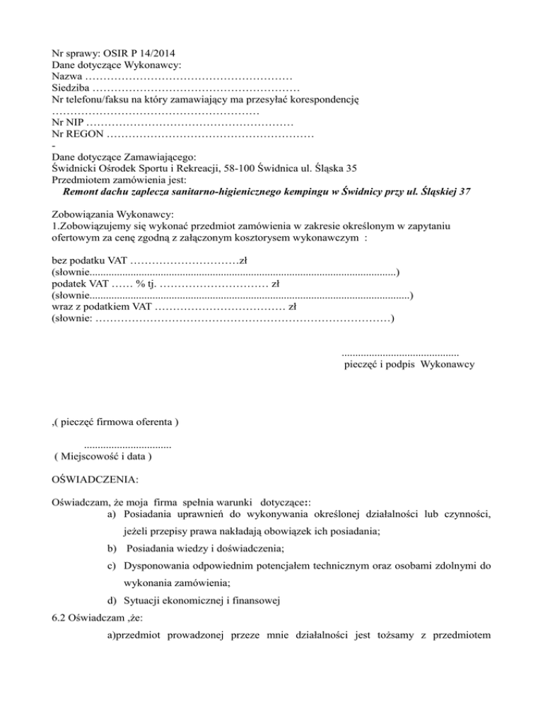 Nr sprawy: OSIR P 14/2014 Dane dotyczące Wykonawcy: Nazwa ………………………………………………… Siedziba ………………………………………………… Nr telefonu/faksu na który zamawiający ma przesyłać korespondencję ………………………………………………… Nr NIP ………………………………………………… Nr REGON ………………………………………………… Dane dotyczące Zamawiającego: Świdnicki Ośrodek Sportu i Rekreacji, 58-100 Świdnica ul. Śląska 35 Przedmiotem zamówienia jest: Remont dachu zaplecza sanitarno-higienicznego kempingu w Świdnicy przy ul. Śląskiej 37 Zobowiązania Wykonawcy: 1.Zobowiązujemy się wykonać przedmiot zamówienia w zakresie określonym w zapytaniu ofertowym za cenę zgodną z załączonym kosztorysem wykonawczym : bez podatku VAT …………………………zł (słownie................................................................................................................) podatek VAT …… % tj. ………………………… zł (słownie.....................................................................................................................) wraz z podatkiem VAT ……………………………… zł (słownie: ………………………………………………………………………) ........................................... pieczęć i podpis Wykonawcy ,( pieczęć firmowa oferenta ) ................................ ( Miejscowość i data ) OŚWIADCZENIA: Oświadczam, że moja firma spełnia warunki dotyczące:: a) Posiadania uprawnień do wykonywania określonej działalności lub czynności, jeżeli przepisy prawa nakładają obowiązek ich posiadania; b) Posiadania wiedzy i doświadczenia; c) Dysponowania odpowiednim potencjałem technicznym oraz osobami zdolnymi do wykonania zamówienia; d) Sytuacji ekonomicznej i finansowej 6.2 Oświadczam ,że: a)przedmiot prowadzonej przeze mnie działalności jest tożsamy z przedmiotem zamówienia b) w stosunku do firmy nie otwarto likwidacji i nie ogłoszono upadłości c) jestem związany ofertą do dnia podpisania umowy d) na bieżąco regulujemy należności wobec ZUS e) akceptuję wzór umowy i termin wykonania prac – 2 tygodnie od daty podpisania umowy .......................................... pieczęć i podpis Wykonawcy DOŚWIADCZENIE ZAWODOWE Oświadczamy, że reprezentowana przez nas firma/firmy zrealizowała/y w ciągu ostatnich 5 lat następujące zamówienia; Świdnica, dnia ….................... l.p. Nazwa i adres zamawiajacego 1 2 Miejsce wykonania i zakres prac(prace muszą potwierdzać spełniania warunków postawionych przez zamawiającego Wartość zamówienia brutto 4 5 Czas realizacji początek 6 koniec 7 …................................................. pieczęć i podpis Wykonawcy