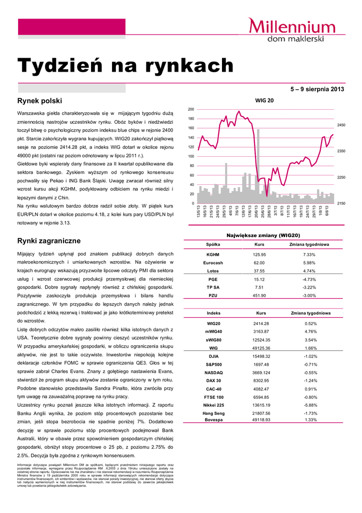 Tydzień na rynkach 5 – 9 sierpnia 2013 WIG 20 Rynek polski Warszawska giełda charakteryzowała się w mijającym tygodniu dużą zmiennością nastrojów uczestników rynku. Obóz byków i niedźwiedzi 200 180 toczył bitwę o psychologiczny poziom indeksu blue chips w rejonie 2400 160 pkt. Starcie zakończyła wygrana kupujących. WIG20 zakończył piątkową 140 sesje na poziomie 2414.28 pkt, a indeks WIG dotarł w okolice rejonu 120 49000 pkt (ostatni raz poziom odnotowany w lipcu 2011 r.). 100 Giełdowe byki wspierały dany finansowe za II kwartał opublikowane dla sektora bankowego. Zyskiem wyższym od rynkowego konsensusu pochwaliły się Pekao i ING Bank Śląski. Uwagę zwracał również silny 2450 2350 80 60 2250 40 wzrost kursu akcji KGHM, podyktowany odbiciem na rynku miedzi i 20 6/8/13 1/8/13 29/7/13 24/7/13 19/7/13 16/7/13 8/7/13 11/7/13 3/7/13 28/6/13 25/6/13 20/6/13 17/6/13 7/6/13 12/6/13 4/6/13 29/5/13 24/5/13 2150 21/5/13 EUR/PLN dotarł w okolice poziomu 4.18, z kolei kurs pary USD/PLN był 0 16/5/13 Na rynku walutowym bardzo dobrze radził sobie złoty. W piątek kurs 13/5/13 lepszymi danymi z Chin. notowany w rejonie 3.13. Największe zmiany (WIG20) Rynki zagraniczne Spółka Kurs Zmiana tygodniowa Mijający tydzień upłynął pod znakiem publikacji dobrych danych KGHM 125.95 7.33% makroekonomicznych i umiarkowanych wzrostów. Na ożywienie w Eurocash 62.00 5.98% krajach eurogrupy wskazują przyzwoite lipcowe odczyty PMI dla sektora Lotos 37.55 4.74% usług i wzrost czerwcowej produkcji przemysłowej dla niemieckiej PGE 15.12 -4.73% gospodarki. Dobre sygnały napłynęły również z chińskiej gospodarki. TP SA 7.51 -3.22% PZU 451.90 -3.00% Pozytywnie zaskoczyła produkcja przemysłowa i bilans handlu zagranicznego. W tym przypadku do lepszych danych należy jednak podchodzić z lekką rezerwą i traktować je jako krótkoterminowy pretekst do wzrostów. Indeks Kurs Zmiana tygodniowa WIG20 2414.28 0.52% Listę dobrych odczytów makro zasiliło również kilka istotnych danych z mWIG40 3163.87 4.76% USA. Teoretycznie dobre sygnały powinny cieszyć uczestników rynku. sWIG80 12524.35 3.54% W przypadku amerykańskiej gospodarki, w obliczu ograniczenia skupu WIG 49125.36 1.66% aktywów, nie jest to takie oczywiste. Inwestorów niepokoją kolejne DJIA 15498.32 -1.02% deklaracje członków FOMC w sprawie ograniczenia QE3. Głos w tej S&P500 1697.48 -0.71% sprawie zabrał Charles Evans. Znany z gołębiego nastawienia Evans, NASDAQ 3669.124 -0.55% stwierdził że program skupu aktywów zostanie ograniczony w tym roku. DAX 30 8302.95 -1.24% Podobne stanowisko przedstawiła Sandra Pinalto, która zwróciła przy CAC-40 4082.47 0.91% FTSE 100 6594.85 -0.80% Uczestnicy rynku poznali jeszcze kilka istotnych informacji. Z raportu Nikkei 225 13615.19 -5.88% Banku Anglii wynika, że poziom stóp procentowych pozostanie bez Hang Seng 21807.56 -1.73% zmian, jeśli stopa bezrobocia nie spadnie poniżej 7%. Dodatkowo Bovespa 49118.93 1.33% tym uwagę na zauważalną poprawę na rynku pracy. decyzję w sprawie poziomu stóp procentowych podejmował Bank Australii, który w obawie przez spowolnieniem gospodarczym chińskiej gospodarki, obniżył stopy procentowe o 25 pb, z poziomu 2.75% do 2.5%. Decyzja była zgodna z rynkowym konsensusem. Informacje dotyczące powiązań Millennium DM ze spółkami, będącymi przedmiotem niniejszego raportu oraz pozostałe informacje, wymagane przez Rozporządzenie RM .X.2005 z dnia 19roku umieszczone zostały na ostatniej stronie raportu. Opracowanie nie ma charakteru i nie stanowi rekomendacji w rozumieniu Rozporządzenia Ministra finansów z 19 października 2005 roku w sprawie informacji stanowiących rekomendacje dotyczące instrumentów finansowych, ich emitentów i wystawców, nie stanowi porady inwestycyjnej, nie stanowi oferty zbycia lub nabycia wymienionych w niej instrumentów finansowych, nie stanowi podstawy do zawarcia jakiejkolwiek umowy lub powstania jakiegokolwiek zobowiązania. Sytuacja makroekonomiczna Ubiegły tydzień obfitował w dobre dane makroekonomiczne, napływające zarówno z Europy, USA, jak i Chin. Na początku tygodnia Waluta Kurs Zmiana tygodniowa pozytywnie zaskoczyły odczyty indeksów PMI z sektora usług, EURPLN 4.1874 -1.12% opublikowane dla krajów eurogrupy. Dla całej strefy euro w lipcu USDPLN 3.14 -1.53% wskaźnik ten wyniósł 49.8 pkt, o 0.2 pkt więcej niż prognozowano i CHFPLN 3.4053 -0.77% odnotowano w poprzednim miesiącu. GBPPLN 4.8686 -0.18% Seria dobrych danych napłynęła z USA. Indeks ISM dla usług wyniósł w EURU D 1.3373 1.29% lipcu 56 pkt, kiedy konsensus rynkowy kształtował się na poziomie 53 USDJPY 96.23 -2.74% Surowiec Kurs Zmiana tygodniowa Miedź 7157.5 2.10% Ropa 109.359 -0.08% Złoto 1314.66 0.15% Srebro 20.493 2.66% pkt. Z kolei deficyt handlu zagranicznego wyniósł w czerwcu 34.22 mld USD, o 9.28 mld USD mniej niż oczekiwali analitycy. Dodatkowo dobre sygnały napłynęły z rynku pracy, gidze w trakcie tygodnia zostało złożonych 333 tys. wniosków o zasiłek dla bezrobotnych, o 3 tys. mniej niż prognozowano. Z danych napływających z Chin uwagę zwróciła produkcja przemysłowa, która w lipcu wzrosła o 9.7% r/r, o 0.7 pp więcej niż prognozowano. Pozytywnie zaskoczył również lipcowy eksport, który odnotował wzrost o 5.1% r/r, kiedy konsensus rynkowy był niższy o 2.1 pp. Wybrane opublikowane wskaźniki makro Data Państwo Wskaźnik Okres Aktualna Prognoza Poprzednia 05.08.2013 Chiny Indeks PMI dla usług lipiec 51.3 - 51.3 05.08.2013 Francja Indeks PMI dla usług - fin. lipiec 48.6 48.3 48.3 05.08.2013 Niemcy Indeks PMI dla usług - fin. lipiec 51.3 52.5 52.5 05.08.2013 Strefa Euro Indeks PMI dla usług - fin. lipiec 49.8 49.6 49.6 05.08.2013 Wlk. Brytania Indeks PMI dla usług lipiec 60.2 57.2 56.9 05.08.2013 USA Indeks ISM dla usług lipiec 56 53 52.2 06.08.2013 Australia Decyzja RBA ws. stóp procentowych sierpień 2.5% 2.5% 2.75% 06.08.2013 Wlk. Brytan