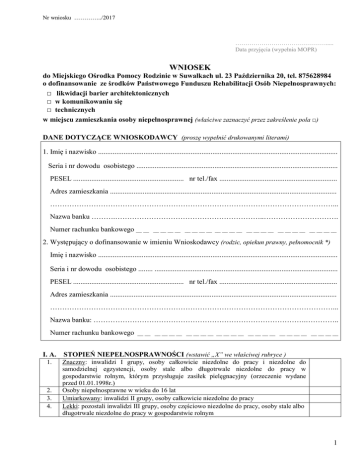 Nr wniosku …………../2017 ………………………………………..... Data przyjęcia (wypełnia MOPR) WNIOSEK do Miejskiego Ośrodka Pomocy Rodzinie w Suwałkach ul. 23 Października 20, tel. 875628984 o dofinansowanie ze środków Państwowego Funduszu Rehabilitacji Osób Niepełnosprawnych: □ likwidacji barier architektonicznych □ w komunikowaniu się □ technicznych w miejscu zamieszkania osoby niepełnosprawnej (właściwe zaznaczyć przez zakreślenie pola □) DANE DOTYCZĄCE WNIOSKODAWCY (proszę wypełnić drukowanymi literami) 1. Imię i nazwisko .................................................................................................................................... Seria i nr dowodu osobistego ............................................................................................................... PESEL ............................................................. nr tel./fax ................................................................. Adres zamieszkania ............................................................................................................................. ………………………………………………………………………………………………………... Nazwa banku ……….……………………………………………………..…………………………. Numer rachunku bankowego __ __ __ __ __ __ __ __ __ __ __ __ __ __ __ __ __ __ __ __ __ __ __ __ __ __ 2. Występujący o dofinansowanie w imieniu Wnioskodawcy (rodzic, opiekun prawny, pełnomocnik *) Imię i nazwisko .................................................................................................................................... Seria i nr dowodu osobistego ........ ..................................................................................................... PESEL ............................................................. nr tel./fax ................................................................. Adres zamieszkania ............................................................................................................................. ………………………………………………………………………………………………………... Nazwa banku: …………………………………………………………………………….………….. Numer rachunku bankowego __ __ __ __ __ __ __ __ __ __ __ __ __ __ __ __ __ __ __ __ __ __ __ __ __ __ I. A. STOPIEŃ NIEPEŁNOSPRAWNOŚCI (wstawić „X” we właściwej rubryce ) 1. 2. 3. 4. Znaczny: inwalidzi I grupy, osoby całkowicie niezdolne do pracy i niezdolne do samodzielnej egzystencji, osoby stale albo długotrwale niezdolne do pracy w gospodarstwie rolnym, którym przysługuje zasiłek pielęgnacyjny (orzeczenie wydane przed 01.01.1998r.) Osoby niepełnosprawne w wieku do 16 lat Umiarkowany: inwalidzi II grupy, osoby całkowicie niezdolne do pracy Lekki: pozostali inwalidzi III grupy, osoby częściowo niezdolne do pracy, osoby stale albo długotrwale niezdolne do pracy w gospodarstwie rolnym 1 RODZAJ NIEPEŁNOSPRAWNOŚCI (wstawić „X” we właściwej rubryce ) I. B. dysfunkcja ruchu z koniecznością poruszania się na wózkach inwalidzkich, wrodzony brak lub amputacja górnych, dolnych narządów ruchu inna dysfunkcja narządu ruchu dysfunkcja narządu wzroku dysfunkcja narządu słuchu i mowy deficyt rozwojowy (upośledzenie umysłowe) niepełnosprawność z ogólnego stanu zdrowia 1. 2. 3. 4. 5. 6. I. C. STOPIEŃ I RODZAJ NIEPEŁNOSPRAWNOŚCI OSÓB ZAMIESZKUJĄCYCH WSPÓLNIE Z WNIOSKODAWCĄ (wstawić oznaczenie cyfrowe z tabeli I A i I B) L.p. Imię i nazwisko Pokrewieństwo Stopień niepełnosprawności Rodzaj niepełnosprawności 1. 2. I.D. SYTUACJA ZAWODOWA (wstawić „X” we właściwej rubryce ) zatrudniony na umowę lub prowadzący działalność gospodarczą* osoby w wieku od 18 do 24 lat, uczące się w systemie szkolnym lub studiujące* bezrobotny poszukujący pracy/rencista poszukujący pracy/pobierający zasiłek socjalny* rencista/emeryt nie zainteresowany podjęciem pracy* dzieci i młodzież do 18 lat* 1. 2. 3. 4. 5. I.E. ŚREDNI MIESIĘCZNY DOCHÓD NA OSOBĘ W GOSPODARSTWIE DOMOWYM WNIOSKODAWCY (objaśnienia na stronie 5 - 6 wniosku ) Oświadczam, że średni miesięczny dochód, w rozumieniu przepisów o świadczeniach rodzinnych, podzielony przez liczbę osób we wspólnym gospodarstwie domowym, obliczony za kwartał poprzedzający miesiąc złożenia wniosku, wynosił: ................................... zł. Liczba osób pozostających we wspólnym gospodarstwie domowym ............ Posiadam uprawnienia kombatanckie* tak nie I.F. INFORMACJA O DOTYCHCZAS PRZYZNANYCH I ROZLICZONYCH KWOTACH ZE ŚRODKÓW PFRON (w ostatnich 3 latach przed złożeniem wniosku) Czy wnioskodawca korzystał ze środków PFRON Nr i data zawarcia Kwota Cel umowy /zł/ I.G. Tak: □ Nie: □ Termin rozliczenia Stan rozliczenia SYTUACJA MIESZKANIOWA – OPIS BUDYNKU I MIESZKANIA (dotyczy barier architektonicznych – właściwe podkreślić) 1. dom jednorodzinny, wielorodzinny prywatny, wielorodzinny komunalny, wielorodzinny spółdzielczy, inne .......................................................................................................................................................... 2. budynek parterowy, piętrowy, mieszkanie na ........................................... (proszę podać kondygnację) 2 przybliżony wiek budynku lub rok budowy ............................................................................................ opis mieszkania: pokoje ................ (podać liczbę), z kuchnią, bez kuchni, z łazienką, bez łazienki, z WC, bez WC 5. łazienka wyposażona jest w: wannę, brodzik, kabinę prysznicowa, umywalkę 6. w mieszkaniu jest: instalacja wody ciepłej, zimnej, kanalizacja, centralne ogrzewanie, prąd gaz 7. w jakim zakresie mieszkanie jest obecnie przystosowane do potrzeb os