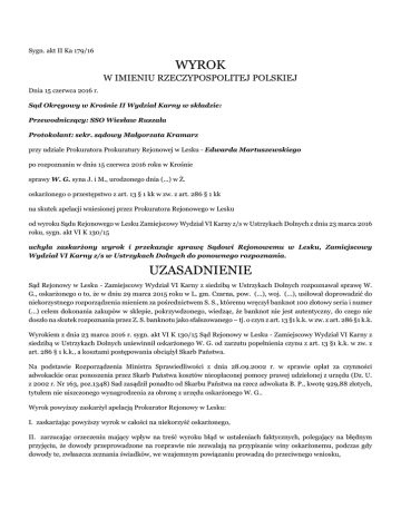Sygn. akt II Ka 179/16 WYROK W IMIENIU RZECZYPOSPOLITEJ POLSKIEJ Dnia 15 czerwca 2016 r. Sąd Okręgowy w Krośnie II Wydział Karny w składzie: Przewodniczący: SSO Wiesław Ruszała Protokolant: sekr. sądowy Małgorzata Kramarz przy udziale Prokuratora Prokuratury Rejonowej w Lesku - Edwarda Martuszewskiego po rozpoznaniu w dniu 15 czerwca 2016 roku w Krośnie sprawy W. G. syna J. i M., urodzonego dnia (...) w Ż. oskarżonego o przestępstwo z art. 13 § 1 kk w zw. z art. 286 § 1 kk na skutek apelacji wniesionej przez Prokuratora Rejonowego w Lesku od wyroku Sądu Rejonowego w Lesku Zamiejscowy Wydział VI Karny z/s w Ustrzykach Dolnych z dnia 23 marca 2016 roku, sygn. akt VI K 130/15 uchyla zaskarżony wyrok i przekazuje sprawę Sądowi Rejonowemu w Lesku, Zamiejscowy Wydział VI Karny z/s w Ustrzykach Dolnych do ponownego rozpoznania. UZASADNIENIE Sąd Rejonowy w Lesku - Zamiejscowy Wydział VI Karny z siedzibą w Ustrzykach Dolnych rozpoznawał sprawę W. G., oskarżonego o to, że w dniu 29 marca 2015 roku w L. gm. Czarna, pow. (...), woj. (...), usiłował doprowadzić do niekorzystnego rozporządzenia mieniem za pośrednictwem S. S., któremu wręczył banknot 100 złotowy seria i numer (...) celem dokonania zakupów w sklepie, pokrzywdzonego, wiedząc, że banknot nie jest autentyczny, do czego nie doszło na skutek rozpoznania przez Z. S. banknotu jako sfałszowanego – tj. o czyn z art. 13 §1 k.k. w zw. z art. 286 §1 k.k. Wyrokiem z dnia 23 marca 2016 r. sygn. akt VI K 130/15 Sąd Rejonowy w Lesku - Zamiejscowy Wydział VI Karny z siedzibą w Ustrzykach Dolnych uniewinnił oskarżonego W. G. od zarzutu popełnienia czynu z art. 13 §1 k.k. w zw. z art. 286 § 1 k.k., a kosztami postępowania obciążył Skarb Państwa. Na podstawie Rozporządzenia Ministra Sprawiedliwości z dnia 28.09.2002 r. w sprawie opłat za czynności adwokackie oraz ponoszenia przez Skarb Państwa kosztów nieopłaconej pomocy prawej udzielonej z urzędu (Dz. U. z 2002 r. Nr 163, poz.1348) Sad zasądził ponadto od Skarbu Państwa na rzecz adwokata B. P., kwotę 929,88 złotych, tytułem nie uiszczonego wynagrodzenia za obronę z urzędu oskarżonego W. G.. Wyrok powyższy zaskarżył apelacją Prokurator Rejonowy w Lesku: I. zaskarżając powyższy wyrok w całości na niekorzyść oskarżonego, II. zarzucając orzeczeniu mający wpływ na treść wyroku błąd w ustaleniach faktycznych, polegający na błędnym przyjęciu, że dowody przeprowadzone na rozprawie nie zezwalają na przypisanie winy oskarżonemu, podczas gdy dowody te, zwłaszcza zeznania świadków, we wzajemnym powiązaniu prowadzą do przeciwnego wniosku, III. wnosząc o uchylenie wyroku i przekazanie sprawy sądowi I instancji do ponownego rozpoznania. Sąd Odwoławczy zważył, co następuje: Apelacja Prokuratora Rejonowego jest uzasadniona i w związku z tym wniosek tej apelacji, o uchylenie zaskarżonego wyroku i przekazanie sprawy Sądowi Rejonowemu do ponownego rozpoznania zasługiwał na uwzględnienie. Sąd I instancji, po przeprowadzeniu dokładnego postępowania dowodowego istotnie dokonał błędnego ustalenia, że zgromadzony w toku rozprawy materiał dowodowy nie pozwala na przypisanie oskarżonemu dokonania zarzucanego mu przestępstwa. Zbędnie przy tym powołał się Sąd Orzekający na zasadę, iż nie dające się usunąć wątpliwości należy tłumaczyć na korzyść oskarżonego, skoro jednocześnie we wcześniejszym fragmencie uzasadnienia wyroku stwierdził, iż wyjaśnienia oskarżonego uznał za konsekwentne i wiarygodne, a zeznania S. S. za niewiarygodne i złożone jedynie po to aby uniknął on odpowiedzialności karnej za podjętą próbę zapłacenia za zakupy w sklepie (...) fałszywym banknotem 100 złotowym. Podstawę dokonania takich błędnych ustaleń faktycznych stanowiła przy tym ocena dowodów, odnośnie której nie sposób stwierdzić, że dokonana została ona w granicach zakreślonych przepisem art. 7 k.p.k., a zwłaszcza, że dokonana została z uwzględnieniem zasad logiki i doświadczenia życiowego. Ustalając, iż S. S. sam, w nieustalonym momencie i okolicznościach, zabrać miał z domu oskarżonego nieoryginalny banknot 100 złotowy, znajdujący się między telewizorem a radiem, który oskarżony otrzymał wcześniej od dziecka sąsiadki, Sąd Orzekający nie rozważył mianowicie, w jaki to sposób S. S. miałby odkryć takie właśnie miejsce schowania tego banknotu, a zwłaszcza nie odniósł się do fragmentu wyjaśnień oskarżonego, który stwierdził, że „ jak był pijany to może kopnął i go odsłonił ”. To ostatnie stwierdzenie wskazuje na wcześniejsze pozostawienie tego banknotu zasłoniętym, jednak nie wyjaśnia dlaczego i w jakich okolicznościach oskarżony miałby kopnąć w radio czy telewizor i w ten sposób odsłonić znajdujący się między nimi banknot. Twierdzenia oskarżonego, co do sposobu w jaki banknot powyższy znalazł się w rękach S. S., powinny być natomiast skonfrontowane z twierdzeniem S. S., że to oskarżony wskazał mu miejsce ukrycia tego banknotu pod radiem oraz polecił mu aby poszedł z tym banknotem do sklepu i zrobił zakupy. Tą ostatnią okoliczność S. S. powtarzać miał konsekwentnie zarówno Z. S., jak i funkcjonariuszom policji A. P. i D. D.. Oskarżony do funkcjonariuszy tych wypowiedzieć się miał natomiast, że skoro jego każdy oszukuje, to dlaczego on miałby nie oszukać kogoś innego. Sąd Orzekający, mimo iż dopuścił, że wypowiedź taka mogła paść ze strony oskarżonego, bezzasadnie zbagatelizował tą okoliczność, wskazując na to, że miałaby ona paść z ust osoby znajdującej się w stanie znacznej nietrzeźwości. Nie rozważył natomiast Sąd, z jakiego to powodu, nawet znajdując się w stanie znacznej nietrzeźwości, oskarżony, w tych okolicznościach, gdy do jego domu przybyli funkcjonariusze policji, podejmujący właśnie czynności w związku z próbą dokonania oszustwa z wykorzysta