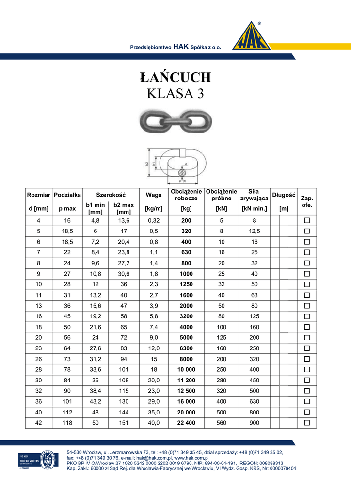 ŁAŃCUCH KLASA 3 Rozmiar Podziałka Szerokość 16 b1 min [mm] 4,8 b2 max [mm] 13,6 5 18,5 6 6 18,5 7 d [mm] p max 4 Waga [kg/m] Obciążenie Obciążenie Siła Długość robocze próbne zrywająca Zap. ofe. [kg] [kN] [kN min.] [m] 0,32 200 5 8 17 0,5 320 8 12,5 7,2 20,4 0,8 400 10 16 22 8,4 23,8 1,1 630 16 25 8 24 9,6 27,2 1,4 800 20 32 9 27 10,8 30,6 1,8 1000 25 40 10 28 12 36 2,3 1250 32 50 11 31 13,2 40 2,7 1600 40 63 13 36 15,6 47 3,9 2000 50 80 16 45 19,2 58 5,8 3200 80 125 18 50 21,6 65 7,4 4000 100 160 20 56 24 72 9,0 5000 125 200 23 64 27,6 83 12,0 6300 160 250 26 73 31,2 94 15 8000 200 320 28 78 33,6 101 18 10 000 250 400 30 84 36 108 20,0 11 200 280 450 32 90 38,4 115 23,0 12 500 320 500 36 101 43,2 130 29,0 16 000 400 630 40 112 48 144 35,0 20 000 500 800 42 118 50 151 40,0 22 400 560 900