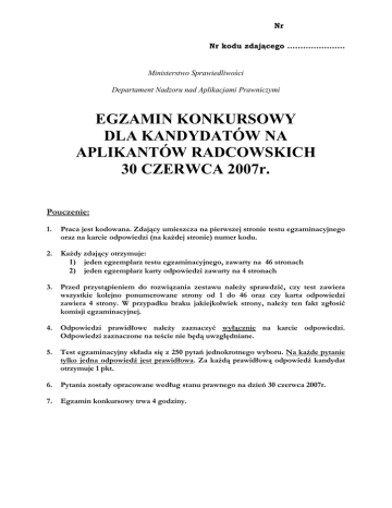 Nr Nr kodu zdającego …………………. Ministerstwo Sprawiedliwości Departament Nadzoru nad Aplikacjami Prawniczymi EGZAMIN KONKURSOWY DLA KANDYDATÓW NA APLIKANTÓW RADCOWSKICH 30 CZERWCA 2007r. Pouczenie: 1. Praca jest kodowana. Zdający umieszcza na pierwszej stronie testu egzaminacyjnego oraz na karcie odpowiedzi (na każdej stronie) numer kodu. 2. Każdy zdający otrzymuje: 1) jeden egzemplarz testu egzaminacyjnego, zawarty na 46 stronach 2) jeden egzemplarz karty odpowiedzi zawarty na 4 stronach 3. Przed przystąpieniem do rozwiązania zestawu należy sprawdzić, czy test zawiera wszystkie kolejno ponumerowane strony od 1 do 46 oraz czy karta odpowiedzi zawiera 4 strony. W przypadku braku jakiejkolwiek strony, należy ten fakt zgłosić komisji egzaminacyjnej. 4. Odpowiedzi prawidłowe należy zaznaczyć wyłącznie na karcie odpowiedzi. Odpowiedzi zaznaczone na teście nie będą uwzględniane. 5. Test egzaminacyjny składa się z 250 pytań jednokrotnego wyboru. Na każde pytanie tylko jedna odpowiedź jest prawidłowa. Za każdą prawidłową odpowiedź kandydat otrzymuje 1 pkt. 6. Pytania zostały opracowane według stanu prawnego na dzień 30 czerwca 2007r. 7. Egzamin konkursowy trwa 4 godziny. 1. Jednym z podmiotów, któremu przysługuje inicjatywa ustawodawcza w przedmiocie zmiany Konstytucji RP jest: A. Prezydent Rzeczypospolitej, B. Rada Ministrów, C. Trybunał Konstytucyjny. 2. Zgodnie z Konstytucją RP, wybory do Senatu nie są: A. powszechne, B. bezpośrednie, C. proporcjonalne. 3. Podstawą skrócenia kadencji Sejmu RP jest: A. uchwała podjęta większością co najmniej 1/2 głosów ustawowej liczby posłów, B. uchwała podjęta większością co najmniej 2/3 głosów ustawowej liczby posłów, C. ustawa podjęta większością co najmniej 1/2 głosów ustawowej liczby posłów. 4. Jeżeli Sejm RP wyraził ministrowi wotum nieufności, to zgodnie z Konstytucją RP: A. Prezes Rady Ministrów odwołuje tego ministra, B. Prezydent Rzeczypospolitej może odwołać tego ministra, C. Prezydent Rzeczypospolitej odwołuje tego ministra. 5. Inicjatywa ustawodawcza w zakresie ustawy budżetowej przysługuje wyłącznie: A. Radzie Ministrów, B. Prezesowi Rady Ministrów, C. Ministrowi Finansów. 6. W myśl Konstytucji RP, sędziowie w sprawowaniu swojego urzędu są niezawiśli i podlegają tylko: A. rozporządzeniom, B. powszechnie obowiązującym źródłom prawa, C. Konstytucji RP oraz ustawom. 7. Orzeczenia Trybunału Konstytucyjnego są: A. powszechnie obowiązujące i zaskarżalne do Sądu Najwyższego, B. powszechnie obowiązujące i ostateczne, C. powszechnie obowiązujące, jeżeli zdecyduje tak Sejm w uchwale przyjętej większością co najmniej 3/4 głosów ustawowej liczby posłów. EGZAMIN KONKURSOWY DLA KANDYDATÓW NA APLIKANTÓW RADCOWSKICH 1 8. Trybunał Konstytucyjny składa się z: A. 10 sędziów, B. 12 sędziów, C. 15 sędziów. 9. Przewodniczącym Trybunału Stanu jest: A. Prezes Trybunału Konstytucyjnego, B. Prezes Naczelnego Sądu Administracyjnego, C. Pierwszy Prezes Sądu Najwyższego. 10. Ważność wyboru Prezydenta Rzeczypospolitej stwierdza: A. Sąd Najwyższy, B. Trybunał Konstytucyjny, C. Państwowa Komisja Wyborcza. 11. W świetle Konstytucji RP, nadzór nad działalnością sądów powszechnych w zakresie orzekania sprawuje: A. Sąd Najwyższy, B. Prezydent Rzeczypospolitej, C. Minister Sprawiedliwości. 12. Wybrany do Senatu RP może być obywatel polski mający prawo wybierania, który najpóźniej w dniu wyborów kończy: A. 18 lat, B. 21 lat, C. 30 lat. 13. Zgodnie z Konstytucją RP, małżeństwo to: A. związek dwóch osób, bez względu na płeć, B. związek kobiety i mężczyzny, C. związek dwóch osób tej samej płci. 14. Zgodnie z Konstytucją RP, podstawową jednostką samorządu terytorialnego jest: A. gmina, B. powiat, C. województwo. 2 EGZAMIN KONKURSOWY DLA KANDYDATÓW NA APLIKANTÓW RADCOWSKICH 15. Prezesa Trybunału Konstytucyjnego powołuje: A. Krajowa Rada Sądownictwa, B. Prezydent Rzeczypospolitej, C. Sejm RP. 16. Zgodnie z Konstytucją RP, przedstawicielem Rady Ministrów w województwie jest: A. starosta, B. marszałek, C. wojewoda. 17. Prezes Najwyższej Izby Kontroli jest powoływany przez: A. Prezydenta Rzeczypospolitej, B. Prezesa Rady Ministrów, C. Sejm za zgodą Senatu. 18. Jeżeli w czasie orzekania w sprawie karnej obowiązuje ustawa inna niż w czasie popełnienia przestępstwa: A. zawsze stosuje się ustawę nową, B. stosuje się ustawę nową, jednakże należy stosować ustawę obowiązującą poprzednio, jeżeli jest względniejsza dla sprawcy, C. zawsze stosuje się ustawę obowiązującą w chwili popełnienia czynu. 19. Podżegacz do czynu zabronionego stanowiącego przestępstwo, którego tylko usiłowano dokonać: A. podlega odpowiedzialności karnej jak za usiłowanie, B. podlega odpowiedzialności karnej jak za dokonanie, C. nie podlega odpowiedzialności karnej. 20. Środkiem karnym, przewidzianym w Kodeksie karnym, nie jest: A. świadczenie pieniężne, B. zakaz prowadzenia działalności związanej z wychowaniem, leczeniem, edukacją małoletnich lub z opieką nad nimi, C. pozbawienie praw rodzicielskich. EGZAMIN KONKURSOWY DLA KANDYDATÓW NA APLIKANTÓW RADCOWSKICH 3 21. Według Kodeksu karnego, warunkowego zawieszenia wykonania kary grzywny nie stosuje się: A. w każdym przypadku jej orzeczenia wobec sprawcy młodocianego, B. w przypadku jej orzeczenia wobec każdego rodzaju recydywisty, C. w przypadku jej orzeczenia wobec sprawcy występku o charakterze chuligańskim. 22. Skazując za występek o charakterze chuligańskim, sąd wymierza karę przewidzianą za przypisane sprawcy przestępstwo: A. w granicach ustawowego zagrożenia, przewidzianego dla danego typu przestępstwa, B. w wysokości nie niższej od dolnej granicy ustawowego zagrożenia zwiększonego o połowę, C. w wysokości od dolnej granicy ustawowego zagrożenia do górnej granicy ustawowego zagrożenia zwiększ