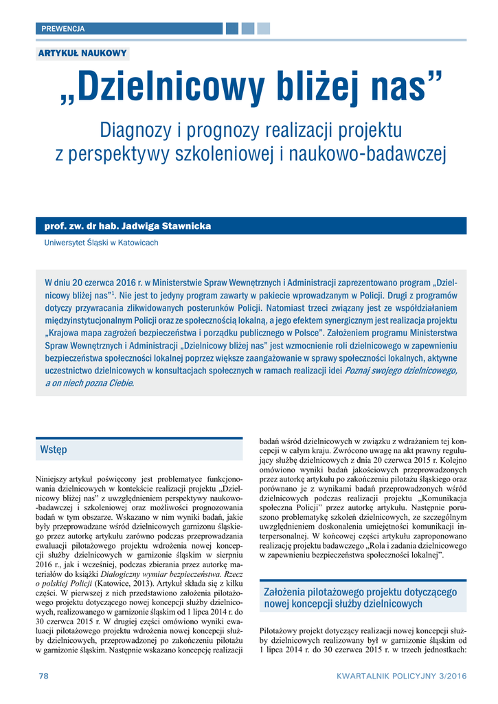 prewencja artykuł naukowy „Dzielnicowy bliżej nas” Diagnozy i prognozy realizacji projektu z perspektywy szkoleniowej i naukowo-badawczej prof. zw. dr hab. Jadwiga Stawnicka Uniwersytet Śląski w Katowicach W dniu 20 czerwca 2016 r. w Ministerstwie Spraw Wewnętrznych i Administracji zaprezentowano program „Dzielnicowy bliżej nas”1. Nie jest to jedyny program zawarty w pakiecie wprowadzanym w Policji. Drugi z programów dotyczy przywracania zlikwidowanych posterunków Policji. Natomiast trzeci związany jest ze współdziałaniem międzyinstytucjonalnym Policji oraz ze społecznością lokalną, a jego efektem synergicznym jest realizacja projektu „Krajowa mapa zagrożeń bezpieczeństwa i porządku publicznego w Polsce”. Założeniem programu Ministerstwa Spraw Wewnętrznych i Administracji „Dzielnicowy bliżej nas” jest wzmocnienie roli dzielnicowego w zapewnieniu bezpieczeństwa społeczności lokalnej poprzez większe zaangażowanie w sprawy społeczności lokalnych, aktywne uczestnictwo dzielnicowych w konsultacjach społecznych w ramach realizacji idei Poznaj swojego dzielnicowego, a on niech pozna Ciebie. Wstęp Niniejszy1artykuł poświęcony jest problematyce funkcjonowania dzielnicowych w kontekście realizacji projektu „Dzielnicowy bliżej nas” z uwzględnieniem perspektywy naukowo-badawczej i szkoleniowej oraz możliwości prognozowania badań w tym obszarze. Wskazano w nim wyniki badań, jakie były przeprowadzane wśród dzielnicowych garnizonu śląskiego przez autorkę artykułu zarówno podczas przeprowadzania ewaluacji pilotażowego projektu wdrożenia nowej koncepcji służby dzielnicowych w garnizonie śląskim w sierpniu 2016 r., jak i wcześniej, podczas zbierania przez autorkę materiałów do książki Dialogiczny wymiar bezpieczeństwa. Rzecz o polskiej Policji (Katowice, 2013). Artykuł składa się z kilku części. W pierwszej z nich przedstawiono założenia pilotażowego projektu dotyczącego nowej koncepcji służby dzielnicowych, realizowanego w garnizonie śląskim od 1 lipca 2014 r. do 30 czerwca 2015 r. W drugiej części omówiono wyniki ewaluacji pilotażowego projektu wdrożenia nowej koncepcji służby dzielnicowych, przeprowadzonej po zakończeniu pilotażu w garnizonie śląskim. Następnie wskazano koncepcję realizacji 78 badań wśród dzielnicowych w związku z wdrażaniem tej koncepcji w całym kraju. Zwrócono uwagę na akt prawny regulujący służbę dzielnicowych z dnia 20 czerwca 2015 r. Kolejno omówiono wyniki badań jakościowych przeprowadzonych przez autorkę artykułu po zakończeniu pilotażu śląskiego oraz porównano je z wynikami badań przeprowadzonych wśród dzielnicowych podczas realizacji projektu „Komunikacja społeczna Policji” przez autorkę artykułu. Następnie poruszono problematykę szkoleń dzielnicowych, ze szczególnym uwzględnieniem doskonalenia umiejętności komunikacji interpersonalnej. W końcowej części artykułu zaproponowano realizację projektu badawczego „Rola i zadania dzielnicowego w zapewnieniu bezpieczeństwa społeczności lokalnej”. Założenia pilotażowego projektu dotyczącego nowej koncepcji służby dzielnicowych Pilotażowy projekt dotyczący realizacji nowej koncepcji służby dzielnicowych realizowany był w garnizonie śląskim od 1 lipca 2014 r. do 30 czerwca 2015 r. w trzech jednostkach: KWARTALNIK POLICYJNY 3/2016 prewencja Nowa koncepcja służby dzielnicowych KMP w Sosnowcu i KMP w Żorach oraz KPP w Lublińcu. Projektem pilotażowym objęto łącznie 74 dzielnicowych. Przygotowując tę koncepcję, zespół, który był zaangażowany w opracowanie założeń, wykorzystywał nie tylko własne doświadczenie, ale i doświadczenia policji brytyjskiej. Efekty prac powołanego zespołu zostały ujęte w Raporcie z prac zespołu roboczego z dnia 8 stycznia 2014 r.2 Głównymi założeniami pilotażu były nawiązywanie i budowanie przez dzielnicowego właściwych relacji ze społecznościami lokalnymi, diagnozowanie oraz rozwiązywanie problemów mieszkańców należących do kompetencji Policji, dbałość o bezpieczeństwo mieszkańców i spędzanie jak najwięcej czasu służby w obchodzie swojego rejonu służbowego, a także nawiązywanie przez dzielnicowego kontaktów z instytucjami oraz osobami zainteresowanymi bezpieczeństwem. Działania w tym zakresie zostały podjęte w pięciu sferach (Stawnicka, Szymczyk, 2016, s. 20). Zmiany dotyczyły zarówno organizacji służby dzielnicowych, jak i prowadzenia dokumentacji oraz jej obiegu. Dzielnicowi zostali wyposażeni w sprzęt oraz zaplecze informatyczne. Zmianie uległa także kwestia doboru na stanowisko dzielnicowego, ponadto zmodyfikowano oraz udoskonalono program szkoleń i doskonalenia zawodowego. Dzielnicowym zapewniono dostęp do policyjnych systemów informatycznych, dokumentowanie i organizacja pracy dzielnicowego odbywały się w Lotus Notes. Dotyczyło to między innymi dokumentowania czynności, przekazywania pism do zapoznania, przekazywania biuletynu wydarzeń, dyskusji na forum aplikacji. Dzielnicowi zostali odciążeni od realizacji zadań, które nie były związane ze służbą obchodową w podległym im rejonie. Założono, iż obchód powinien stanowić 75% czasu służby. Poprzez wskazane działania wzrósł poziom samodzielności dzielnicowych w związku z realizowaniem zadań w ramach obchodu. Podjęto decyzję o zmianach zasad doboru kandydatów na stanowisko dzielnicowego, polegających między innymi na wprowadzeniu ścisłej współpracy z psychologiem oraz wypracowaniu arkusza kompetencji określającego predyspozycje kandydata na stanowisko dzielnicowego. System oceny dzielnicowego miał obejmować 3 filary: ocenę działań dzielnicowego, ocenę wiedzy kierownika rewiru oraz bezpośrednią i codzienną ocenę wizerunku i postawy dzielnicowego. Podano numery telefonów służbowych dzielnicowych oraz kierowników. Wprowadzono służbę w systemie dwuzmianowym. Spotkani
