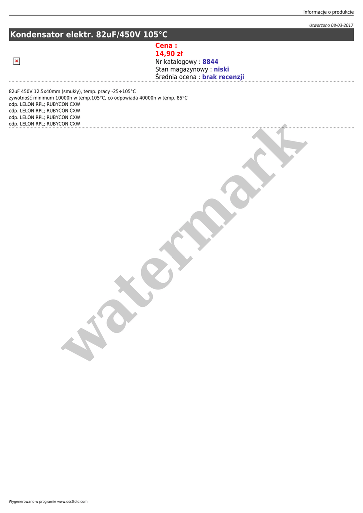 Informacje o produkcie Utworzono 08-03-2017 Kondensator elektr. 82uF/450V 105°C Cena : 14,90 zł Nr katalogowy : 8844 Stan magazynowy : niski Średnia ocena : brak recenzji w at er m ar k 82uF 450V 12.5x40mm (smukły), temp. pracy -25÷105°C żywotność minimum 10000h w temp.105°C, co odpowiada 40000h w temp. 85°C odp. LELON RPL; RUBYCON CXW odp. LELON RPL; RUBYCON CXW odp. LELON RPL; RUBYCON CXW odp. LELON RPL; RUBYCON CXW Wygenerowano w programie www.oscGold.com
