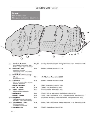 SOKOLI GRZBIET Dzwon Dzwon Wysokoœæ: 13 m Wystawa: zachodnia, po³udniowa 1. Przejœcie W Czasie VI.2/2+ (4R+RZ); Marcin Miko³ajczyk, Maciej Trzem¿alski; Jacek Trzem¿alski 2009 VI.4+ (5R+RZ); Jacek Trzem¿alski 2009 VI.3+ (4R+RZ); Jacek Trzem¿alski 1996 VI.1+ (4R+RZ); Jacek Trzem¿alski 1994 VVI.3+ VI.4+ (TRAD); Grzegorz Guzik solo 1994 (3R+RZ); £ukasz Skublicki 1995 (4R+RZ); Maciej Trzem¿alski 2010 VI.3+ VI.2+ VI.1+ (3R+RZ); Marcin Miko³ajczyk, Jacek Trzem¿alski 2011 (3R+RZ); Marcin Miko³ajczyk, Jacek Trzem¿alski, Maciej Trzem¿alski 2011 (5R); Marcin Miko³ajczyk, Jacek Trzem¿alski, Maciej Trzem¿alski 2009 VI.2+ (4R+RZ); Marcin Miko³ajczyk, Maciej Trzem¿alski, Jacek Trzem¿alski 2009 VI.4+ (5R+RZ); Jacek Trzem¿alski 2011 Warto zrobiæ – dobra jakoœæ ska³y. Wejœcia na pó³kê czujne i pouczaj¹ce. 2. Po³awiacz Dusz Ogranicznik na chwyty z Przejœcia W Czasie, czyli po lewej – narzuca siê. 3. W Królestwie Umieraj¹cego S³oñca Bardzo ciekawy okap. 4. Jajo Wê¿a Jedna z pierwszych dróg w sektorze. Nie warto zlekcewa¿yæ. 5. Komu Bije Dzwon 6. Off The Ground 7. Szpek Zawiotki Fakery niemal jak w wapieniu. 8. Bukaciarnia 9. Guzik Z Pêtelk¹ 10. Kryptofisie Œwietna, techniczna linia – uwaga na wybitny „wafel”: mo¿e siê urwaæ. 11. Wyposzczony Z Lasu Ciekawa wspinaczka z przewieszon¹ koñcówk¹. 12. Nuda Manty³³o 112 SOKOLI GRZBIET Szaman Szaman Wysokoœæ: 5 m Wystawa: zachodnia V+ VIVI.1 VI.1 VI.1+ VI+ Grzegorz Guzik solo 1993 Grzegorz Guzik solo 1993 Wyposzczony Z Lasu VI.2+, Dzwon, Strzelnica 113 Marcin Miko³ajczyk 1. Smuga Cienia 2. Ognisty Podmuch 3. W Krainie Wiecznego Snu 4. Br¹zowy Szerszeñ 5. W Krainie Wiecznych Marzeñ 6. P³on¹cy Szaman