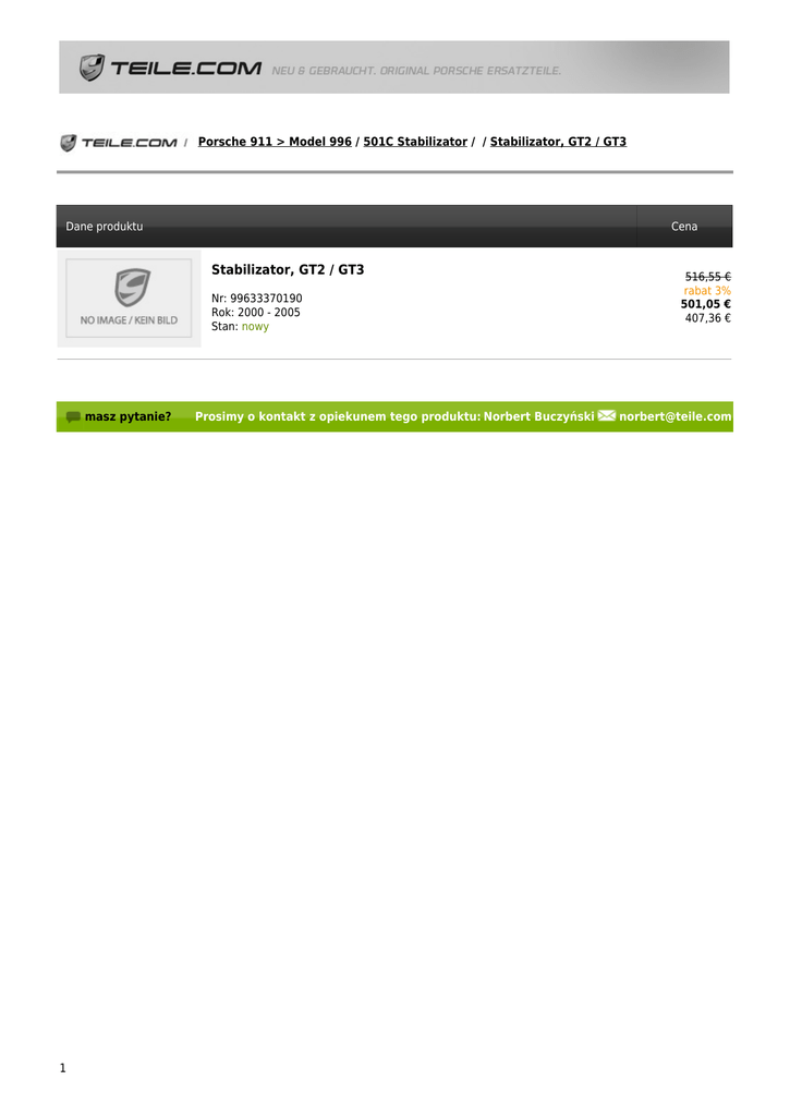 Porsche 911 > Model 996 / 501C Stabilizator / / Stabilizator, GT2 / GT3 Dane produktu Cena Stabilizator, GT2 / GT3 Nr: 99633370190 Rok: 2000 - 2005 Stan: nowy masz pytanie? 1 Prosimy o kontakt z opiekunem tego produktu: Norbert Buczyński 516,55 € rabat 3% 501,05 € 407,36 € [email protected]