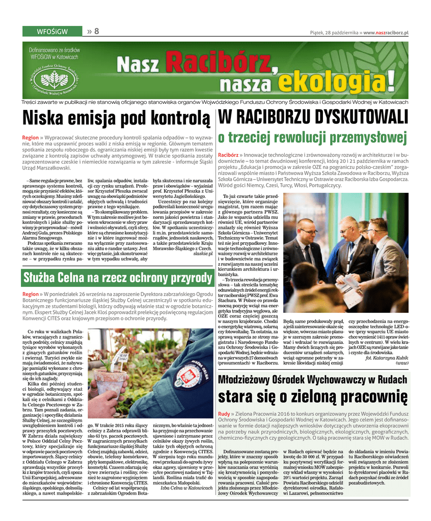 WFOŚiGW »8 Piątek, 28 października » www.naszraciborz.pl Treści zawarte w publikacji nie stanowią oficjanego stanowiska organów Wojwódzkiego Funduszu Ochrony Środowiska i Gospodarki Wodnej w Katowicach Niska emisja pod kontrolą W RACIBORZU DYSKUTOWALI o trzeciej rewolucji przemysłowej Region » Wypracować skuteczne procedury kontroli spalania odpadów – to wyzwanie, które ma usprawnić proces walki z niska emisją w regionie. Głównym tematem spotkania zespołu roboczego ds. ograniczania niskiej emisji były tym razem kwestie związane z kontrolą zapisów uchwały antysmogowej. W trakcie spotkania zostały Racibórz » Innowacje technologiczne i zrównoważony rozwój w architekturze i w buzaprezentowane czeskie i niemieckie rozwiązania w tym zakresie - informuje Śląski downictwie – to temat dwudniowej konferencji, którą 20 i 21 października w ramach projektu „Edukacja i promocja w zakresie OZE na pograniczu polsko-czeskim” zorgaUrząd Marszałkowski. nizowali wspólnie miasto i Państwowa Wyższa Szkoła Zawodowa w Raciborzu, Wyższa – Same regulacje prawne, bez liw, spalania odpadów, instala- była skuteczna i nie naruszała Szkoła Górnicza – Uniwersytet Techniczny w Ostrawie oraz Raciborska Izba Gospodarcza. sprawnego systemu kontroli, cji czy rynku urządzeń. Profe- praw i obowiązków – wyjaśniał Wśród gości Niemcy, Czesi, Turcy, Włosi, Portugalczycy. mogą nie przynieść efektów, których oczekujemy. Musimy zdefiniować obszary kontroli i ustalić, czy dotychczasowy system przynosi rezultaty, czy konieczne są zmiany w prawie, procedurach kontrolnych i jakie służby powinny je przeprowadzać – mówił Andrzej Guła, prezes Polskiego Alarmu Smogowego. Podczas spotkania zwracano także uwagę, że w kilku obszarach kontrole nie są skuteczne – w przypadku rynku pa- sor Krzysztof Płeszka zwracał uwagę na obowiązki podmiotów objętych uchwałą i trudności prawne z tego wynikające. – To skomplikowany problem. W tym zakresie możliwe jest bowiem wkroczenie w sfery praw i wolności obywateli, czyli sfery, które są chronione konstytucyjnie i w które ingerować można wyłącznie przy zastosowaniu aktu o randze ustawy. Jest więc pytanie, jak skonstruować w tym wypadku uchwałę, aby prof. Krzysztof Płeszka z Uniwersytetu Jagiellońskiego. Uczestnicy po raz kolejny podkreślali konieczność uregulowania przepisów w zakresie norm jakości powietrza i standaryzacji sprzedawanych kotłów. W spotkaniu uczestniczyli m.in. przedstawiciele samorządów, jednostek naukowych, a także przedstawiciele Kraju Morawsko-Śląskiego z Czech. slaskie.pl Służba Celna na rzecz ochrony przyrody Region » W poniedziałek 26 września na zaproszenie Dyrektora zabrzańskiego Ogrodu Botanicznego funkcjonariusze śląskiej Służby Celnej uczestniczyli w spotkaniu edukacyjnym ze studentami biologii, którzy odbywają właśnie staż w ogrodzie botanicznym. Ekspert Służby Celnej Jacek Kloś poprowadził prelekcję poświęconą regulacjom Konwencji CITES oraz krajowym przepisom o ochronie przyrody. Co roku w walizkach Polaków, wracających z zagranicznych podróży, celnicy znajdują tysiące wyrobów wykonanych z ginących gatunków roślin i zwierząt. Turyści zwykle nie mają świadomości, że nabywając pamiątki wykonane z chronionych gatunków, przyczyniają się do ich zagłady. Kilka dni później studenci biologii, odbywający staż w ogrodzie botanicznym, spotkali się z celnikami z Oddziału Celnego Pocztowego w Zabrzu. Tam poznali zadania, organizację i specyfikę działania Służby Celnej, ze szczególnym uwzględnieniem kontroli i odprawy przesyłek pocztowych. W Zabrzu działa największy w Polsce Oddział Celny Pocztowy, który specjalizuje się w odprawie paczek pocztowych importowanych. Śląscy celnicy z Oddziału Celnego w Zabrzu sprawdzają wszystkie przesyłki z krajów trzecich, czyli spoza Unii Europejskiej, adresowane do mieszkańców województw: śląskiego, opolskiego, dolnośląskiego, a nawet małopolskie- To już czwarte takie przedsięwzięcie, które organizuje magistrat, tym razem mając z głównego partnera PWSZ. Jako że wsparcia udzieliła mu również UE, wśród partnerów znalazły się również Wyższa Szkoła Górnicza – Uniwersytet Techniczny w Ostrawie. Temat też nie jest przypadkowy. Innowacje technologiczne i zrównoważony rozwój w architekturze i w budownictwie ma związek z rozwijanym na naszej uczelni kierunkiem architektura i urbanistyka. – To trzecia rewolucja przemysłowa – tak streściła tematykę odnawialnych źródeł energii rektor raciborskiej PWSZ prof. Ewa Stachura. W Polsce co prawda mocną pozycję wciąż ma energetyka tradycyjna węglowa, ale OZE coraz częściej goszczą w naszym krajobrazie. Chodzi o energetykę wiatrową, solarną czy fotowoltaikę. Ta ostatnia, za sprawą wsparcia ze strony magistratu i Narodowego Funduszu Ochrony Środowiska i Gospodarki Wodnej, będzie wdrażana w pierwszych 27 domostwach (prosumentach) w Raciborzu. Będą same produkowały prąd, a jeśli zainteresowanie okaże się większe, wówczas miasto planuje w szerszym zakresie promować i wdrażać te rozwiązania. Mamy dwóch liczących się producentów urządzeń solarnych, wciąż ogromne potrzeby w zakresie likwidacji niskiej emisji czy przechodzenia na energooszczędne technologie LED-owe (przy wsparciu UE miasto chce wymienić 1411 opraw świetlnych w centrum). W wielu krajach OZE są rozwijane jako tanie i czyste dla środowiska. fot. Katarzyna Kubik (waw) Młodzieżowy Ośrodek Wychowawczy w Rudach stara się o zieloną pracownię Rudy » Zielona Pracownia 2016 to konkurs organizowany przez Wojewódzki Fundusz Ochrony Środowiska i Gospodarki Wodnej w Katowicach. Jego celem jest dofinansogo. W trakcie 2015 roku śląscy nicznym, bo właśnie ta jednost- wanie w formie dotacji najlepszych wniosków dotyczących utworzenia ekopracowni celnicy z Zabrza odprawili bli- ka przy