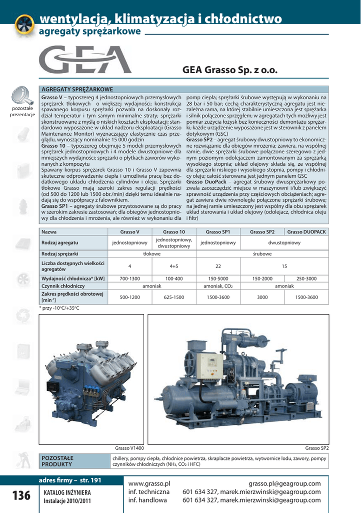 wentylacja, klimatyzacja i chłodnictwo w agregaty sprężarkowe GEA Grasso Sp. z o.o. AGREGATY SPRĘŻARKOWE pozostałe prezentacje pomp ciepła; sprężarki śrubowe występują w wykonaniu na 28 bar i 50 bar; cechą charakterystyczną agregatu jest niezależna rama, na której stabilnie umieszczona jest sprężarka i silnik połączone sprzęgłem; w agregatach tych możliwy jest pomiar zużycia łożysk bez konieczności demontażu sprężarki; każde urządzenie wyposażone jest w sterownik z panelem dotykowym (GSC) Grasso SP2 – agregat śrubowy dwustopniowy to ekonomiczne rozwiązanie dla obiegów mrożenia; zawiera, na wspólnej ramie, dwie sprężarki śrubowe połączone szeregowo z jednym poziomym odolejaczem zamontowanym za sprężarką wysokiego stopnia; układ olejowy składa się, ze wspólnej dla sprężarki niskiego i wysokiego stopnia, pompy i chłodnicy oleju; całość sterowana jest jednym panelem GSC Grasso DuoPack – agregat śrubowy dwusprężarkowy pozwala zaoszczędzić miejsce w maszynowni i/lub zwiększyć sprawność urządzenia przy częściowych obciążeniach; agregat zawiera dwie równolegle połączone sprężarki śrubowe; na jednej ramie umieszczony jest wspólny dla obu sprężarek układ sterowania i układ olejowy (odolejacz, chłodnica oleju i filtr) Grasso V – typoszereg 4 jednostopniowych przemysłowych sprężarek tłokowych o większej wydajności; konstrukcja spawanego korpusu sprężarki pozwala na doskonały rozdział temperatur i tym samym minimalne straty; sprężarki skonstruowane z myślą o niskich kosztach eksploatacji; standardowo wyposażone w układ nadzoru eksploatacji (Grasso Maintenance Monitor) wyznaczający elastycznie czas przeglądu, wynoszący nominalnie 15 000 godzin Grasso 10 – typoszereg obejmuje 5 modeli przemysłowych sprężarek jednostopniowych i 4 modele dwustopniowe dla mniejszych wydajności; sprężarki o płytkach zaworów wykonanych z kompozytu Spawany korpus sprężarek Grasso 10 i Grasso V zapewnia skuteczne odprowadzenie ciepła i umożliwia pracę bez dodatkowego układu chłodzenia cylindrów i oleju. Sprężarki tłokowe Grasso mają szeroki zakres regulacji prędkości (od 500 do 1200 lub 1500 obr./min) dzięki temu idealnie nadają się do współpracy z falownikiem. Grasso SP1 – agregaty śrubowe przystosowane są do pracy w szerokim zakresie zastosowań; dla obiegów jednostopniowy dla chłodzenia i mrożenia, ale również w wykonaniu dla Nazwa Rodzaj agregatu Grasso V Grasso 10 Grasso SP1 jednostopniowy jednostopniowy, dwustopniowy jednostopniowy Rodzaj sprężarki Liczba dostępnych wielkości agregatów Wydajność chłodnicza* [kW] Czynnik chłodniczy Zakres prędkości obrotowej [min-1] tłokowe 4 700-1300 Grasso DUOPACK dwustopniowy śrubowe 4+5 22 100-400 150-5000 amoniak, CO2 150-2000 1500-3600 3000 amoniak 500-1200 Grasso SP2 625-1500 15 250-3000 amoniak 1500-3600 * przy -10oC/+35oC Grasso V1400 POZOSTAŁE PRODUKTY adres firmy – str. 191 136 KATALOG INŻYNIERA Instalacje 2010/2011 Grasso SP2 chillery, pompy ciepła, chłodnice powietrza, skraplacze powietrza, wytwornice lodu, zawory, pompy czynników chłodniczych (NH3, CO2 i HFC) www.grasso.pl inf. techniczna inf. handlowa [email protected] 601 634 327, [email protected] 601 634 327, [email protected]