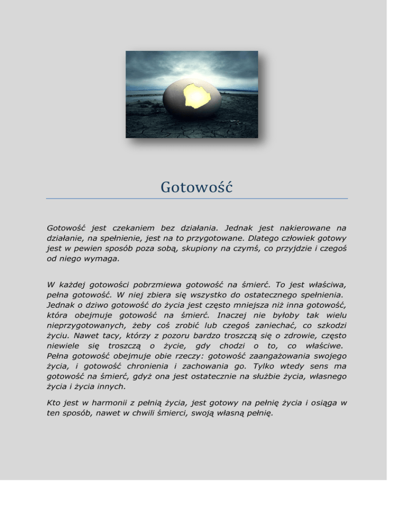 Gotowość Gotowość jest czekaniem bez działania. Jednak jest nakierowane na działanie, na spełnienie, jest na to przygotowane. Dlatego człowiek gotowy jest w pewien sposób poza sobą, skupiony na czymś, co przyjdzie i czegoś od niego wymaga. W każdej gotowości pobrzmiewa gotowość na śmierć. To jest właściwa, pełna gotowość. W niej zbiera się wszystko do ostatecznego spełnienia. Jednak o dziwo gotowość do życia jest często mniejsza niż inna gotowość, która obejmuje gotowość na śmierć. Inaczej nie byłoby tak wielu nieprzygotowanych, żeby coś zrobić lub czegoś zaniechać, co szkodzi życiu. Nawet tacy, którzy z pozoru bardzo troszczą się o zdrowie, często niewiele się troszczą o życie, gdy chodzi o to, co właściwe. Pełna gotowość obejmuje obie rzeczy: gotowość zaangażowania swojego życia, i gotowość chronienia i zachowania go. Tylko wtedy sens ma gotowość na śmierć, gdyż ona jest ostatecznie na służbie życia, własnego życia i życia innych. Kto jest w harmonii z pełnią życia, jest gotowy na pełnię życia i osiąga w ten sposób, nawet w chwili śmierci, swoją własną pełnię.