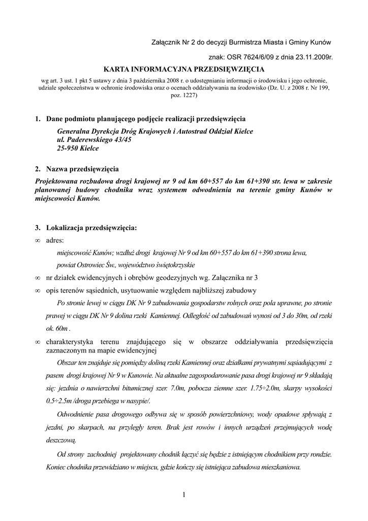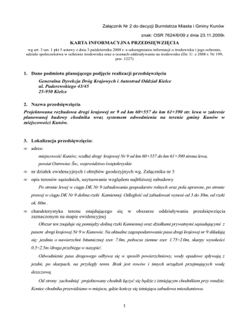 Załącznik Nr 2 do decyzji Burmistrza Miasta i Gminy Kunów znak: OSR 7624/6/09 z dnia 23.11.2009r. KARTA INFORMACYJNA PRZEDSIĘWZIĘCIA wg art. 3 ust. 1 pkt 5 ustawy z dnia 3 października 2008 r. o udostępnianiu informacji o środowisku i jego ochronie, udziale społeczeństwa w ochronie środowiska oraz o ocenach oddziaływania na środowisko (Dz. U. z 2008 r. Nr 199, poz. 1227) 1. Dane podmiotu planującego podjęcie realizacji przedsięwzięcia Generalna Dyrekcja Dróg Krajowych i Autostrad Oddział Kielce ul. Paderewskiego 43/45 25-950 Kielce 2. Nazwa przedsięwzięcia Projektowana rozbudowa drogi krajowej nr 9 od km 60+557 do km 61+390 str. lewa w zakresie planowanej budowy chodnika wraz systemem odwodnienia na terenie gminy Kunów w miejscowości Kunów. 3. Lokalizacja przedsięwzięcia: • adres: miejscowość Kunów; wzdłuż drogi krajowej Nr 9 od km 60+557 do km 61+390 strona lewa, powiat Ostrowiec Św., województwo świętokrzyskie • nr działek ewidencyjnych i obrębów geodezyjnych wg. Załącznika nr 3 • opis terenów sąsiednich, usytuowanie względem najbliższej zabudowy Po stronie lewej w ciągu DK Nr 9 zabudowania gospodarstw rolnych oraz pola uprawne, po stronie prawej w ciągu DK Nr 9 dolina rzeki Kamiennej. Odległość od zabudowań wynosi od 3 do 30m, od rzeki ok. 60m . • charakterystyka terenu znajdującego zaznaczonym na mapie ewidencyjnej się w obszarze oddziaływania przedsięwzięcia Obszar ten znajduje się pomiędzy doliną rzeki Kamiennej oraz działkami prywatnymi sąsiadującymi z pasem drogi krajowej Nr 9 w Kunowie. Na aktualne zagospodarowanie pasa drogi krajowej nr 9 składają się: jezdnia o nawierzchni bitumicznej szer. 7.0m, pobocza ziemne szer. 1.75÷2.0m, skarpy wysokości 0.5÷2.5m /droga przebiega w nasypie/. Odwodnienie pasa drogowego odbywa się w sposób powierzchniowy, wody opadowe spływają z jezdni, po skarpach, na przyległy teren. Brak jest rowów i innych urządzeń przejmujących wodę deszczową. Od strony zachodniej projektowany chodnik łączyć się będzie z istniejącym chodnikiem przy rondzie. Koniec chodnika przewidziano w miejscu, gdzie kończy się istniejąca zabudowa mieszkaniowa. 1 4. Rodzaj przedsięwzięcia Na przedsięwzięcie składa się budowa obiektów liniowych takich jak chodniki, rowy, pobocza, skarpy, kanalizacja deszczowa, peron zatoki autobusowej przepusty oraz zjazdy, przebudowa infrastruktury technicznej niezwiązanej z drogą w niezbędnym zakresie (przebudowa napowietrznej linii eNN i napowietrznej linii telekomunikacyjnej). Wykonane zostaną również elementy bezpieczeństwa ruchu drogowego: barierki ochronne. Realizacja tego zamierzenia budowlanego wymagać będzie poszerzenia istniejącego pasa drogowego po stronie lewej od 4,0÷9,0m. 5. Skala przedsięwzięcia (np. zdolność produkcyjna, podstawowe parametry techniczne, wymiary, moc, średnica, długość itp.) Projektowany chodnik usytuowany będzi e w ciągu DK9 od km 60+553 do km 61+390. Szerokość chodnika wynosić będzie 1,5m. Szerokość projektowanego pobocza 1,5m. Nachylenie skarp 1:1.5. Długość przepustów dostosowana do szerokości zjazdów (ok. 6,0m dla zjazdów indywidualnych i 12m dla zjazdów publicznych). • podstawowe parametry techniczne przedsięwzięcia: chodnik długości ok. 823m, szerokość 1.5m , spadek poprzeczny 2% pobocza szer. 1,5m w tym umocnione kruszywem łamanym szer. 0,75m, na odcinku od km 60+720 do km 61+390 wzdłuż DK NR9 zieleńce szer. 0,3 - 1,5m , spadek poprzeczny 4% przepustów pod zjazdami indywidualnymi Ø 500,600 dł.6,0 – 12,0m wraz ze prefabrykowanymi ściankami 19 zjazdów indywidualnych, minimalna szer. 4,5m w tym 3,0m utwardzone, długość do warunków miejscowych zatoka autobusowa w km 61+050 długość peronu 20m, skos wjazdowy 1:8, skos wyjazdowy 1:4, szerokość peronu 1,5m, szer. zatoki 3,5m, pochylenie poprzeczne zatoki 2% • budowa systemu odwodnienia w tym: - wzdłuż jezdni i chodnika projektowany jest rów ziemny o nachyleniu skarp 1:1,5, szerokość dna 0,4m, spadek podłużny 0.2÷0.3%, − bezpośrednim odbiornikiem wód opadowych i roztopowych z jezdni i rowów przydrożnych będzie istniejący kanał miejski ø 1000 mający w dalszej części ujście do rzeki Kamiennej. Wody opadowe zebrane w projektowany kanał deszczowy fi 400 będą podczyszczone poprzez zastosowanie osadnika. • z powodu rozszerzenia pasa drogi istniejąca linia enn i telekomunikacyjna napowietrzna będzie przebudowana 2 6. Obsługa komunikacyjna: Droga krajowa Nr 9 należy do klasy dróg GP – główne ruchu przyspieszonego. W obecnym stanie użytkowana funkcjonuje jako droga o znaczeniu międzynarodowym E371 łącząca województwo mazowieckie z przejściem granicznym ze Słowacją w Barwinku (292km). Obecnie ruch pieszy odbywa się poboczem ziemnym przy istniejącej jezdni, zimą lub przy złych warunkach atmosferycznych piesi często wychodzą na jezdnię stwarzając podwójne zagrożenie dla siebie i poruszających się pojazdów. Przedmiotowy chodnik będzie obsługiwał ruch pieszy z lewej strony DK NR 9. Chodnik ten usytuowany będzie w obszarze projektowanej rozbudowy pasa drogowego, za projektowanym rowem obecnie na działkach prywatnych, co jest zgodne z Miejscowym Planem Zagospodarowania Przestrzennego. W ciągu projektowanego chodnika znajdują się jedna zatoka autobusowe w km 61+050 7. Powierzchnia zajmowanej nieruchomości, powierzchnia obiektu budowlanego oraz dotychczasowy sposób ich wykorzystywania: • powierzchnia zabudowy terenu, istniejących i planowanych obiektów budowlanych, Dotychczasowy obszar użytkowania pasa drogowego wynosi ok. 1,24 ha. Powierzchnia pasa drogowego zostanie powiększona o obszar ok. 0,47 ha. Powierzchnia zagospodarowania terenu wyniesie 0,82 ha. • porównanie dotychczasowego użytkowania terenu z planowanym jego zagospodarowaniem W miejscu inwestycji znajduje się obecnie pobocze ziemne, skarpa ziemna i zajmuje powierzchnię ok. 0.5 ha. 