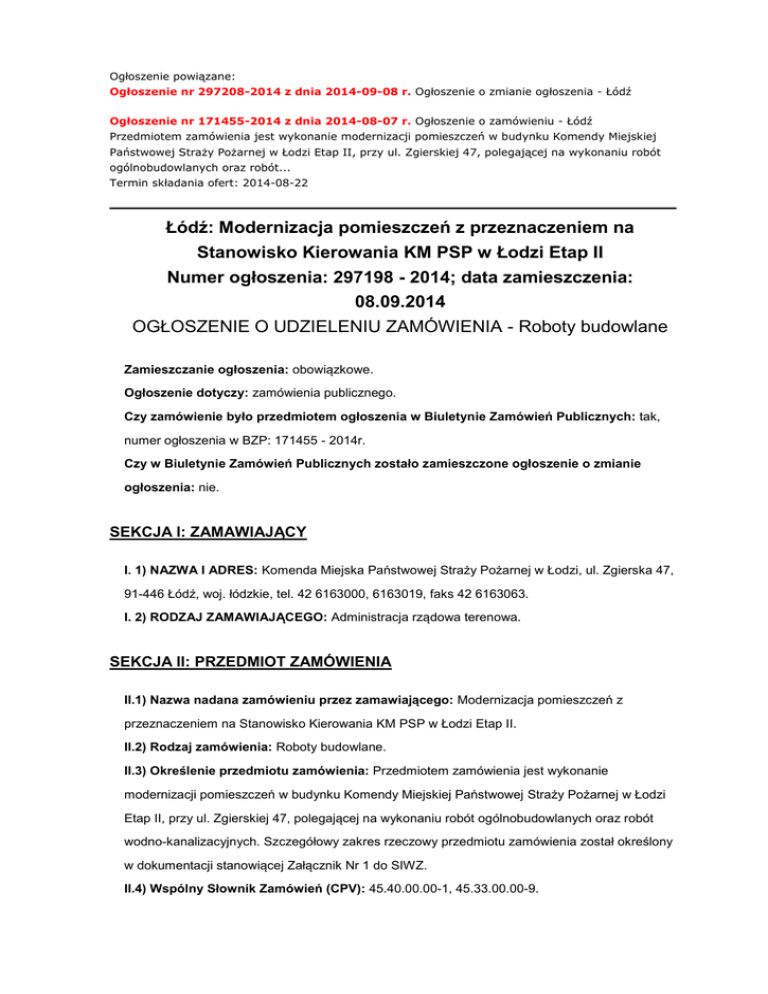 Ogłoszenie powiązane: Ogłoszenie nr 297208-2014 z dnia 2014-09-08 r. Ogłoszenie o zmianie ogłoszenia - Łódź Ogłoszenie nr 171455-2014 z dnia 2014-08-07 r. Ogłoszenie o zamówieniu - Łódź Przedmiotem zamówienia jest wykonanie modernizacji pomieszczeń w budynku Komendy Miejskiej Państwowej Straży Pożarnej w Łodzi Etap II, przy ul. Zgierskiej 47, polegającej na wykonaniu robót ogólnobudowlanych oraz robót... Termin składania ofert: 2014-08-22 Łódź: Modernizacja pomieszczeń z przeznaczeniem na Stanowisko Kierowania KM PSP w Łodzi Etap II Numer ogłoszenia: 297198 - 2014; data zamieszczenia: 08.09.2014 OGŁOSZENIE O UDZIELENIU ZAMÓWIENIA - Roboty budowlane Zamieszczanie ogłoszenia: obowiązkowe. Ogłoszenie dotyczy: zamówienia publicznego. Czy zamówienie było przedmiotem ogłoszenia w Biuletynie Zamówień Publicznych: tak, numer ogłoszenia w BZP: 171455 - 2014r. Czy w Biuletynie Zamówień Publicznych zostało zamieszczone ogłoszenie o zmianie ogłoszenia: nie. SEKCJA I: ZAMAWIAJĄCY I. 1) NAZWA I ADRES: Komenda Miejska Państwowej Straży Pożarnej w Łodzi, ul. Zgierska 47, 91-446 Łódź, woj. łódzkie, tel. 42 6163000, 6163019, faks 42 6163063. I. 2) RODZAJ ZAMAWIAJĄCEGO: Administracja rządowa terenowa. SEKCJA II: PRZEDMIOT ZAMÓWIENIA II.1) Nazwa nadana zamówieniu przez zamawiającego: Modernizacja pomieszczeń z przeznaczeniem na Stanowisko Kierowania KM PSP w Łodzi Etap II. II.2) Rodzaj zamówienia: Roboty budowlane. II.3) Określenie przedmiotu zamówienia: Przedmiotem zamówienia jest wykonanie modernizacji pomieszczeń w budynku Komendy Miejskiej Państwowej Straży Pożarnej w Łodzi Etap II, przy ul. Zgierskiej 47, polegającej na wykonaniu robót ogólnobudowlanych oraz robót wodno-kanalizacyjnych. Szczegółowy zakres rzeczowy przedmiotu zamówienia został określony w dokumentacji stanowiącej Załącznik Nr 1 do SIWZ. II.4) Wspólny Słownik Zamówień (CPV): 45.40.00.00-1, 45.33.00.00-9. SEKCJA III: PROCEDURA III.1) TRYB UDZIELENIA ZAMÓWIENIA: Przetarg nieograniczony III.2) INFORMACJE ADMINISTRACYJNE Zamówienie dotyczy projektu/programu finansowanego ze środków Unii Europejskiej: nie SEKCJA IV: UDZIELENIE ZAMÓWIENIA IV.1) DATA UDZIELENIA ZAMÓWIENIA: 03.09.2014. IV.2) LICZBA OTRZYMANYCH OFERT: 2. IV.3) LICZBA ODRZUCONYCH OFERT: 0. IV.4) NAZWA I ADRES WYKONAWCY, KTÓREMU UDZIELONO ZAMÓWIENIA: Grupa Budowlana WCS Spółka z o.o., Gdańska 108, 90-508 Łódź, kraj/woj. łódzkie. IV.5) Szacunkowa wartość zamówienia (bez VAT): 381380,64 PLN. IV.6) INFORMACJA O CENIE WYBRANEJ OFERTY ORAZ O OFERTACH Z NAJNIŻSZĄ I NAJWYŻSZĄ CENĄ Cena wybranej oferty: 75462,43 Oferta z najniższą ceną: 75462,43 / Oferta z najwyższą ceną: 92997,15 Waluta: PLN. Ogłoszenie powiązane: Ogłoszenie nr 297198-2014 z dnia 2014-09-08 r. Ogłoszenie o udzieleniu zamówienia - Łódź Przedmiotem zamówienia jest wykonanie modernizacji pomieszczeń w budynku Komendy Miejskiej Państwowej Straży Pożarnej w Łodzi Etap II, przy ul. Zgierskiej 47, polegającej na wykonaniu robót ogólnobudowlanych oraz robót... Numer ogłoszenia: 297208 - 2014; data zamieszczenia: 08.09.2014 OGŁOSZENIE O ZMIANIE OGŁOSZENIA Ogłoszenie dotyczy: Ogłoszenia o udzieleniu zamówienia. Informacje o zmienianym ogłoszeniu: 297198 - 2014 data 08.09.2014 r. SEKCJA I: ZAMAWIAJĄCY Komenda Miejska Państwowej Straży Pożarnej w Łodzi, ul. Zgierska 47, 91-446 Łódź, woj. łódzkie, tel. 42 6163000, 6163019, fax. 42 6163063. SEKCJA II: ZMIANY W OGŁOSZENIU II.1) Tekst, który należy zmienić: Miejsce, w którym znajduje się zmieniany tekst: IV.5. W ogłoszeniu jest: 381380,64 PLN. W ogłoszeniu powinno być: 38138,64 PLN.