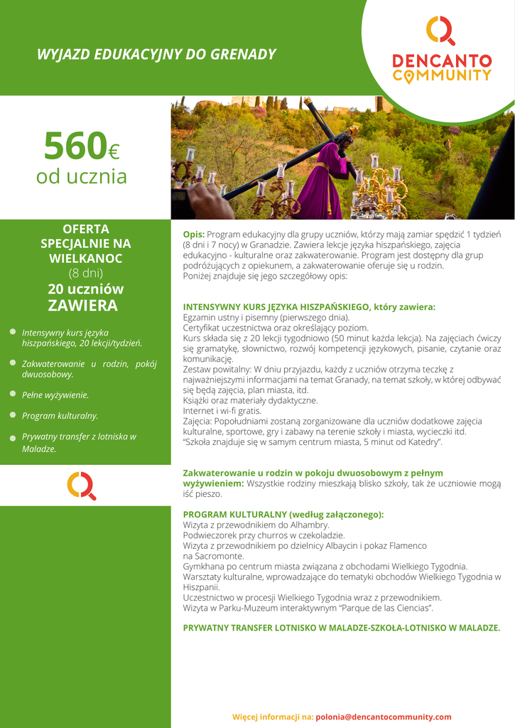 WYJAZD EDUKACYJNY DO GRENADY 560€ od ucznia OFERTA SPECJALNIE NA WIELKANOC (8 dni) 20 uczniów ZAWIERA Intensywny kurs języka hiszpańskiego, 20 lekcji/tydzień. Zakwaterowanie u rodzin, pokój dwuosobowy. Pełne wyżywienie. Program kulturalny. Prywatny transfer z lotniska w Maladze. Opis: Program edukacyjny dla grupy uczniów, którzy mają zamiar spędzić 1 tydzień (8 dni i 7 nocy) w Granadzie. Zawiera lekcje języka hiszpańskiego, zajęcia edukacyjno - kulturalne oraz zakwaterowanie. Program jest dostępny dla grup podróżujących z opiekunem, a zakwaterowanie oferuje się u rodzin. Poniżej znajduje się jego szczegółowy opis: INTENSYWNY KURS JĘZYKA HISZPAŃSKIEGO, który zawiera: Egzamin ustny i pisemny (pierwszego dnia). Certyfikat uczestnictwa oraz określający poziom. Kurs składa się z 20 lekcji tygodniowo (50 minut każda lekcja). Na zajęciach ćwiczy się gramatykę, słownictwo, rozwój kompetencji językowych, pisanie, czytanie oraz komunikację. Zestaw powitalny: W dniu przyjazdu, każdy z uczniów otrzyma teczkę z najważniejszymi informacjami na temat Granady, na temat szkoły, w której odbywać się będą zajęcia, plan miasta, itd. Książki oraz materiały dydaktyczne. Internet i wi-fi gratis. Zajęcia: Popołudniami zostaną zorganizowane dla uczniów dodatkowe zajęcia kulturalne, sportowe, gry i zabawy na terenie szkoły i miasta, wycieczki itd. “Szkoła znajduje się w samym centrum miasta, 5 minut od Katedry”. Zakwaterowanie u rodzin w pokoju dwuosobowym z pełnym wyżywieniem: Wszystkie rodziny mieszkają blisko szkoły, tak że uczniowie mogą iść pieszo. PROGRAM KULTURALNY (według załączonego): Wizyta z przewodnikiem do Alhambry. Podwieczorek przy churros w czekoladzie. Wizyta z przewodnikiem po dzielnicy Albaycin i pokaz Flamenco na Sacromonte. Gymkhana po centrum miasta związana z obchodami Wielkiego Tygodnia. Warsztaty kulturalne, wprowadzające do tematyki obchodów Wielkiego Tygodnia w Hiszpanii. Uczestnictwo w procesji Wielkiego Tygodnia wraz z przewodnikiem. Wizyta w Parku-Muzeum interaktywnym “Parque de las Ciencias”. PRYWATNY TRANSFER LOTNISKO W MALADZE-SZKOŁA-LOTNISKO W MALADZE. Więcej informacji na: [email protected]