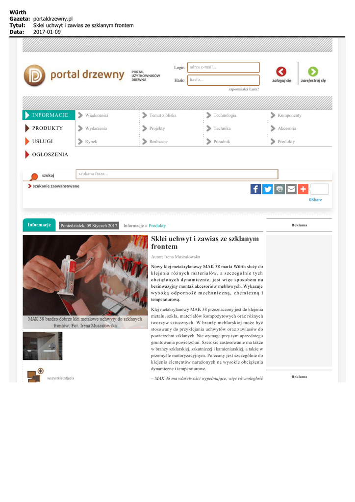 Würth Gazeta: portaldrzewny.pl Sklei uchwyt i zawias ze szklanym frontem Tytuł: Data: 2017-01-09 Login: adres e-mail... Hasło: hasło... zapomniałeś hasła? INFORMACJE Wiadomości Temat z bliska Technologia Komponenty PRODUKTY Wydarzenia Projekty Technika Akcesoria USŁUGI Rynek Realizacje Poradnik Produkty OGŁOSZENIA szukana fraza... 0Share Informacje Poniedziałek, 09 Styczeń 2017 Informacje » Produkty Reklama Sklei uchwyt i zawias ze szklanym frontem Autor: Irena Muszałowska Nowy klej metakrylanowy MAK 38 marki Würth służy do klejenia różnych materiałów, a szczególnie tych obciążonych dynamicznie, jest więc sposobem na bezinwazyjny montaż akcesoriów meblowych. Wykazuje wysoką odporność mechaniczną, chemiczną i temperaturową. Klej metakrylanowy MAK 38 przeznaczony jest do klejenia metalu, szkła, materiałów kompozytowych oraz różnych tworzyw sztucznych. W branży meblarskiej może być stosowany do przyklejania uchwytów oraz zawiasów do powierzchni szklanych. Nie wymaga przy tym uprzedniego gruntowania powierzchni. Szerokie zastosowanie ma także w branży szklarskiej, szkutniczej i kamieniarskiej, a także w przemyśle motoryzacyjnym. Polecany jest szczególnie do klejenia elementów narażonych na wysokie obciążenia dynamiczne i temperaturowe. – MAK 38 ma właściwości wypełniające, więc równoległość Reklama Würth Gazeta: portaldrzewny.pl Sklei uchwyt i zawias ze szklanym frontem Tytuł: Data: 2017-01-09 klejonych powierzchni nie jest warunkiem koniecznym do jego zastosowania – mówi Robert Pawlaczyk, kierownik ds. rozwoju rynku w Dywizji Drewno Würth Polska. – Jest to istotna cecha zwłaszcza w przypadku, gdy musimy przykleić blaszaną łatę do powierzchni zbiornika lub innej metalowej obudowy, czy teżwykonanej z tworzyw sztucznych. Natomiast równoległość klejonych powierzchni jest istotna, kiedy spoina będzie mocno obciążona dynamicznie, tak jak w przypadku klejonych zawiasów, oraz gdy elementy będą klejone do przezroczystego szkła lub tworzywa sztucznego. Wielu klientów źle reaguje na propozycję zastosowania czarnego kleju do zawiasów mocowanych na przezroczystych, szklanych frontach. Nie ma się jednak czego obawiać, ponieważ spoina klejowa przy równoległych powierzchniach jest tak cienka, że staje się przezroczysta w wyniku docisku. Metakrylanowy klej MAK 38 po utwardzeniu tworzy trwałą i mocną spoinę odporną na uderzenia. Wykazuje też dużą odporność na działanie wody i różnych substancji chemicznych, a także na wysokie temperatury do +120ºC (krótkotrwale nawet do +230ºC). Dane techniczne kleju MAK 38: baza chemiczna – metakrylan metylu gęstość objętościowa mieszaniny – 1,02 g/cm3 czas tworzenia naskórka – 4-6 min wytrzymałość na rozciąganie – 14 N/mm2 wytrzymałość na ścinanie – 17 N/mm2 wstępna obróbka – po ok. 15 min odporność temperaturowa po utwardzeniu – od -40°C do +120°C kolor – czarny Reklama