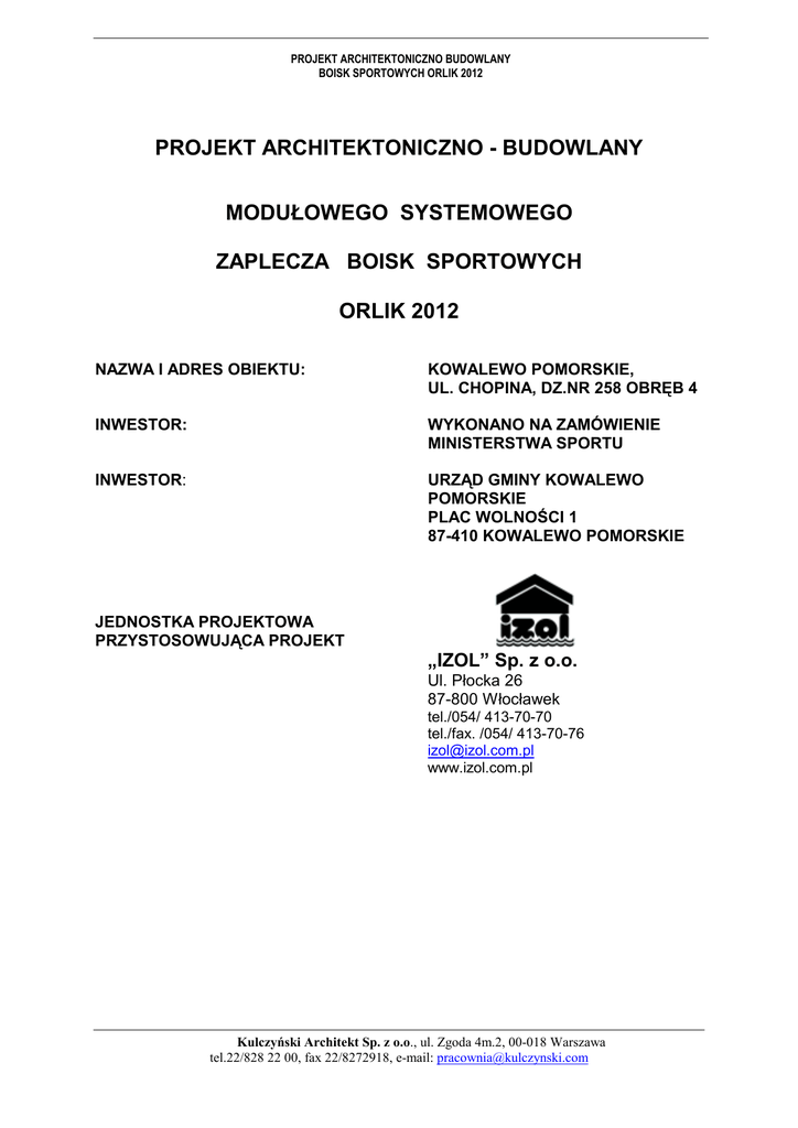 PROJEKT ARCHITEKTONICZNO BUDOWLANY BOISK SPORTOWYCH ORLIK 2012 PROJEKT ARCHITEKTONICZNO - BUDOWLANY MODUŁOWEGO SYSTEMOWEGO ZAPLECZA BOISK SPORTOWYCH ORLIK 2012 NAZWA I ADRES OBIEKTU: KOWALEWO POMORSKIE, UL. CHOPINA, DZ.NR 258 OBRĘB 4 INWESTOR: WYKONANO NA ZAMÓWIENIE MINISTERSTWA SPORTU INWESTOR: URZĄD GMINY KOWALEWO POMORSKIE PLAC WOLNOŚCI 1 87-410 KOWALEWO POMORSKIE JEDNOSTKA PROJEKTOWA PRZYSTOSOWUJĄCA PROJEKT „IZOL” Sp. z o.o. Ul. Płocka 26 87-800 Włocławek tel./054/ 413-70-70 tel./fax. /054/ 413-70-76 [email protected] www.izol.com.pl Kulczyński Architekt Sp. z o.o., ul. Zgoda 4m.2, 00-018 Warszawa tel.22/828 22 00, fax 22/8272918, e-mail: [email protected] PROJEKT ARCHITEKTONICZNO BUDOWLANY BOISK SPORTOWYCH ORLIK 2012 PROJEKT ARCHITEKTONICZNO - BUDOWLANY MODUŁOWEGO SYSTEMOWEGO ZAPLECZA BOISK SPORTOWYCH ORLIK 2012 PROJEKT ARCHITEKTONICZNY - ADAPTACJA Projektant mgr inż. arch. Jerzy Kociołowicz 448/69, KP-0097 Sprawdzający mgr inż. arch. Zbigniew Kawecki GT-8386-5/16/76 Wk, KP-0098 Kulczyński Architekt Sp. z o.o., ul. Zgoda 4m.2, 00-018 Warszawa tel.22/828 22 00, fax 22/8272918, e-mail: [email protected] PROJEKT ARCHITEKTONICZNO BUDOWLANY BOISK SPORTOWYCH ORLIK 2012 CZĘŚĆ OPISOWA PROJEKTU BUDOWLANEGO ARCHITEKTURA 1. PRZEZNACZENIE I PROGRAM UŻYTKOWY OBIEKTU I JEGO CHARAKTERYSTYCZNE PARAMETRY TECHNICZNE Podstawowe parametry techniczne obiektu ZESTAWIENIE DLA CAŁEJ INWESTYCJI WERSJA WYBRANA 68,20 m² 46,56 m² 7,96 m² 190,33 m³ Powierzchnia zabudowy Powierzchnia użytkowa podstawowa Powierzchnia konstrukcji Kubatura Przeznaczenie obiektu i program użytkowy Wersja wybrana 4 + 4 Wersja uniwersalna zestawienia pawilonów, posiadająca poza pomieszczeniem trenera, magazynem, sanitariatami, 2x przebieralnie z łazienkami przeznaczone dla dwóch drużyn na jednym z boisk lub każda szatnia dla innego boiska, od organizacji zajęć zależy sposób ich wykorzystania i podziału na płcie, wersja ta posiada wariant z zadaszeniem – pergolę. Nr. 1 2 3 4 5 6 7 8 Funkcja pomieszczenia Trener Magazyn Łazienka Łazienka Szatnia Szatnia Łazienka Łazienka Rodzaj posadzki Wykładzina kauczukowa R9 Wykładzina kauczukowa R9 Wykładzina kauczukowa R10 Wykładzina kauczukowa R10 Wykładzina kauczukowa R9 Wykładzina kauczukowa R9 Wykładzina kauczukowa R11 Wykładzina kauczukowa R11 RAZEM: Pow. 5,82 m² 5,82 m² 5,82 m² 5,82 m² 5,82 m² 5,82 m² 5,82 m² 5,82 m² 46,56 m² 1.2 Zapotrzebowanie energetyczne i na poszczególne media 1.3 Zapotrzebowanie w wodę – wg opracowania branżowego 1.4 Zapotrzebowanie ciepła – wg opracowania branżowego 1.5. Zapotrzebowanie w energię elektryczną – wg opracowania branżowego 2.FORMA ARCHITEKTONICZNA I FUNKCJA OBIEKTU BUDOWLANEGO, SPOSÓB JEGO DOSTOSOWANIA DO KRAJOBRAZU I OTACZAJĄCEJ ZABUDOWY ORAZ SPOSÓB SPEŁNIENIA WYMAGAŃ, O KTÓRYCH MOWA W ART. 5 UST. 1 USTAWY PRAWO BUDOWLANE 2.1. Forma architektoniczna i sposób dostosowania do krajobrazu i otaczającej zabudowy Forma i funkcja obiektu Budynki projektuje się na bazie uniwersalnego systemu modułowego umożliwiającego wiele zestawień w zależności od potrzeb użytkowników. System oparty jest na prefabrykowanych modułowych elementach drewnianych lub stalowych(moduł 2,55m x 5,20 w rzucie, wysokość 2,70 m. Warianty budynków składają się z modułów , z wyposażeniem szatni łazienek, magazynów oraz pomieszczenia dla trenera a także z elementów dodatkowych takich jak pergole i podesty drewniane lub stalowe. Nowoczesna forma architektoniczna jest atrakcyjna dla młodych użytkowników a także umożliwia zapewnienie komfortu użytkowania. Zastosowano naturalne ekologiczne materiały łatwo wpisujące się w dowolne otoczenie. Budynki projektuje się jako uzupełnienie boisk sportowych przeznaczonych na potrzeby młodzieży uczącej się oraz innych lokalnych społeczności. Służyć ma celom wypoczynku i rekreacji. Zaproponowane rozwiązania elewacji pozwalają na dostosowanie obiektów do lokalnych warunków kulturowych, krajobrazowych oraz regionalnych. Jako podstawowy wybrano kolor piaskowy współgrający z elewacją szkoły. Sposób dostosowania do krajobrazu i otoczenia ( zabudowy) Zaprojektowane warianty obiektów będących zapleczem dla boisk sportowych w pełni wpisują się w istniejące konteksty urbanistyczne miejsca w którym zostaną usytuowane. Projektant nie dopuszcza stosowania innych materiałów wykończeniowych elewacji niż zastosowane w projekcie. W Projekcie uwzględniono zapisy wynikające z projektu Kulczyński Architekt Sp. z o.o., ul. Zgoda 4m.2, 00-018 Warszawa tel.22/828 22 00, fax 22/8272918, e-mail: [email protected] PROJEKT ARCHITEKTONICZNO BUDOWLANY BOISK SPORTOWYCH ORLIK 2012 zagospodarowania terenu , usytuowanie obiektów od granicy działki i budynków sąsiednich zgodne z ROZPORZĄDZENIEM MINISTRA INFRASTRUKTURY z dnia 12 kwietnia 2002r. w sprawie warunków technicznych, jakim powinny odpowiadać budynki i ich usytuowanie Dz. U z 2002r. nr 75 z późn. zm. 2.2. Sposób spełnienia wymagań, o których mowa w art. 5 ust. 1 ustawy prawo budowlane Projektowane obiekty budowlane – modułowe pawilony respektują zasady określone w art. 5 ust. 1 ustawy Prawo budowlane w następujący sposób: 1 wymagania Spełnia wymagania podstawowe dotyczące: bezpieczeństwa konstrukcji bezpieczeństwa pożarowego bezpieczeństwa użytkowania odpowiednich warunków higienicznych i zdrowotnych oraz ochrony środowiska ochrony przed hałasem i drganiami oszczędności energii i odpowiedniej izolacyjności cieplnej przegród; sposób spełnienia Bezpieczeństwo konstrukcji: zastosowane rozwiązania projektowe dotyczące konstrukcji obiektu gwarantują bezpieczeństwo zarówno użytkowników budynku, jak i osób trzecich Bezpieczeństwo pożarowe: na etapie prac projektowych przewidziano problematykę związaną z bezpieczeństwem pożarowym obiektu, - zastosowano materiały termoizolacyjne, niepalne – wełna mineralna - elementy drewniane lub