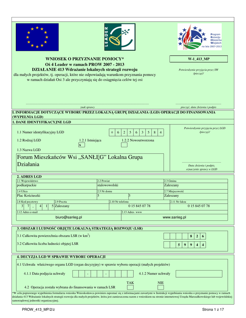 WNIOSEK O PRZYZNANIE POMOCY* Oś 4 Leader w ramach PROW 2007 - 2013 DZIAŁANIE 413 Wdrażanie lokalnych strategii rozwoju W-1_413_MP Potwierdzenie przyjęcia przez SW /pieczęć/ dla małych projektów, tj. operacji, które nie odpowiadają warunkom przyznania pomocy w ramach działań Osi 3 ale przyczyniają się do osiągnięcia celów tej osi .......................................................................................................................................................................... znak sprawy ............................................................... pieczęć, data złożenia i podpis I. INFORMACJE DOTYCZĄCE WYBORU PRZEZ LOKALNĄ GRUPĘ DZIAŁANIA (LGD) OPERACJI DO FINANSOWANIA (WYPEŁNIA LGD) 1. DANE IDENTYFIKACYJNE LGD 1.1 Numer identyfikacyjny LGD 1.2 Rodzaj LGD 0 6 1.2.1 Istniejąca x 2 5 6 3 5 8 Potwierdzenie przyjęcia przez LGD /pieczęć/ 4 1.2.2 Nowoutworzona 1.3 Nazwa LGD Forum Mieszkańców Wsi „SANŁĘG” Lokalna Grupa Działania ...................................................... Data złożenia i podpis, oznaczenie sprawy w LGD 2. ADRES LGD 2.3 Gmina 2.1 Województwo 2.2 Powiat podkarpackie stalowowolski Zaleszany 2.4 Ulica 2.5 Nr domu 2.7 Miejscowość Plac Kościuszki 5 2.8 Kod pocztowy 3 7 - 3 2.10 Nr telefonu 2.9 Poczta 4 1 Zaleszany 5 Zaleszany 2.11 Nr faksu 0 15 845 07 78 0 15 845 07 78 2.12 Adres e-mail 2.13 Adres www [email protected] www.sanleg.pl 3. OBSZAR I LUDNOŚĆ OBJĘTE LOKALNĄ STRATEGIĄ ROZWOJU (LSR) 3.1 Całkowita powierzchnia obszaru LSR (w km2) 3.2 Całkowita liczba ludności objętej LSR 5 9 8 2 6 9 4 4 4. DECYZJA LGD W SPRAWIE WYBORU OPERACJI 4.1 Uchwała właściwego organu LGD (organ decyzyjny) w sprawie wyboru operacji (małych projektów) 4.1.1 Data podjęcia uchwały - 4.1.2 Numer uchwały TAK NIE 4.2 Operacja została wybrana do finansowania w ramach LSR *W celu poprawnego wypełnienia formularza wniosku Wnioskodawca powinien zapoznać się z informacjami zawartymi w Instrukcji wypełniania wniosku o przyznanie pomocy w ramach działania 413 Wdrażanie lokalnych strategii rozwoju dla małych projektów, która jest zamieszczona razem z wnioskiem na stronie internetowej Urzędu Marszałkowskiego lub wojewódzkiej samorządowej jednostki organizacyjnej. PROW_413_MP/2/z Strona 1 z 17 II. IDENTYFIKACJA WNIOSKODAWCY 5. NUMER IDENTYFIKACYJNY 5.2 5.1 6. RODZAJ WNIOSKODAWCY 6.1 Osoba fizyczna 6.2 Osoba fizyczna prowadząca działalność gospodarczą 6.3 Organizacje pozarządowe 6.4 Jednostka organizacyjna związku wyznaniowego i kościoła 6.5 Jednostka samorządu terytorialnego 6.6 Inne podmioty 7. DANE IDENTYFIKACYJNE WNIOSKODAWCY 7.1 Nazwa/Nazwisko 7.7 Numer NIP 7.8 Seria i numer dokumentu tożsamości 7.2 Pierwsze imię 7.3 Drugie imię 7.9 Numer w KRS - 7.4. Obywatelstwo, kod kraju 7.10 REGON 7.5 Płeć: Kobieta - Mężczyzna 7.11 Numer PKD 7.6 PESEL 8. ADRES ZAMIESZKANIA / ADRES DO DORĘCZEŃ LUB ADRES GŁÓWNEGO MIEJSCA WYKONYWANIA DZIAŁALNOŚCI / ADRES SIEDZIBY WNIOSKODAWCY 8.1 Województwo 8.2 Powiat 8.3 Gmina 8.4 Ulica 8.5 Nr domu 8.8 Kod pocztowy 8.9 Poczta 8.6 Nr lokalu 8.10 Nr telefonu 8.7 Miejscowość 8.11 Nr faksu 8.12 Adres e-mail 8.13 Adres www 9. ADRES DO KORESPONDENCJI 9.1 Województwo 9.2 Powiat 9.4 Ulica 9.5 Nr domu 9.8 Kod pocztowy 9.9 Poczta 9.3 Gmina 9.6 Nr lokalu 9.10 Nr telefonu 9.7 Miejscowość 9.11 Nr faksu 9.12 Adres e-mail 9.13 Adres www 10. DANE OSÓB UPOWAŻNIONYCH DO REPREZENTOWANIA WNIOSKODAWCY 10.1.1 Imię 10.1.2 Nazwisko 10.1.3 Stanowisko/Funkcja 10.2.1 Imię 10.2.2 Nazwisko 10.2.3 Stanowisko/Funkcja 10.3.1 Imię 10.3.2 Nazwisko 10.3.3 Stanowisko/Funkcja PROW_413_MP/2/z Strona 2 z 17 11. DANE PEŁNOMOCNIKA WNIOSKODAWCY 11.1 Nazwisko 11.2 Imię 11.3 Stanowisko/Funkcja 11.4 Województwo 11.5 Powiat 11.6 Gmina 11.7 Ulica 11.8 Nr domu 11.11 Kod pocztowy 11.12 Poczta 11.9 Nr lokalu 11.10 Miejscowość 11.13 Nr telefonu 11.14 Nr faksu 11.15 Adres e-mail 12. DANE OSOBY UPRAWNIONEJ DO KONTAKTU 12.1 Nazwisko 12.2 Imię 12.4 Województwo 12.5 Powiat 12.7 Ulica 12.8 Nr domu 12.11 Kod pocztowy 12.12 Poczta 12.3 Stanowisko/Funkcja 12.6 Gmina 12.9 Nr lokalu 12.10 Miejscowość 12.13 Nr telefonu 12.14 Nr faksu 12.15 Adres e-mail III. 13.1 TYTUŁ OPERACJI 13.2 CELE OPERACJI 14. MIEJSCE REALIZACJI OPERACJI 14. Obszar, na którym będzie realizowana operacja 14.1.1 Obszar LSR 14.2.1 Województwo 14.2.4 Miejscowość A B C 14.2.7 Ulica/oznaczenie działki A B C 14.3.1 Województwo 14.3.4 Miejscowość A B C PROW_413_MP/2/z 14.1.2 Obszar poza LSR 14.2.2 Powiat 14.2.3 Gmina 14.2.5 Kod pocztowy - 14.2.6 Poczta 14.2.8 Nr lokalu 14.3.2 Powiat 14.3.3 Gmina 14.3.5 Kod pocztowy - 14.3.6 Poczta Strona 3 z 17 14.3.7 Ulica/oznaczenie działki A B C 14.4.1 Województwo 14.3.8 Nr lokalu 14.4.2 Powiat 14.4.5 Miejscowość A B C 14.4.8 Ulica/oznaczenie działki A B C 14.4.3 Gmina 14.4.6 Kod pocztowy - 14.4.7 Poczta 14.4.9 Nr lokalu 15. ZAKRES OPERACJI Zakres 15.1 Kategoria Koszty kwalifikowalne (w zł) Podnoszenie świadomości społeczności lokalnej, w tym przez: Organizacja szkoleń i innych przedsięwzięć o charakterze edukacyjnym i warsztatowym dla 15.1.1 podmiotów z obszaru objętego LSR, innych niż realizowane w ramach działania "Szkolenia zawodowe dla osób zatrudnionych w rolnictwie i leśnictwie". 15.2 Podnoszenie jakości życia społeczności lokalnej na obszarze objętym LSR, w tym przez: Udostępnianie urządzeń i sprzętu komputerowego, w tym urządzeń i sprzętu umożliwiającego 15.2.1 dostęp do Internetu. 15.2.2 Organizacja imprez kulturalnych, rekreacyjnych lub sportowych. 15.3 Rozwijanie aktywności społeczności lokalnej, w tym przez: Promocję lokalnej twórczości kulturalnej z wykorzystaniem lokalnego dziedzictwa, w tym 15.3.1 kulturowego, historycznego lub przyrodniczego. 15.3.2 Kultywowanie miejscowych tradycji, obrzędów i zwyczajów. 15.3.3 Kultywowanie języka regionalnego i gwary. 15.3.4 Kultywowanie tradycyjnych zawodów i rzemiosła. 15.4 Rozwijanie turystyki 