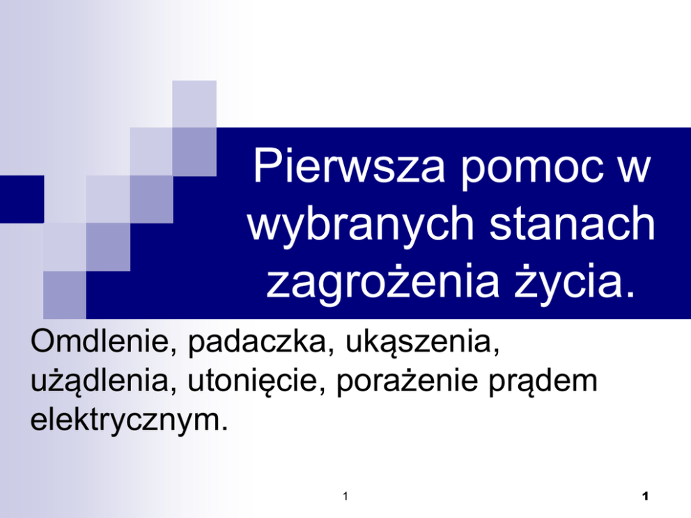 Pierwsza pomoc w wybranych stanach zagrożenia życia. Omdlenie, padaczka, ukąszenia, użądlenia, utonięcie, porażenie prądem elektrycznym. 1 1 NIE REAGUJE Zawołaj pomoc Udrożnij drogi oddechowe BRAK PRAWIDŁOWEGO ODDECHU Zadzwoń pod numer 999 lub 112 30 uciśnięć klatki piersiowej 2 oddechy ratownicze 30 uciśnięć klatki piersiowej OMDLENIE Presyncope- niepełne omdlenie, wystąpienie objawów braku sił, zawrotów głowy lub słabości bez utraty przytomności lub stan bezpośrednio ją poprzedzający. Syncope - to przemijająca utrata świadomości, po której chory samoistnie odzyskuje świadomość. 1 3 ZAPOBIEGANIE OMDLENIU 1 4 OMDLENIE - POSTĘPOWANIE Ułożyć chorego płasko, Unieść kończyny powyżej poziomu klatki piersiowej, Rozpiąć kołnierzyk, Przewietrzyć pomieszczenie. 1 5 PADACZKA Padaczka jest to zespół kliniczny, w którym u pacjentów występują nawracające napady padaczkowe. Dotyczą ok. 1-2% populacji 1 6 KLASYFIKACJA OBJAWÓW NAPADY UOGÓLNIONE napady nieświadomości (małe, petit mal), napady duże (drgawkowe, grandmal): kloniczno- toniczne, toniczne, miokloniczne, atoniczne. 1 7 KLASYFIKACJA OBJAWÓW NAPADY CZĘŚCIOWE proste (z objawami ruchowymi, czuciowymi, autonomicznymi, psychicznymi), wtórnie uogólniające, złożone, 1 8 KLASYFIKACJA OBJAWÓW PADACZKOWY- ciągła aktywność napadowa trwająca dłużej niż 5 minut lub co najmniej dwa napady między którymi nie następuje pełne wycofanie zaburzeń. STAN 1 9 POSTĘPOWANIE Bądź przy chorym w czasie wystąpienia napadu pilnując, aby nie doznał obrażeń. Gdy chory upadnie, delikatnie podtrzymuj głowę aby nie doszło do mechanicznych urazów. Ułóż chorego na boku pilnując aby miał drożne drogi oddechowe. Poluzuj kołnierzyk, rozepnij guziki. 1 10 POSTĘPOWANIE Ślina i piana na ustach, często zabarwiona krwią jest normalnym objawem napadu padaczkowego. Powinna mieć drogę odpływu - ułożenie na boku. Poczekaj, aż skończy się napad - będzie on trwał zazwyczaj kilka minut, po napadzie chory może stracić kontakt z otoczeniem, może zasnąć. Gdy odzyska przytomność zapytaj jak można mu pomóc, kogo zawiadomić. 11 1 POSTĘPOWANIE Gdy napady powtarzają się (dwa i więcej), a chory nie odzyskuje świadomości wezwij karetkę. Może to być stan padaczkowy, który zawsze wymaga interwencji lekarza, podania leków. 1 12 BŁĘDY W POSTĘPOWANIU Gdy zapewniłeś odpowiednią pozycję po prostu bądź przy chorym. Nie przenoś go, nie podnoś, nie próbuj „cucić” polewając go wodą czy bijąc w policzek. Nie wolno niczego wkładać do ust. Rozwieranie jamy ustnej może spowodować uraz. 1 13 BŁĘDY W POSTĘPOWANIU początku dużego napadu chory może nie oddychać przez 20-30 sekund, nie stosuj wtedy sztucznego oddychania. Na 1 14 BŁĘDY W POSTĘPOWANIU Nie używaj siły wobec chorego. Ma on zawężoną świadomość i może źle zrozumieć intencje i reagować agresją. Po napadzie chory może być pobudzony. Łagodnie go uspokajaj nie używając siły. Staraj się unikać robienie sensacji wokół chorego. 1 15 UKĄSZENIA - OBJAWY Miejscowe: Ślady Silny po ukąszeniu, z których sączy się krew, ból, Zdrętwienie, Miejscowy obrzęk, 1 16 UKĄSZENIA - OBJAWY Ogólnoustrojowe: Wstrząs, Spadek Zespół BP, ciasnoty przedziałów powięziowych, Przesunięcie płynów, 1 17 UKĄSZENIA - OBJAWY Hemoliza, Zaburzenia krzepnięcia, Wybroczyny Obrzęk i krwawienia, płuc, Neurotoksyczność. 1 18 POSTĘPOWANIE PRZY UKĄSZENIU Szybki transport do szpitala, Ograniczenie ruchów ofiary, Unieruchomienie ukąszonej kończyny, Niższe ułożenie ukąszonej kończyny, Zastosowanie opaski uciskowej. 1 19 UŻĄDLENIA - OBJAWY Nagły ostry ból, Odczyn zapalny. Skóra wokół użądlenia jest blada, a otaczający obszar - czerwony i spuchnięty, Swędzenie, Pozostawienie żądła. 1 20 UŻĄDLENIA - POWIKŁANIA Infekcja bakteryjna. Trudności w oddychaniu i połykaniu, jeśli użądlenie miało miejsce w obrębie ust. 1 21 UŻĄDLENIA - POWIKŁANIA Wstrząs anafilaktyczny, Jeśli chory we wstrząsie nie otrzyma natychmiastowej pomocy, stanowi to zagrożenia dla jego życia. 1 22 UŻĄDLENIA - POSTĘPOWANIE Delikatnie oczyść ranę wodą z mydłem. Zastosuj zimny okład, aby opanować ból i obrzęk. W razie wstrząsu lub wielokrotnego użądlenia bądź użądlenia w usta wezwij pomoc lub zawieź poszkodowanego na ostry dyżur do najbliższego szpitala. 1 23 POSTĘPOWANIE W przypadku użądlenia w usta ssij kostkę lodu w drodze do szpitala, aby zmniejszyć obrzęk. Jeśli czujesz się dobrze po pojedynczym użądleniu, możesz się leczyć w domu. Zastosuj lek przeciwhistaminowy w postaci kremu. 1 24 POSTĘPOWANIE W razie użądlenia przez pszczołę: Usuń żądło paznokciem, nożem lub wysterylizowaną igłą. Nie próbuj wyjmować żądła palcami lub pęsetką, gdyż spowoduje to wyciśnięcie większej ilości jadu do skóry (wbite w skórę żądło przez jakiś czas jeszcze wydziela jad). Zastosuj roztwór o słabym odczynie zasadowym (np. sodę oczyszczoną) do zobojętnienia kwaśnego jadu pszczoły. 1 25 POSTĘPOWANIE W razie użądlenia przez osę Zastosuj roztwór o słabym odczynie kwaśnym (np. ocet lub sok cytrynowy) do zobojętnienia zasadowego jadu osy. 1 26 UTONIĘCIA - opadnięcie na dno martwego ciała. Utopienie Przyczynami utopienia mogą być: atak serca, wrzucenie zwłok do wody lub inne przypadki, w których ofiara nie ma zalanych dróg oddechowych wodą. 1 27 UTONIĘCIE A PODTOPIENIE Utonięcie to uduszenie skutkiem zanurzenia w najczęściej w wodzie. będące cieczy, nazywa się wszystkie przypadki przeżycia po duszeniu się w wyniku zanurzenia w wodzie. Podtopieniem 1 28 Zespół popodtopieniowy może rozwinąć się u ofiar podtopienia w czasie pierwszych 72 godzin po wypadku. Schorzenie to ma charakter zespołu niewydolności oddechowej typu dorosłych (ARDS - Acute Respiratory Distress Syndrome) i jest spowodowane wypłukaniem surfaktan