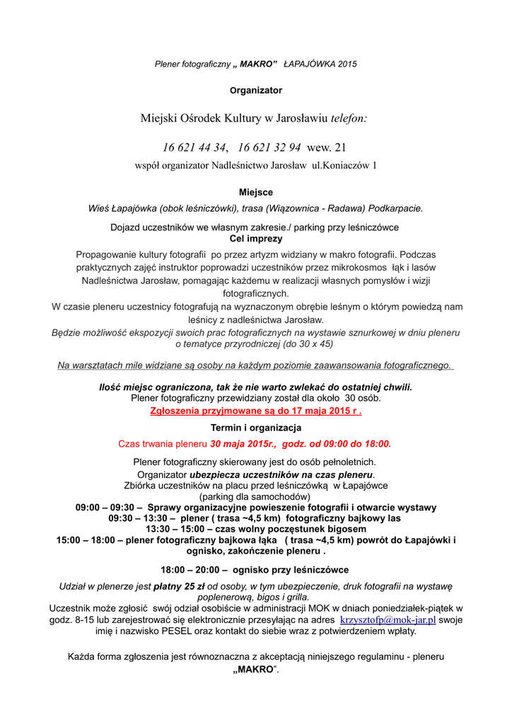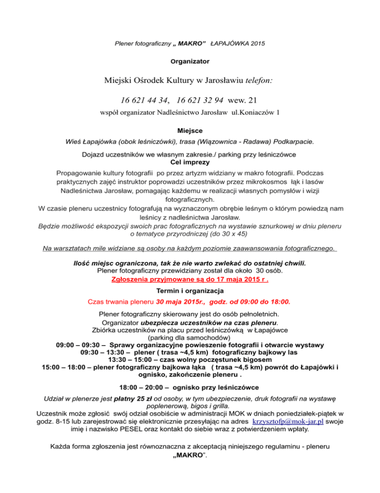 Plener fotograficzny „ MAKRO” ŁAPAJÓWKA 2015 Organizator Miejski Ośrodek Kultury w Jarosławiu telefon: 16 621 44 34, 16 621 32 94 wew. 21 współ organizator Nadleśnictwo Jarosław ul.Koniaczów 1 Miejsce Wieś Łapajówka (obok leśniczówki), trasa (Wiązownica - Radawa) Podkarpacie. Dojazd uczestników we własnym zakresie./ parking przy leśniczówce Cel imprezy Propagowanie kultury fotografii po przez artyzm widziany w makro fotografii. Podczas praktycznych zajęć instruktor poprowadzi uczestników przez mikrokosmos łąk i lasów Nadleśnictwa Jarosław, pomagając każdemu w realizacji własnych pomysłów i wizji fotograficznych. W czasie pleneru uczestnicy fotografują na wyznaczonym obrębie leśnym o którym powiedzą nam leśnicy z nadleśnictwa Jarosław. Będzie możliwość ekspozycji swoich prac fotograficznych na wystawie sznurkowej w dniu pleneru o tematyce przyrodniczej (do 30 x 45) Na warsztatach mile widziane są osoby na każdym poziomie zaawansowania fotograficznego. Ilość miejsc ograniczona, tak że nie warto zwlekać do ostatniej chwili. Plener fotograficzny przewidziany został dla około 30 osób. Zgłoszenia przyjmowane są do 17 maja 2015 r . Termin i organizacja Czas trwania pleneru 30 maja 2015r., godz. od 09:00 do 18:00. Plener fotograficzny skierowany jest do osób pełnoletnich. Organizator ubezpiecza uczestników na czas pleneru. Zbiórka uczestników na placu przed leśniczówką w Łapajówce (parking dla samochodów) 09:00 – 09:30 – Sprawy organizacyjne powieszenie fotografii i otwarcie wystawy 09:30 – 13:30 – plener ( trasa ~4,5 km) fotograficzny bajkowy las 13:30 – 15:00 – czas wolny poczęstunek bigosem 15:00 – 18:00 – plener fotograficzny bajkowa łąka ( trasa ~4,5 km) powrót do Łapajówki i ognisko, zakończenie pleneru . 18:00 – 20:00 – ognisko przy leśniczówce Udział w plenerze jest płatny 25 zł od osoby, w tym ubezpieczenie, druk fotografii na wystawę poplenerową, bigos i grilla. Uczestnik może zgłosić swój odział osobiście w administracji MOK w dniach poniedziałek-piątek w godz. 8-15 lub zarejestrować się elektronicznie przesyłając na adres [email protected] swoje imię i nazwisko PESEL oraz kontakt do siebie wraz z potwierdzeniem wpłaty. Każda forma zgłoszenia jest równoznaczna z akceptacją niniejszego regulaminu - pleneru „MAKRO”. MIEJSKI OŚRODEK KULTURY W JAROSŁAWIU ul. Pl . Mickiewicza 6 PODKARPACKI BANK SPÓŁDZIELCZY ODDZIAŁ W JAROSŁAWIU 56 8642 1155 2015 1506 55 19 0001 wpłacamy 25 zł PLN z dopiskiem plener Zgoda na niekomercyjnie wykorzystanie fotografii Każdy uczestnik pleneru fotograficznego zobowiązuję się do udostępnienia organizatorowi fotografii nie odpłatnie w formie plików jpg lub Tif do 5 mb i formatu 30cm X 45cm w ilości 3 szt. wykonanych w trakcie wydarzenia w celu wystawy poplenerowej. W MOK Jarosław i Nadleśnictwie Jarosław. Uczestnik podpisując Regulamin akceptuje warunki regulaminu i oświadcza, że wszystkie przekazane fotografie są jego własnością i nie naruszają praw osób trzecich, ani nie są obciążone żadnymi roszczeniami. Powyższe fotografie udostępniane są Organizatorom w celu reklamy i promocji. Postanowienia końcowe *zastrzegamy sobie zmiany w programie w przypadku złych warunków atmosferycznych i na wniosek uczestników. Co warto mieć w plecaku • aparaty rożnych typów i obiektywy (mile widziane adaptery M42 wraz z kultowymi stałkami) • karta pamięci, baterie naładowane oraz statyw, • makro - konwertery, blenda, lampy błyskowe • laptop z zainstalowanym programem graficznym (najlepiej Adobe Photoshop) • buty trekkingowe, gumowce • ciepłe, nieprzemakalne ubrania, • dodatkowe kalorie • dużą dawkę dobrego humoru W sprawach nieuregulowanych niniejszym Regulaminem zastosowanie mają odpowiednie przepisy Kodeksu Cywilnego Uczestnik wyraża zgodę na przetwarzanie danych osobowych i wizualnych zgodnie z ustawą z dnia 29.08.1997 r. o ochronie danych osobowych (Dz. U. Nr 133, poz. 883 z późniejszymi zmianami) na potrzeby pleneru makro. Osoba do kontaktów w sprawie pleneru Krzysztof Peszko 16 621 44 34, 16 621 32 94 , w 21 podpis czytelny potwierdzenie wpłaty …........................................................... …..................................................................