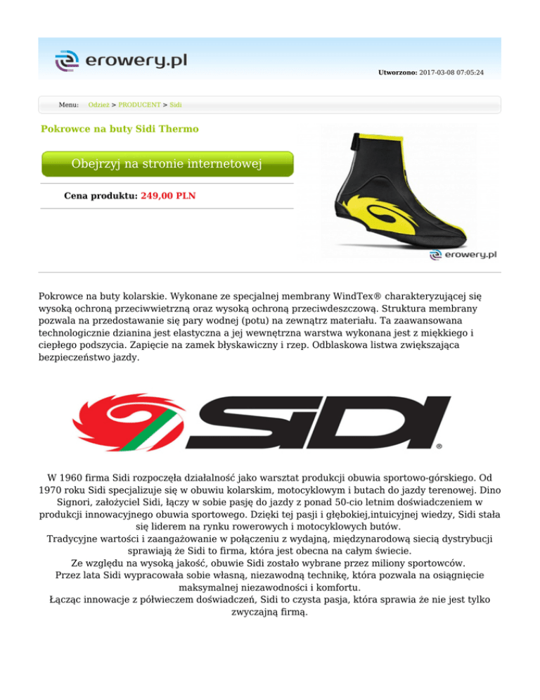 Utworzono: 2017-03-08 07:05:24 Menu: Odzież > PRODUCENT > Sidi Pokrowce na buty Sidi Thermo Obejrzyj na stronie internetowej Cena produktu: 249,00 PLN Pokrowce na buty kolarskie. Wykonane ze specjalnej membrany WindTex® charakteryzującej się wysoką ochroną przeciwwietrzną oraz wysoką ochroną przeciwdeszczową. Struktura membrany pozwala na przedostawanie się pary wodnej (potu) na zewnątrz materiału. Ta zaawansowana technologicznie dzianina jest elastyczna a jej wewnętrzna warstwa wykonana jest z miękkiego i ciepłego podszycia. Zapięcie na zamek błyskawiczny i rzep. Odblaskowa listwa zwiększająca bezpieczeństwo jazdy. W 1960 firma Sidi rozpoczęła działalność jako warsztat produkcji obuwia sportowo-górskiego. Od 1970 roku Sidi specjalizuje się w obuwiu kolarskim, motocyklowym i butach do jazdy terenowej. Dino Signori, założyciel Sidi, łączy w sobie pasję do jazdy z ponad 50-cio letnim doświadczeniem w produkcji innowacyjnego obuwia sportowego. Dzięki tej pasji i głębokiej,intuicyjnej wiedzy, Sidi stała się liderem na rynku rowerowych i motocyklowych butów. Tradycyjne wartości i zaangażowanie w połączeniu z wydajną, międzynarodową siecią dystrybucji sprawiają że Sidi to firma, która jest obecna na całym świecie. Ze względu na wysoką jakość, obuwie Sidi zostało wybrane przez miliony sportowców. Przez lata Sidi wypracowała sobie własną, niezawodną technikę, która pozwala na osiągnięcie maksymalnej niezawodności i komfortu. Łącząc innowacje z półwieczem doświadczeń, Sidi to czysta pasja, która sprawia że nie jest tylko zwyczajną firmą. Kolor Żółty_#FFFF00 Mimo dołożenia wszelkich starań nie gwarantujemy, że publikowane opisy i specyfikacje techniczne niezawierają uchybień lub błędów, które nie mogą jednak być podstawą do roszczeń. W przypadku jakichkolwiek wątpliwości, przed podjęciem decyzji prosimy o kontakt. Adres: www.erowery.pl Telefon: 605 515 185, 34 361 16 71 Email: [email protected]