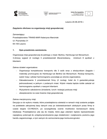 Leszno 20.06.2016 r. Zapytanie ofertowe na organizację misji gospodarczej Zamawiający: Przedsiębiorstwo TRANS-MAR Katarzyna Marciniak Ul. Poznańska 31 64-100 Leszno 1. Opis przedmiotu zamówienia. Organizacja misji gospodarczej do jednego z miast: Berlina, Hamburga lub Monachium. 3-dniowy wyjazd (2 noclegi) 3 przedstawicieli Zleceniodawcy, minimum 8 spotkań z klientami. Zakres działań organizatora: Organizacja kompleksowa transportu dla 3 osób wraz z ekwipunkiem (bagaże i materiały promocyjne) do Hamburga lub Berlina lub Monachium. Rodzaj transportu, wybór trasy i pilotaż harmonogramu pozostaje po stronie organizatora. Zakwaterowanie 3 przedstawicieli firmy (2 noclegi, hotel do 3 gwiazdek,pokoje jednoosobowe) w jednym z podanych miast. Wybór miasta będzie ściśle zależał od harmonogramu spotkań z naszymi klientami. Wyżywienie całodzienne (śniadanie, lunch i kolacja) podczas misji ubezpieczenie na czas trwania misji gospodarczej Zakres merytoryczny misji: Decyzja co do wyboru miasta, które przedsiębiorca odwiedzi w ramach misji zostanie podjęta na podstawie zakupionej bazy danych oraz po doświadczeniach zdobytych przez firmę w czasie targów CO-REACH, po szczegółowej ocenie możliwości biznesowych danej lokalizacji. Przedsiębiorca uda się do miasta, które jego zdaniem będzie reprezentowało największy potencjał do umiędzynarodowienia jego działalności i zwiększeniu poziomu jego handlu zagranicznego, a tym samym do wzmocnienia jego konkurencyjności. 1 Termin realizacji: 01.07-31.08.2016 Dokładny wybór terminu będzie możliwy do uzgodnienia po targach CO-REACH Dodatkowe informacje: Zakup jest realizowany w ramach projektu pn. „Wdrożenie Planu Rozwoju Eksportu przez Przedsiębiorstwo TRANS-MAR Katarzyna Marciniak””, dofinansowanego ze środków Unii Europejskiej w ramach Europejskiego Funduszu Rozwoju Regionalnego w ramach Wielkopolskiego Regionalnego Programu Operacyjnego na lata 2014-2020, Oś priorytetowa 1: Innowacyjna i konkurencyjna gospodarka, Działanie 1.4. Internacjonalizacja gospodarki regionalnej, Poddziałanie 1.4.1. Kompleksowe wsparcie rozwoju działalności przedsiębiorstw na rynkach zagranicznych dla przedsiębiorstw posiadających plan rozwoju eksportu 2. Kryteria oceny ofert i opis sposobu ich obliczenia Zamawiający dokona oceny ofert na podstawie następujących kryteriów oceny ofert: Lp . 1. Znaczenie Nazwa kryterium kryterium Cena Liczba możliwych (w do uzyskania %) punktów 100% 100 punktów Zamawiający dokona oceny ofert przyznając punkty w ramach powyższego kryterium, przyjmując zasadę, że 1% = 1 punkt. Punkty za kryterium „Cena” zostaną obliczone według wzoru: Cn P1 = ----------- x 100 Cbo gdzie: P1 – punkty za kryterium cenowe Cn – najniższa cena ofertowa brutto spośród badanych ofert 2 Cbo – cena brutto badanej oferty. Ilość punktów w tym kryterium zostanie obliczona z dokładnością do dwóch miejsc po przecinku. 4. Miejsce i termin zgłoszenia oferty. Oferty należy złożyć drogą mailową, w formie pisemnej, na adres: [email protected] lub w siedzibie firmy w formie pisemnej w terminie do dnia 04.07.2016 r. Do kontaktów upoważniony jest Artur Marciniak – 507 186 944 5. Informacje na temat zakresu wykluczenia W celu uniknięcia konfliktu interesów, zamówienie nie może być udzielone podmiotom powiązanym z Zamawiającym osobowo lub kapitałowo. Przez powiązania kapitałowe lub osobowe rozumie się wzajemne powiązania między Zamawiającym lub osobami upoważnionymi do zaciągania zobowiązań w imieniu Zamawiającego lub osobami wykonującymi w imieniu Z czynności związane z przygotowaniem i przeprowadzeniem procedury wyboru wykonawcy a wykonawcą, polegające w szczególności na: a) uczestniczeniu w spółce jako wspólnik spółki cywilnej lub spółki osobowej, b) posiadaniu co najmniej 10% udziałów lub akcji, c) pełnieniu funkcji członka organu nadzorczego lub zarządzającego, prokurenta, pełnomocnika, d) pozostawaniu w związku małżeńskim, w stosunku pokrewieństwa lub powinowactwa w linii prostej, pokrewieństwa lub powinowactwa w linii bocznej do drugiego stopnia lub w stosunku przysposobienia, opieki lub kurateli, e) pozostawaniu z wykonawcą w takim stosunku prawnym lub faktycznym, że może to budzić uzasadnione wątpliwości co do bezstronności tych osób. 6. Dokumenty składające się na ofertę. Do oferty Wykonawca zobowiązany jest dołączyć formularz ofertowy – zgodnie ze wzorem stanowiącym załącznik nr 1 do zapytania ofertowego. 3