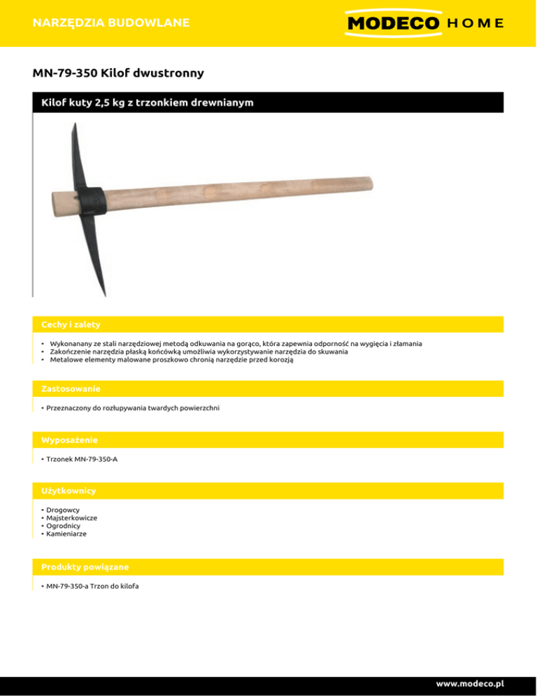 NARZĘDZIA BUDOWLANE MN-79-350 Kilof dwustronny Kilof kuty 2,5 kg z trzonkiem drewnianym Cechy i zalety • Wykonanany ze stali narzędziowej metodą odkuwania na gorąco, która zapewnia odporność na wygięcia i złamania • Zakończenie narzędzia płaską końcówką umożliwia wykorzystywanie narzędzia do skuwania • Metalowe elementy malowane proszkowo chronią narzędzie przed korozją Zastosowanie • Przeznaczony do rozłupywania twardych powierzchni Wyposażenie • Trzonek MN-79-350-A Użytkownicy • Drogowcy • Majsterkowicze • Ogrodnicy • Kamieniarze Produkty powiązane • MN-79-350-a Trzon do kilofa www.modeco.pl NARZĘDZIA BUDOWLANE Dane techniczne Indeks MN-79-350 Waga Opakowanie jed nostkowe Opakowanie zbiorcze Waga opakowa nia jednostkowe go Waga opakowa nia zbiorczego [kg] [szt] [szt] [kg] [kg] 2.5 1 5 3.6 18.1 EAN 5906757133785 Ostrzeżenia • • • • Zawsze używaj ubrań ochronnych (kombinezon, ogrodniczki, kurtka) Zawsze używaj ochrony oczu (okulary, gogle lub przyłbice ochronne) Zawsze używaj ochrony rąk (rękawice) Zawsze używaj ochrony nóg (buty robocze) www.modeco.pl